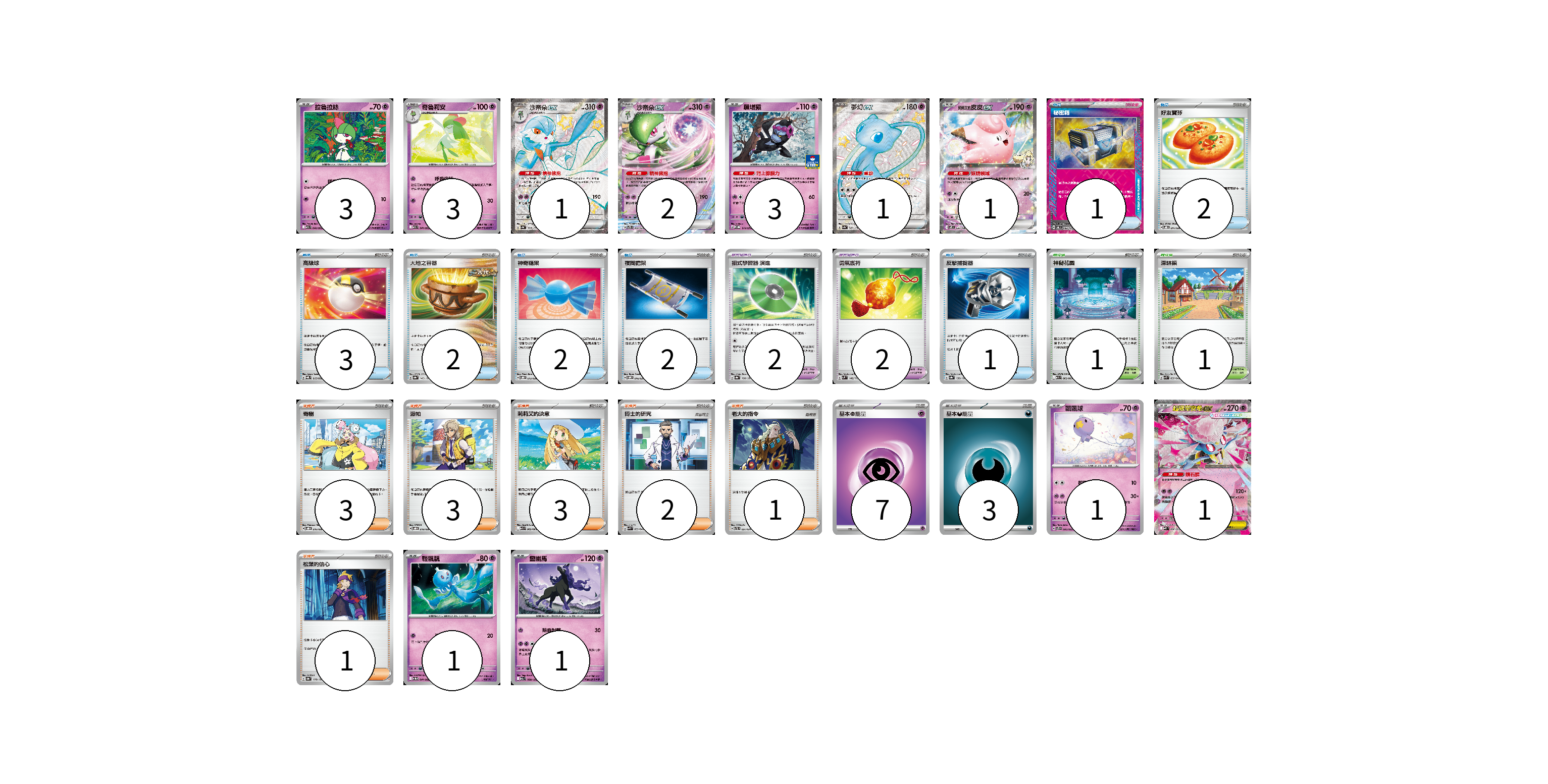 牌組構築方案 以此牌組為基礎新構築牌組 顯示卡面 顯示列表 寶可夢卡(18) 3 3 1 2 3 1 1 1 1 1 1 寶可夢道具(4) 2 2 物品卡(13) 1 2 3 2 2 2 1 支援者卡(13) 3 3 3 2 1 1 競技場卡(2) 1 1 能量卡(10) 7 3 寶可夢卡(18) 卡牌名稱 張數 卡牌名稱 張數 拉魯拉絲 M1S 040/063 03 奇魯莉安 M1S 041/063 03 沙奈朵ex SV4a 328/190 01 沙奈朵ex SVTS 004/022 02 願增猿 M-P 014/M-P 03 夢幻ex SV4a 327/190 01 莉莉艾的皮皮ex SV9 033/100 01 飄飄球 SVTS 005/022 01 超級蒂安希ex MBD 006/022 01 輕飄飄 SV11W 041/086 01 靈幽馬 M2a 080/193 01 寶可夢道具(4) 卡牌名稱 張數 卡牌名稱 張數 招式學習器 演進 SV8a 160/187 02 勇氣護符 SVM 142/175 02 物品卡(13) 卡牌名稱 張數 卡牌名稱 張數 秘密箱 SV6 092/101 01 好友寶芬 SVOD 011/020 02 高級球 SVQL 015/022 03 大地之容器 SV8a 143/187 02 神奇糖果 SVOD 013/020 02 夜間擔架 SVOM 016/021 02 反擊捕捉器 SV8a 139/187 01 支援者卡(13) 卡牌名稱 張數 卡牌名稱 張數 奇樹 SVOD 016/020 03 派帕 SVOD 018/020 03 莉莉艾的決意 M1L 062/063 03 博士的研究 SVK 033/042 02 老大的指令 SVTL 021/021 01 松葉的信心 SV8a 178/187 01 競技場卡(2) 卡牌名稱 張數 卡牌名稱 張數 神秘花園 M1S 063/063 01 深缽鎮 SVK 039/042 01 能量卡(10) 卡牌名稱 張數 卡牌名稱 張數 基本超能量 sv-p PSY 07 基本惡能量 sv-p DAR 03 以此牌組為基礎新構築牌組 牌組編碼 LgZZCA-ZGevQT-TEZVri copy 列印牌組單 牌組編碼已複製 分享至SNS