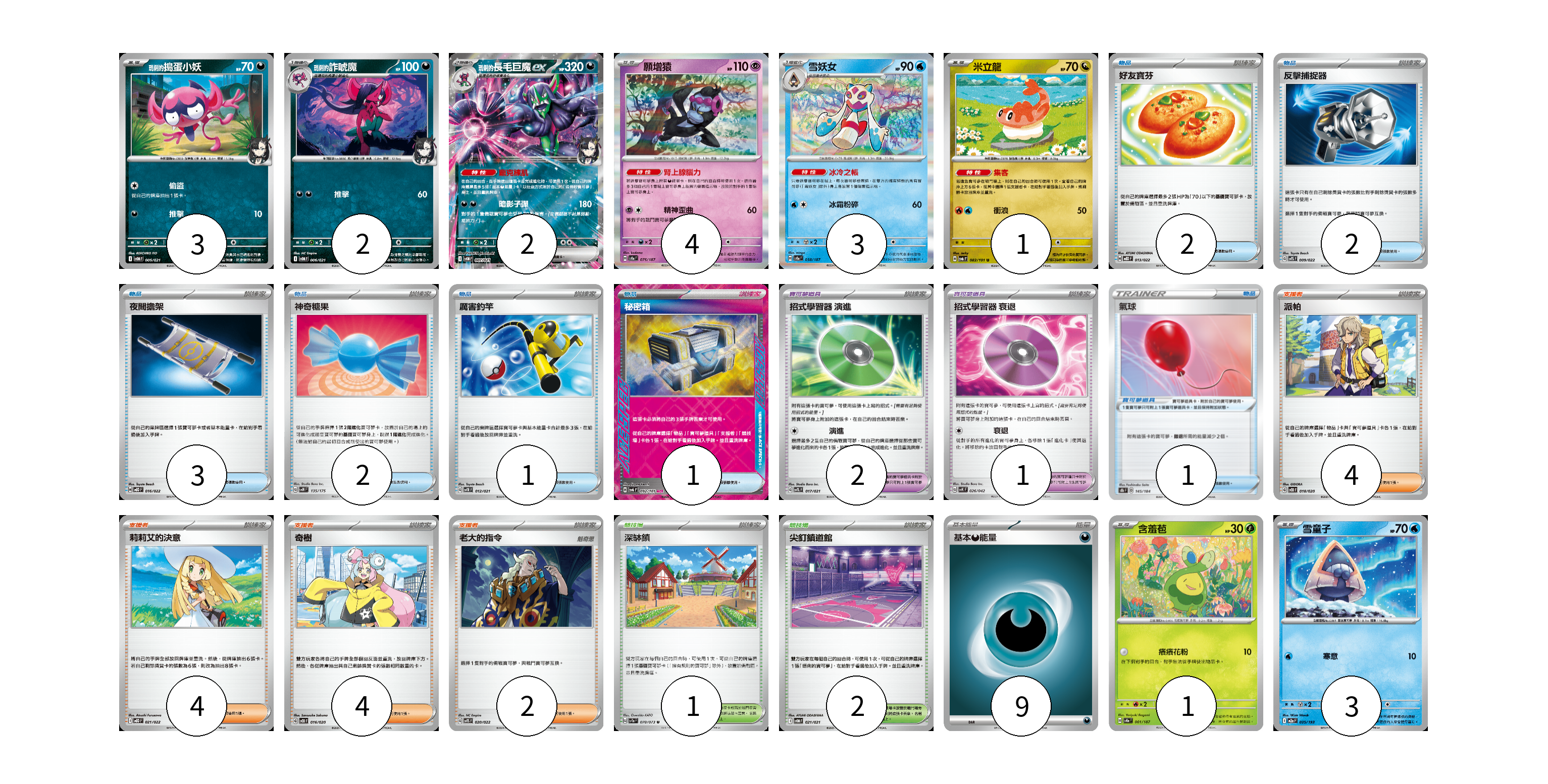 牌組構築方案 以此牌組為基礎新構築牌組 顯示卡面 顯示列表 寶可夢卡(19) 3 2 2 4 3 1 1 3 寶可夢道具(4) 2 1 1 物品卡(11) 2 2 3 2 1 1 支援者卡(14) 4 4 4 2 競技場卡(3) 1 2 能量卡(9) 9 寶可夢卡(19) 卡牌名稱 張數 卡牌名稱 張數 <瑪俐的>搗蛋小妖 SVOM 005/021 03 <瑪俐的>詐唬魔 SVOM 006/021 02 <瑪俐的>長毛巨魔ex SVOM 007/021 02 願增猿 SV8a 075/187 04 雪妖女 SV8a 038/187 03 米立龍 SV6 082/101 01 含羞苞 SV8a 001/187 01 雪童子 M2a 035/193 03 寶可夢道具(4) 卡牌名稱 張數 卡牌名稱 張數 招式學習器 演進 SVTL 017/021 02 招式學習器 衰退 SVK 026/042 01 氣球 S8b 145/184 01 物品卡(11) 卡牌名稱 張數 卡牌名稱 張數 好友寶芬 MBD 013/022 02 反擊捕捉器 SVTS 009/022 02 夜間擔架 MBD 016/022 03 神奇糖果 SVM 135/175 02 厲害釣竿 SVTR 012/021 01 秘密箱 SV6 092/101 01 支援者卡(14) 卡牌名稱 張數 卡牌名稱 張數 派帕 SVOD 018/020 04 莉莉艾的決意 MBD 021/022 04 奇樹 SVOD 016/020 04 老大的指令 SVTS 020/022 02 競技場卡(3) 卡牌名稱 張數 卡牌名稱 張數 深缽鎮 SV1a 070/073 01 尖釘鎮道館 SVOM 021/021 02 能量卡(9) 卡牌名稱 張數 卡牌名稱 張數 基本【惡】能量 SVF DAR 09 以此牌組為基礎新構築牌組 牌組編碼 LmZtsP-TuuuwB-sqsYLV copy 列印牌組單 牌組編碼已複製 分享至SNS