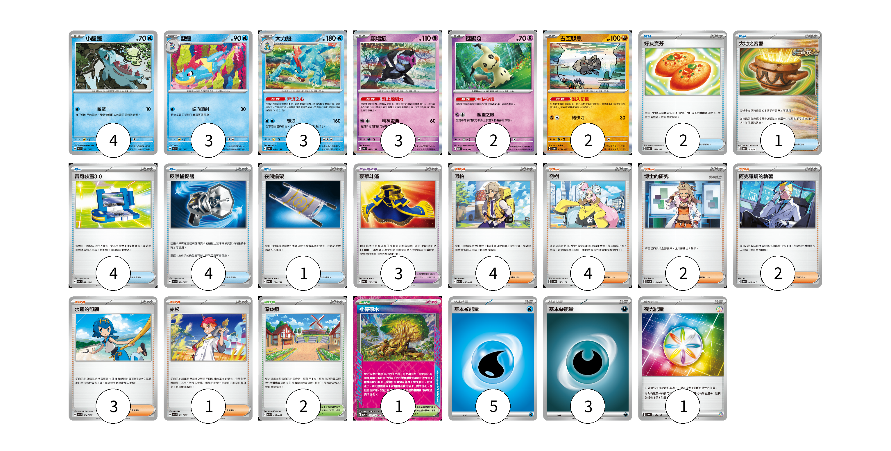 牌組構築方案 以此牌組為基礎新構築牌組 顯示卡面 顯示列表 寶可夢卡(17) 4 3 3 3 2 2 寶可夢道具(3) 3 物品卡(12) 2 1 4 4 1 支援者卡(16) 4 4 2 2 3 1 競技場卡(3) 2 1 能量卡(9) 5 3 1 寶可夢卡(17) 卡牌名稱 張數 卡牌名稱 張數 小鋸鱷 SV8a 032/187 04 藍鱷 SV8a 033/187 03 大力鱷 SV8a 034/187 03 願增猿 SV8a 075/187 03 謎擬Q SVTS 006/022 02 古空棘魚 SV8a 079/187 02 寶可夢道具(3) 卡牌名稱 張數 卡牌名稱 張數 豪華斗篷 SV8a 155/187 03 物品卡(12) 卡牌名稱 張數 卡牌名稱 張數 好友寶芬 SV8a 147/187 02 大地之容器 SV8a 143/187 01 寶可裝置3.0 SVK 021/042 04 反擊捕捉器 SV8a 139/187 04 夜間擔架 SV8a 151/187 01 支援者卡(16) 卡牌名稱 張數 卡牌名稱 張數 派帕 SVK 035/042 04 奇樹 SVM 160/175 04 博士的研究 SVK 032/042 02 阿克羅瑪的執著 SV8a 164/187 02 水蓮的照顧 SV8a 168/187 03 赤松 SV8a 163/187 01 競技場卡(3) 卡牌名稱 張數 卡牌名稱 張數 深缽鎮 SVK 039/042 02 壯偉碩木 SV7 101/102 01 能量卡(9) 卡牌名稱 張數 卡牌名稱 張數 基本【水】能量 SVF WAT 05 基本【惡】能量 SVD DAR 03 夜光能量 SV4a 190/190 01 以此牌組為基礎新構築牌組 牌組編碼 LoulaS-AIzrAQ-IdpHwK copy 列印牌組單 牌組編碼已複製 分享至SNS