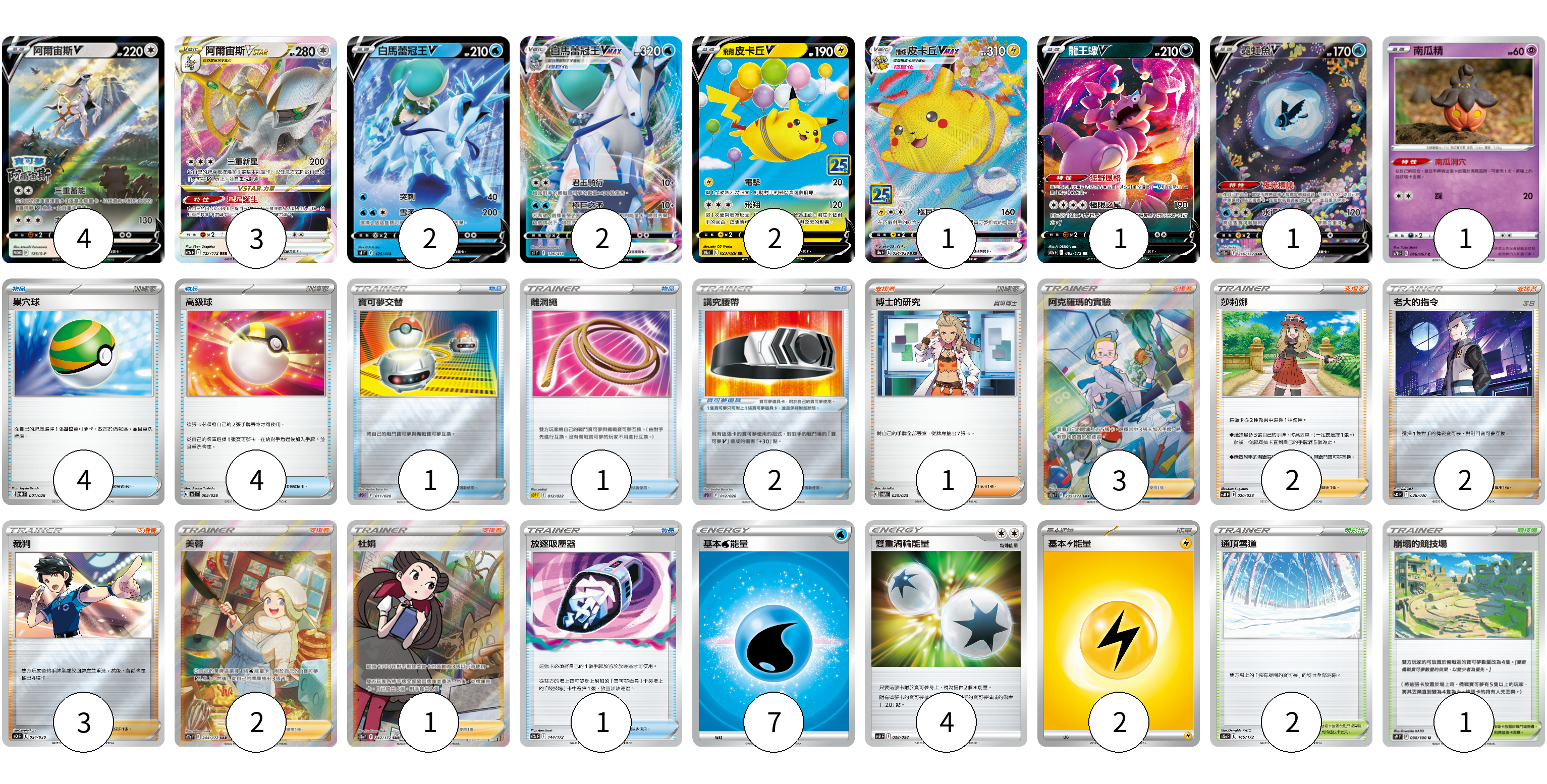 牌組構築方案 以此牌組為基礎新構築牌組 顯示卡面 顯示列表 寶可夢卡(17) 4 3 2 2 2 1 1 1 1 寶可夢道具(2) 2 物品卡(11) 4 4 1 1 1 支援者卡(14) 1 3 2 2 3 2 1 競技場卡(3) 2 1 能量卡(13) 7 4 2 寶可夢卡(17) 卡牌名稱 張數 卡牌名稱 張數 阿爾宙斯V S-P 125/S-P 04 阿爾宙斯VSTAR S12a 127/172 03 白馬蕾冠王V SI 125/414 02 白馬蕾冠王VMAX SI 126/414 02 飛翔皮卡丘V S8a 023/028 02 飛翔皮卡丘VMAX S8a 024/028 01 龍王蠍V S12a 085/172 01 霓虹魚V S12a 216/172 01 南瓜精 S7D 016/067 01 寶可夢道具(2) 卡牌名稱 張數 卡牌名稱 張數 講究腰帶 SPD 012/020 02 物品卡(11) 卡牌名稱 張數 卡牌名稱 張數 巢穴球 SVB 001/028 04 高級球 SVB 002/028 04 寶可夢交替 SPD 011/020 01 離洞繩 SDP 012/022 01 放逐吸塵器 S12a 144/172 01 支援者卡(14) 卡牌名稱 張數 卡牌名稱 張數 博士的研究(奧琳博士) SVAM 023/023 01 阿克羅瑪的實驗 S12a 235/172 03 莎莉娜 SVB 020/028 02 老大的指令(赤日) SO 028/030 02 裁判 SO 024/030 03 美蓉 S12a 244/172 02 杜娟 S12a 242/172 01 競技場卡(3) 卡牌名稱 張數 卡牌名稱 張數 通頂雪道 S12a 165/172 02 崩塌的競技場 S9 098/100 01 能量卡(13) 卡牌名稱 張數 卡牌名稱 張數 基本【水】能量 SI WAT 07 雙重渦輪能量 SVB 028/028 04 基本【雷】能量 SVB LIG 02 以此牌組為基礎新構築牌組 牌組編碼 LqUvje-VdPSsJ-mgzXNI copy 列印牌組單 牌組編碼已複製 分享至SNS