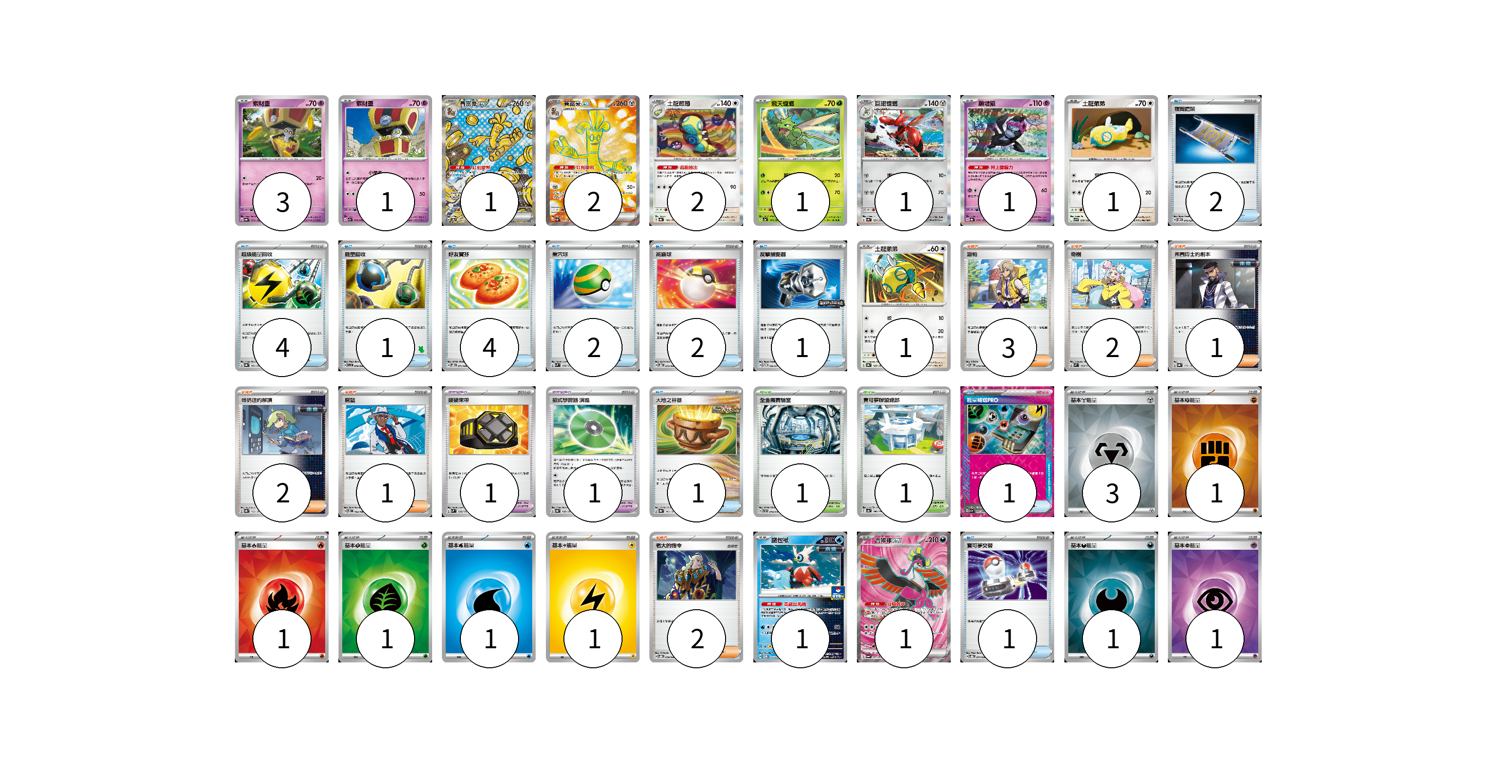 牌組構築方案 以此牌組為基礎新構築牌組 顯示卡面 顯示列表 寶可夢卡(16) 3 1 1 2 2 1 1 1 1 1 1 1 寶可夢道具(2) 1 1 物品卡(19) 2 4 1 4 2 2 1 1 1 1 支援者卡(11) 3 2 1 2 1 2 競技場卡(2) 1 1 能量卡(10) 3 1 1 1 1 1 1 1 寶可夢卡(16) 卡牌名稱 張數 卡牌名稱 張數 索財靈 SV8a 073/187 03 索財靈 SV7a 024/064 01 賽富豪ex SV8a 220/187 01 賽富豪ex SV3a 079/062 02 土龍節節 SV8a 130/187 02 飛天螳螂 SV2a 123/165 01 巨鉗螳螂 SV4a 129/190 01 願增猿 SV8a 075/187 01 土龍弟弟 SV9 078/100 01 土龍弟弟 SV8a 129/187 01 鐵包袱 SV-P 175/SV-P 01 吉雉雞ex SV6a 081/064 01 寶可夢道具(2) 卡牌名稱 張數 卡牌名稱 張數 硬硬束帶 SVM 139/175 01 招式學習器 演進 SV8a 160/187 01 物品卡(19) 卡牌名稱 張數 卡牌名稱 張數 夜間擔架 SVOM 016/021 02 超級能量回收 SV8a 141/187 04 能量回收 SVI 049/066 01 好友寶芬 SVOD 011/020 04 巢穴球 SVM 133/175 02 高級球 SVOD 012/020 02 反擊捕捉器 SV-P 136/SV-P 01 大地之容器 SV8a 143/187 01 能量輸送PRO SV7a 052/064 01 寶可夢交替 SVOD 014/020 01 支援者卡(11) 卡牌名稱 張數 卡牌名稱 張數 派帕 SVOD 018/020 03 奇樹 SVM 160/175 02 弗圖博士的劇本 SV8a 175/187 01 暗碼迷的解讀 SV8a 165/187 02 席藍 SV8 102/106 01 老大的指令 SVOD 019/020 02 競技場卡(2) 卡牌名稱 張數 卡牌名稱 張數 全金屬實驗室 SVTH 018/018 01 寶可夢聯盟總部 SV4a 186/190 01 能量卡(10) 卡牌名稱 張數 卡牌名稱 張數 基本【鋼】能量 SVOD MET 03 基本【鬥】能量 SVK FIG 01 基本【火】能量 SVK FIR 01 基本【草】能量 SVK GRA 01 基本【水】能量 SVD WAT 01 基本【雷】能量 SVD LIG 01 基本【惡】能量 SVOM DAR 01 基本【超】能量 SVOD PSY 01 以此牌組為基礎新構築牌組 牌組編碼 LwAtBd-BcZild-RyOZEE copy 列印牌組單 牌組編碼已複製 分享至SNS