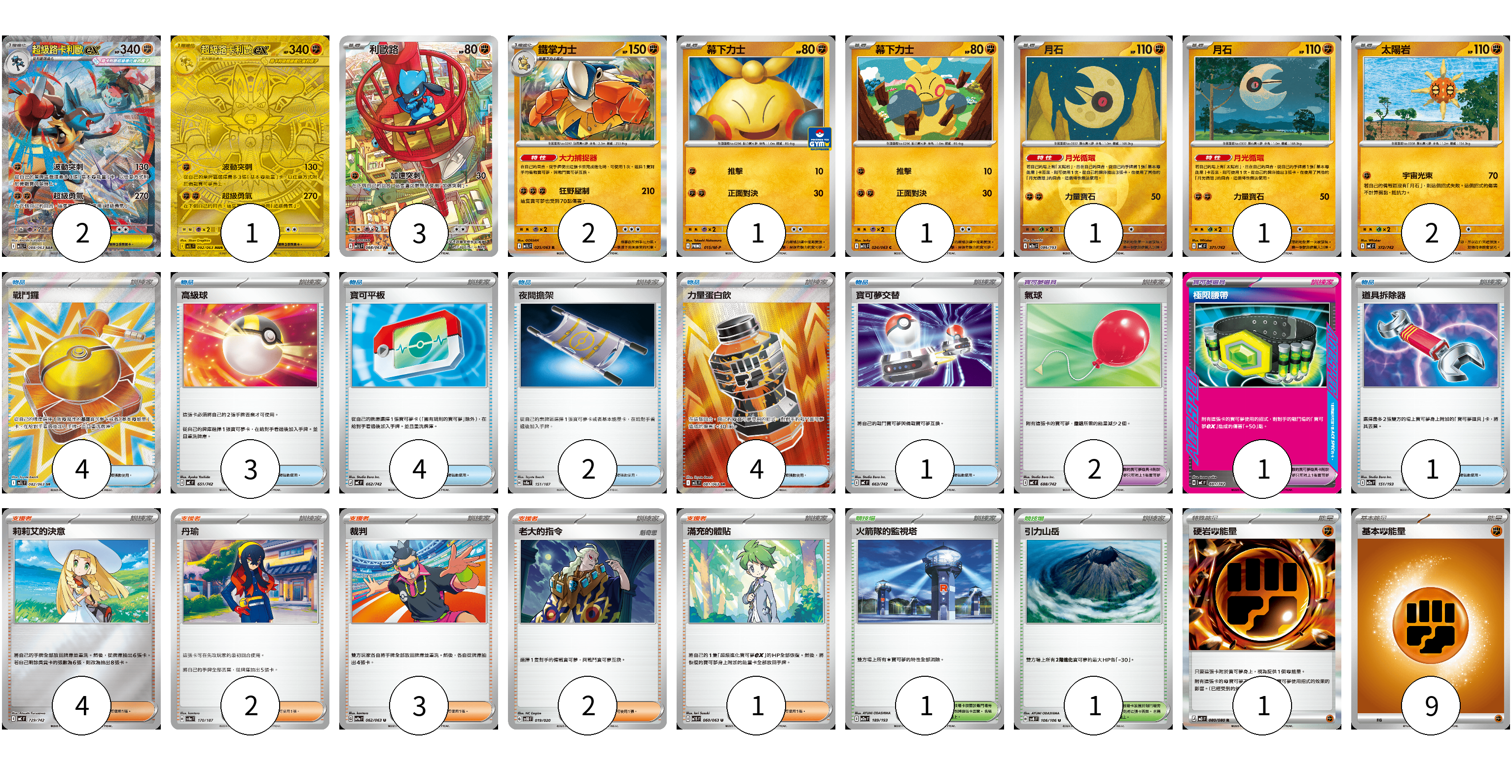 牌組構築方案 以此牌組為基礎新構築牌組 顯示卡面 顯示列表 寶可夢卡(14) 2 1 3 2 1 1 1 1 2 寶可夢道具(3) 2 1 物品卡(19) 4 3 4 2 4 1 1 支援者卡(12) 4 2 3 2 1 競技場卡(2) 1 1 能量卡(10) 1 9 寶可夢卡(14) 卡牌名稱 張數 卡牌名稱 張數 超級路卡利歐ex M1L 088/063 02 超級路卡利歐ex M1L 092/063 01 利歐路 M1L 068/063 03 鐵掌力士 M1L 025/063 02 幕下力士 M-P 015/M-P 01 幕下力士 M1L 024/063 01 月石 M2a 086/193 01 月石 MC 371/742 01 太陽岩 MC 372/742 02 寶可夢道具(3) 卡牌名稱 張數 卡牌名稱 張數 氣球 MC 688/742 02 極限腰帶 MC 691/742 01 物品卡(19) 卡牌名稱 張數 卡牌名稱 張數 戰鬥鑼 M1L 082/063 04 高級球 MC 651/742 03 寶可平板 MC 662/742 04 夜間擔架 SV8a 151/187 02 力量蛋白飲 M1L 081/063 04 寶可夢交替 MC 663/742 01 道具拆除器 M2a 151/193 01 支援者卡(12) 卡牌名稱 張數 卡牌名稱 張數 莉莉艾的決意 MC 729/742 04 丹瑜 SV8a 170/187 02 裁判 SV9a 062/063 03 老大的指令 SVOD 019/020 02 滿充的體貼 M1S 060/063 01 競技場卡(2) 卡牌名稱 張數 卡牌名稱 張數 火箭隊的監視塔 M2a 189/193 01 引力山岳 SV8 106/106 01 能量卡(10) 卡牌名稱 張數 卡牌名稱 張數 硬岩【鬥】能量 M3 080/080 01 基本【鬥】能量 MC FIG 09 以此牌組為基礎新構築牌組 牌組編碼 LwHQBs-boKpds-kjjorU copy 列印牌組單 牌組編碼已複製 分享至SNS
