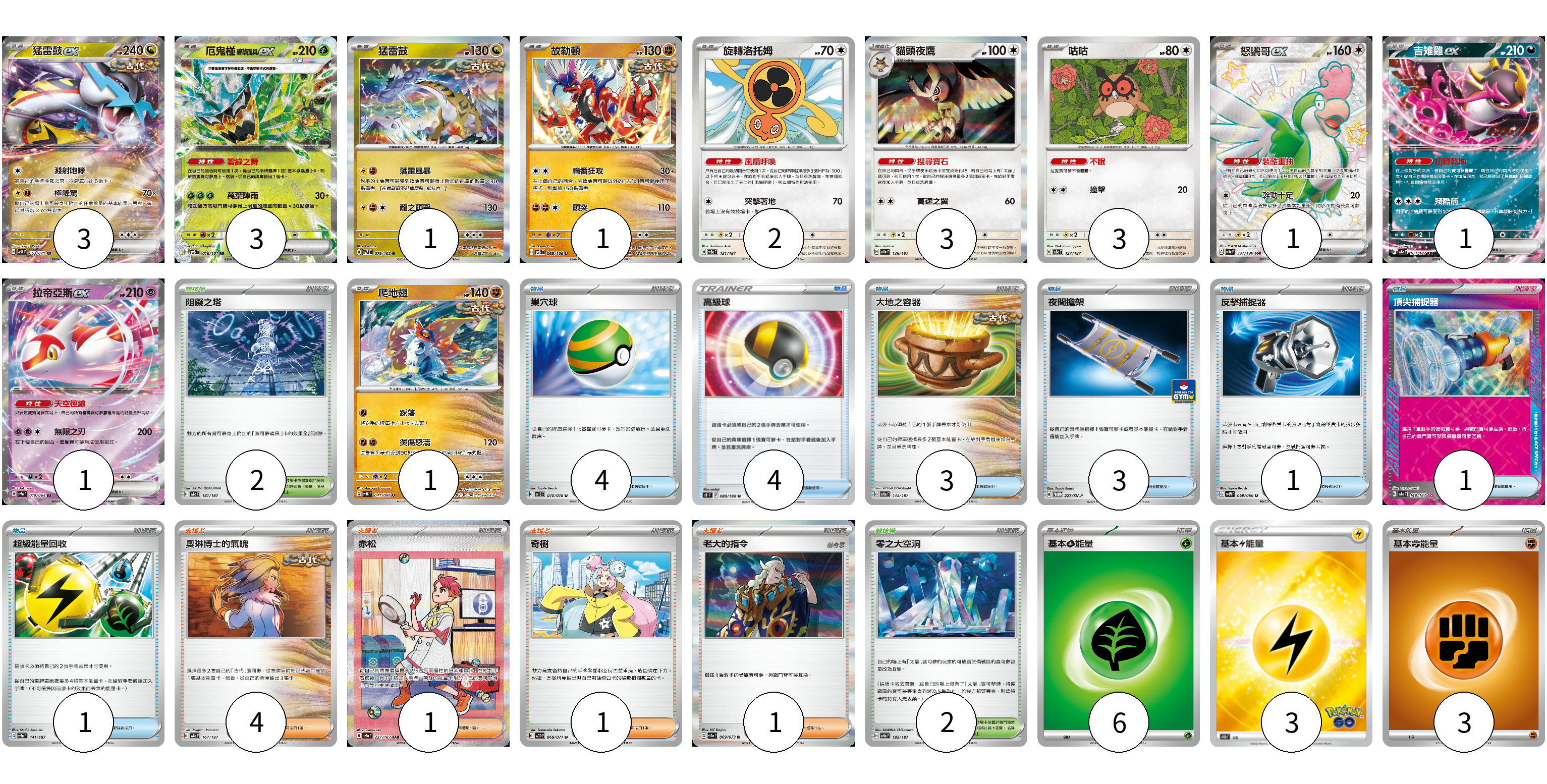 牌組構築方案 以此牌組為基礎新構築牌組 顯示卡面 顯示列表 寶可夢卡(20) 3 3 1 1 2 3 3 1 1 1 1 物品卡(17) 4 4 3 3 1 1 1 支援者卡(7) 4 1 1 1 競技場卡(4) 2 2 能量卡(12) 6 3 3 寶可夢卡(20) 卡牌名稱 張數 卡牌名稱 張數 猛雷鼓ex SV5K 053/071 03 厄鬼椪 碧草面具ex SV6 016/101 03 猛雷鼓 SV7 075/102 01 故勒頓 SV8 069/106 01 旋轉洛托姆 SV8a 131/187 02 貓頭夜鷹 SV8a 128/187 03 咕咕 SV8a 127/187 03 怒鸚哥ex SV4a 337/190 01 吉雉雞ex SV8a 104/187 01 拉帝亞斯ex SV7a 019/064 01 爬地翅 SV4K 041/066 01 物品卡(17) 卡牌名稱 張數 卡牌名稱 張數 巢穴球 SV1S 070/078 04 高級球 S9 089/100 04 大地之容器 SV8a 143/187 03 夜間擔架 SV-P 227/SV-P 03 反擊捕捉器 SV4M 059/066 01 頂尖捕捉器 SV8a 148/187 01 超級能量回收 SV8a 141/187 01 支援者卡(7) 卡牌名稱 張數 卡牌名稱 張數 奧琳博士的氣魄 SV8a 167/187 04 赤松 SV8a 227/187 01 奇樹 SV2D 069/071 01 老大的指令 SV1a 069/073 01 競技場卡(4) 卡牌名稱 張數 卡牌名稱 張數 阻礙之塔 SV8a 181/187 02 零之大空洞 SV8a 182/187 02 能量卡(12) 卡牌名稱 張數 卡牌名稱 張數 基本【草】能量 SVF GRA 06 基本雷能量 S10b LIG 03 基本【鬥】能量 SVHK FIG 03 以此牌組為基礎新構築牌組 牌組編碼 LwItrU-IQDSxX-PBrtnT copy 列印牌組單 牌組編碼已複製 分享至SNS