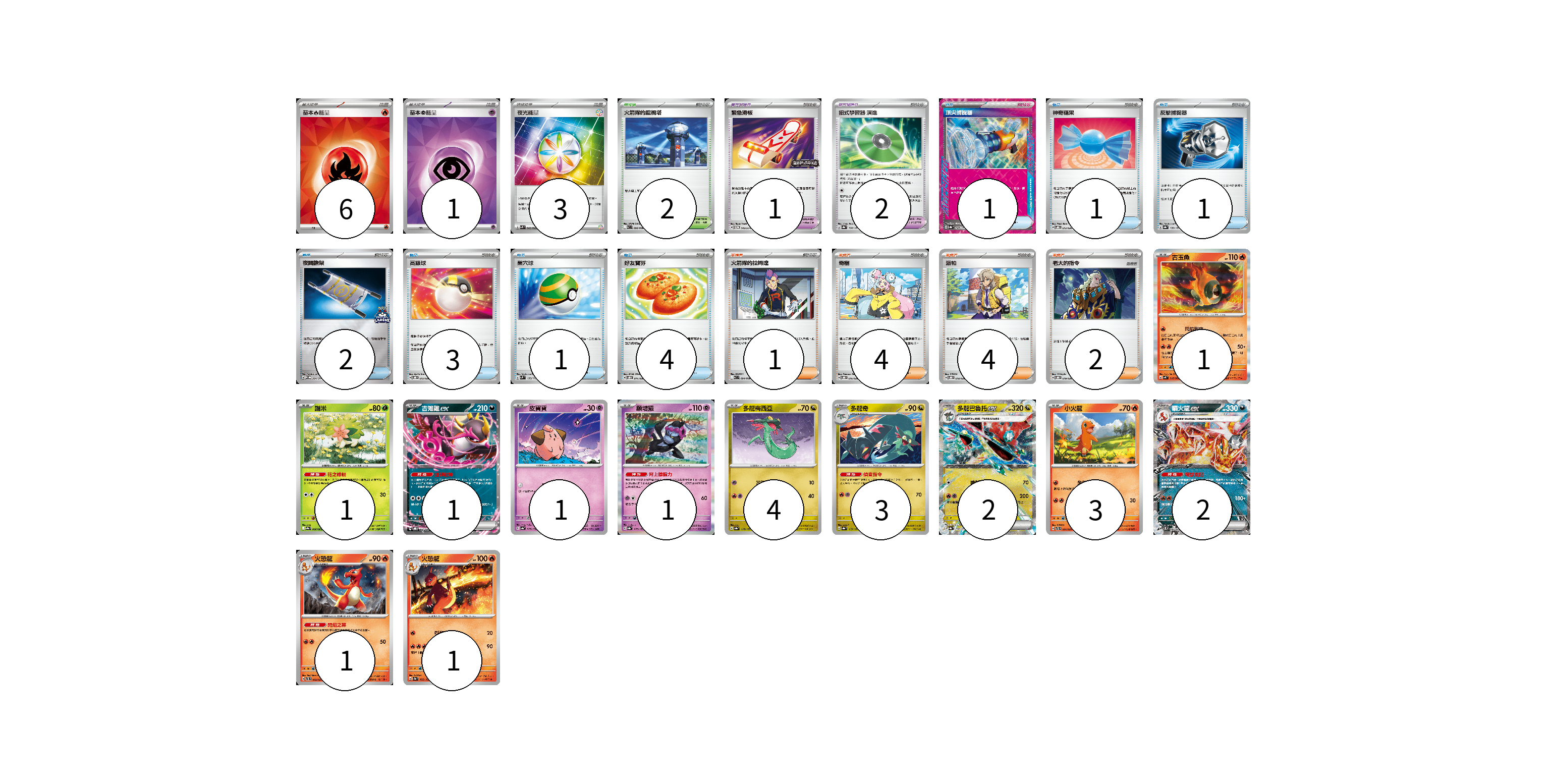 牌組構築方案 以此牌組為基礎新構築牌組 顯示卡面 顯示列表 寶可夢卡(21) 1 1 1 1 1 4 3 2 3 2 1 1 寶可夢道具(3) 1 2 物品卡(13) 1 1 1 2 3 1 4 支援者卡(11) 1 4 4 2 競技場卡(2) 2 能量卡(10) 6 1 3 寶可夢卡(21) 卡牌名稱 張數 卡牌名稱 張數 古玉魚 SV4K 016/066 01 謝米 SV9a 006/063 01 吉雉雞ex SVOD 004/020 01 皮寶寶 SV4a 077/190 01 願增猿 SV8a 075/187 01 多龍梅西亞 SV8a 118/187 04 多龍奇 SV8a 119/187 03 多龍巴魯托ex SV8a 120/187 02 小火龍 SVTL 001/021 03 噴火龍ex SVTL 006/021 02 火恐龍 SVTL 002/021 01 火恐龍 SV2a 005/165 01 寶可夢道具(3) 卡牌名稱 張數 卡牌名稱 張數 緊急滑板 SV-P 140/SV-P 01 招式學習器 演進 SV8a 160/187 02 物品卡(13) 卡牌名稱 張數 卡牌名稱 張數 頂尖捕捉器 SV8a 148/187 01 神奇糖果 SVOD 013/020 01 反擊捕捉器 SV8a 139/187 01 夜間擔架 SV-P 204/SV-P 02 高級球 SVOD 012/020 03 巢穴球 SVM 133/175 01 好友寶芬 SVOD 011/020 04 支援者卡(11) 卡牌名稱 張數 卡牌名稱 張數 火箭隊的拉姆達 SV10 094/098 01 奇樹 SVOD 016/020 04 派帕 SVOD 018/020 04 老大的指令 SVOD 019/020 02 競技場卡(2) 卡牌名稱 張數 卡牌名稱 張數 火箭隊的監視塔 SV10 096/098 02 能量卡(10) 卡牌名稱 張數 卡牌名稱 張數 基本【火】能量 SVM FIR 06 基本【超】能量 SVOD PSY 01 夜光能量 SVK 042/042 03 以此牌組為基礎新構築牌組 牌組編碼 LwXspk-VFnNnM-vMBkWd copy 列印牌組單 牌組編碼已複製 分享至SNS