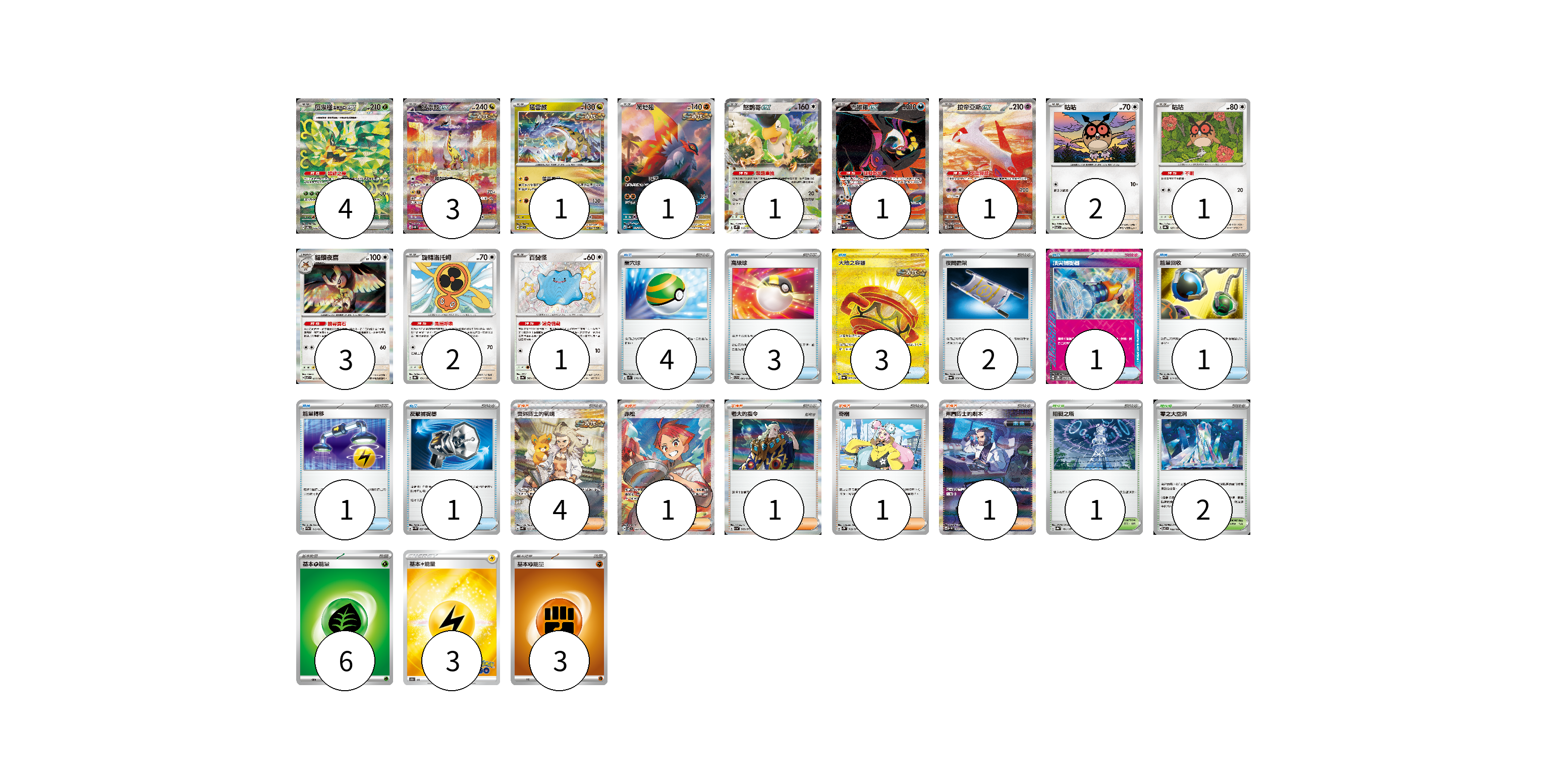 牌組構築方案 以此牌組為基礎新構築牌組 顯示卡面 顯示列表 寶可夢卡(21) 4 3 1 1 1 1 1 2 1 3 2 1 物品卡(16) 4 3 3 2 1 1 1 1 支援者卡(8) 4 1 1 1 1 競技場卡(3) 1 2 能量卡(12) 6 3 3 寶可夢卡(21) 卡牌名稱 張數 卡牌名稱 張數 厄鬼椪 碧草面具ex SV6 125/101 04 猛雷鼓ex SV5K 095/071 03 猛雷鼓 SV7 075/102 01 爬地翅 SV4K 074/066 01 怒鸚哥ex SV2P 065/071 01 吉雉雞ex SV6a 089/064 01 拉帝亞斯ex SV7a 087/064 01 咕咕 SV7 076/102 02 咕咕 SV8a 127/187 01 貓頭夜鷹 SV7 077/102 03 旋轉洛托姆 SV8a 131/187 02 百變怪 SV4a 309/190 01 物品卡(16) 卡牌名稱 張數 卡牌名稱 張數 巢穴球 SV1S 070/078 04 高級球 SVB 002/028 03 大地之容器 SV6a 093/064 03 夜間擔架 SV6a 056/064 02 頂尖捕捉器 SV5M 062/071 01 能量回收 SVAW 011/023 01 能量轉移 SVAM 012/023 01 反擊捕捉器 SV4M 059/066 01 支援者卡(8) 卡牌名稱 張數 卡牌名稱 張數 奧琳博士的氣魄 SV4K 091/066 04 赤松 SV7 123/102 01 老大的指令 SV1a 069/073 01 奇樹 SV2D 069/071 01 弗圖博士的劇本 SV4M 091/066 01 競技場卡(3) 卡牌名稱 張數 卡牌名稱 張數 阻礙之塔 SV8a 181/187 01 零之大空洞 SV7 102/102 02 能量卡(12) 卡牌名稱 張數 卡牌名稱 張數 基本【草】能量 SVF GRA 06 基本雷能量 S10b LIG 03 基本【鬥】能量 SVHK FIG 03 以此牌組為基礎新構築牌組 牌組編碼 LydVOn-JADhms-SZQOUl copy 列印牌組單 牌組編碼已複製 分享至SNS
