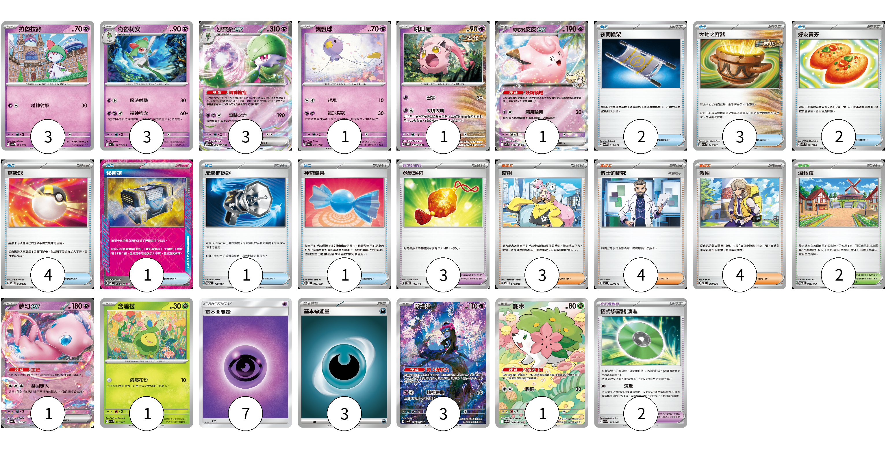 牌組構築方案 以此牌組為基礎新構築牌組 顯示卡面 顯示列表 寶可夢卡(18) 3 3 3 1 1 1 1 1 3 1 寶可夢道具(5) 3 2 物品卡(14) 2 3 2 4 1 1 1 支援者卡(11) 3 4 4 競技場卡(2) 2 能量卡(10) 7 3 寶可夢卡(18) 卡牌名稱 張數 卡牌名稱 張數 拉魯拉絲 SV4a 080/190 03 奇魯莉安 SV1S 027/078 03 沙奈朵ex SV4a 082/190 03 飄飄球 SV4a 083/190 01 吼叫尾 SV4K 032/066 01 莉莉艾的皮皮ex SV9 033/100 01 夢幻ex SVK 001/042 01 含羞苞 SV8a 001/187 01 願增猿 SV6 107/101 03 謝米 SV9a 066/063 01 寶可夢道具(5) 卡牌名稱 張數 卡牌名稱 張數 勇氣護符 SVM 142/175 03 招式學習器 演進 SV8a 160/187 02 物品卡(14) 卡牌名稱 張數 卡牌名稱 張數 夜間擔架 SVOM 016/021 02 大地之容器 SV8a 143/187 03 好友寶芬 SVOD 011/020 02 高級球 SVOD 012/020 04 秘密箱 SV6 092/101 01 反擊捕捉器 SV8a 139/187 01 神奇糖果 SVOD 013/020 01 支援者卡(11) 卡牌名稱 張數 卡牌名稱 張數 奇樹 SVOD 016/020 03 博士的研究 SVK 033/042 04 派帕 SVOD 018/020 04 競技場卡(2) 卡牌名稱 張數 卡牌名稱 張數 深缽鎮 SVK 039/042 02 能量卡(10) 卡牌名稱 張數 卡牌名稱 張數 基本超能量 AS6D PSY 07 基本【惡】能量 SVF DAR 03 以此牌組為基礎新構築牌組 牌組編碼 Lyjtsg-MeHMoT-PnuiHw copy 列印牌組單 牌組編碼已複製 分享至SNS
