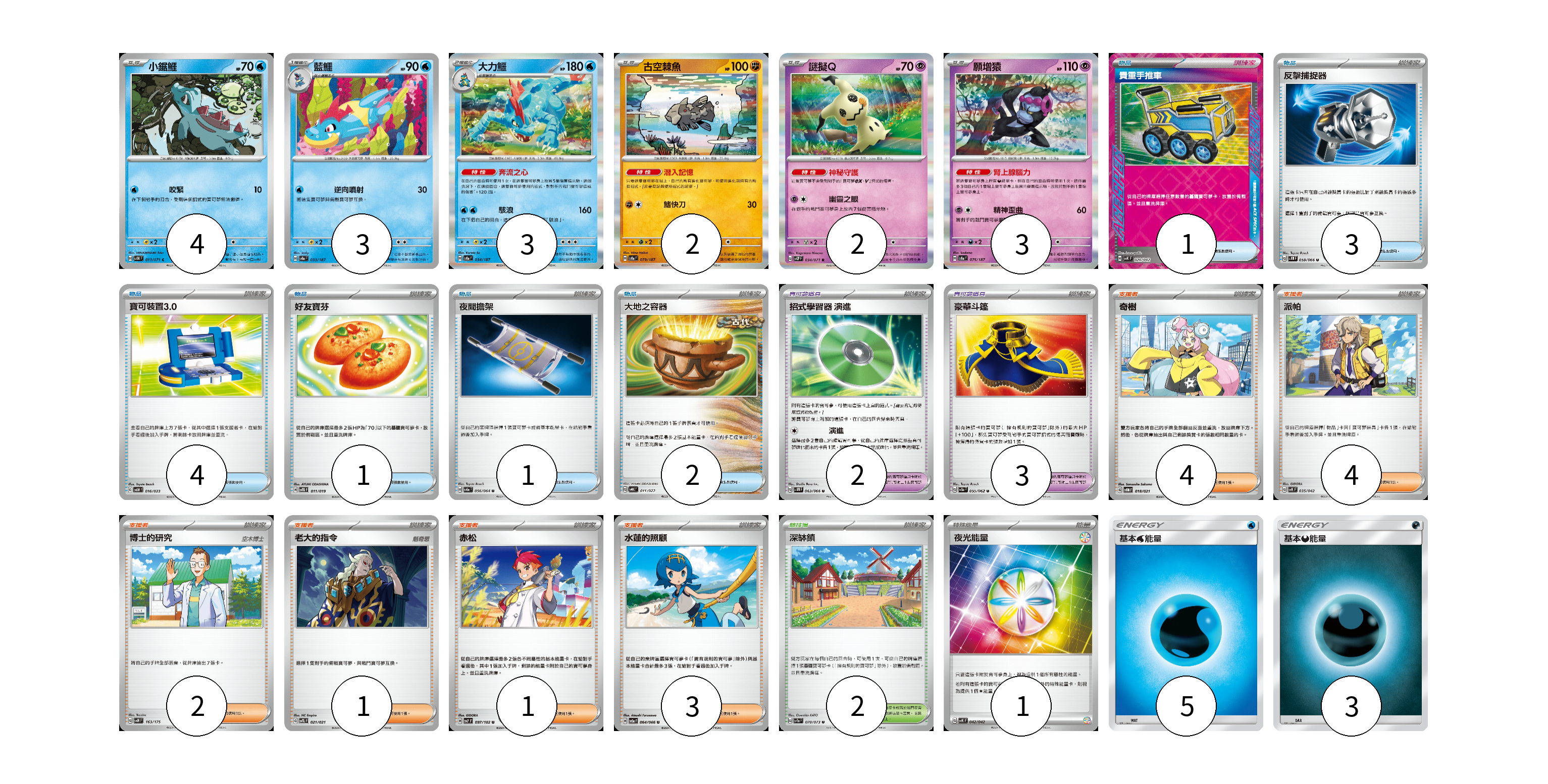 牌組構築方案 以此牌組為基礎新構築牌組 顯示卡面 顯示列表 寶可夢卡(17) 4 3 3 2 2 3 寶可夢道具(5) 2 3 物品卡(12) 1 3 4 1 1 2 支援者卡(15) 4 4 2 1 1 3 競技場卡(2) 2 能量卡(9) 1 5 3 寶可夢卡(17) 卡牌名稱 張數 卡牌名稱 張數 小鋸鱷 SV5K 013/071 04 藍鱷 SV8a 033/187 03 大力鱷 SV8a 034/187 03 古空棘魚 SV8a 079/187 02 謎擬Q SV2P 034/071 02 願增猿 SV8a 075/187 03 寶可夢道具(5) 卡牌名稱 張數 卡牌名稱 張數 招式學習器 演進 SV4M 063/066 02 豪華斗篷 SV3a 055/062 03 物品卡(12) 卡牌名稱 張數 卡牌名稱 張數 貴重手推車 SVK 020/042 01 反擊捕捉器 SV4M 059/066 03 寶可裝置3.0 SVAW 016/023 04 好友寶芬 SVTG 011/019 01 夜間擔架 SV6a 056/064 01 大地之容器 SVHK 011/022 02 支援者卡(15) 卡牌名稱 張數 卡牌名稱 張數 奇樹 SVOM 018/021 04 派帕 SVK 035/042 04 博士的研究 SVM 163/175 02 老大的指令 SVTL 021/021 01 赤松 SV7 097/102 01 水蓮的照顧 SV5a 064/066 03 競技場卡(2) 卡牌名稱 張數 卡牌名稱 張數 深缽鎮 SV1a 070/073 02 能量卡(9) 卡牌名稱 張數 卡牌名稱 張數 夜光能量 SVK 042/042 01 基本水能量 AS6D WAT 05 基本惡能量 AS6D DAR 03 以此牌組為基礎新構築牌組 牌組編碼 LzUMwB-QHCWaj-snuUzu copy 列印牌組單 牌組編碼已複製 分享至SNS
