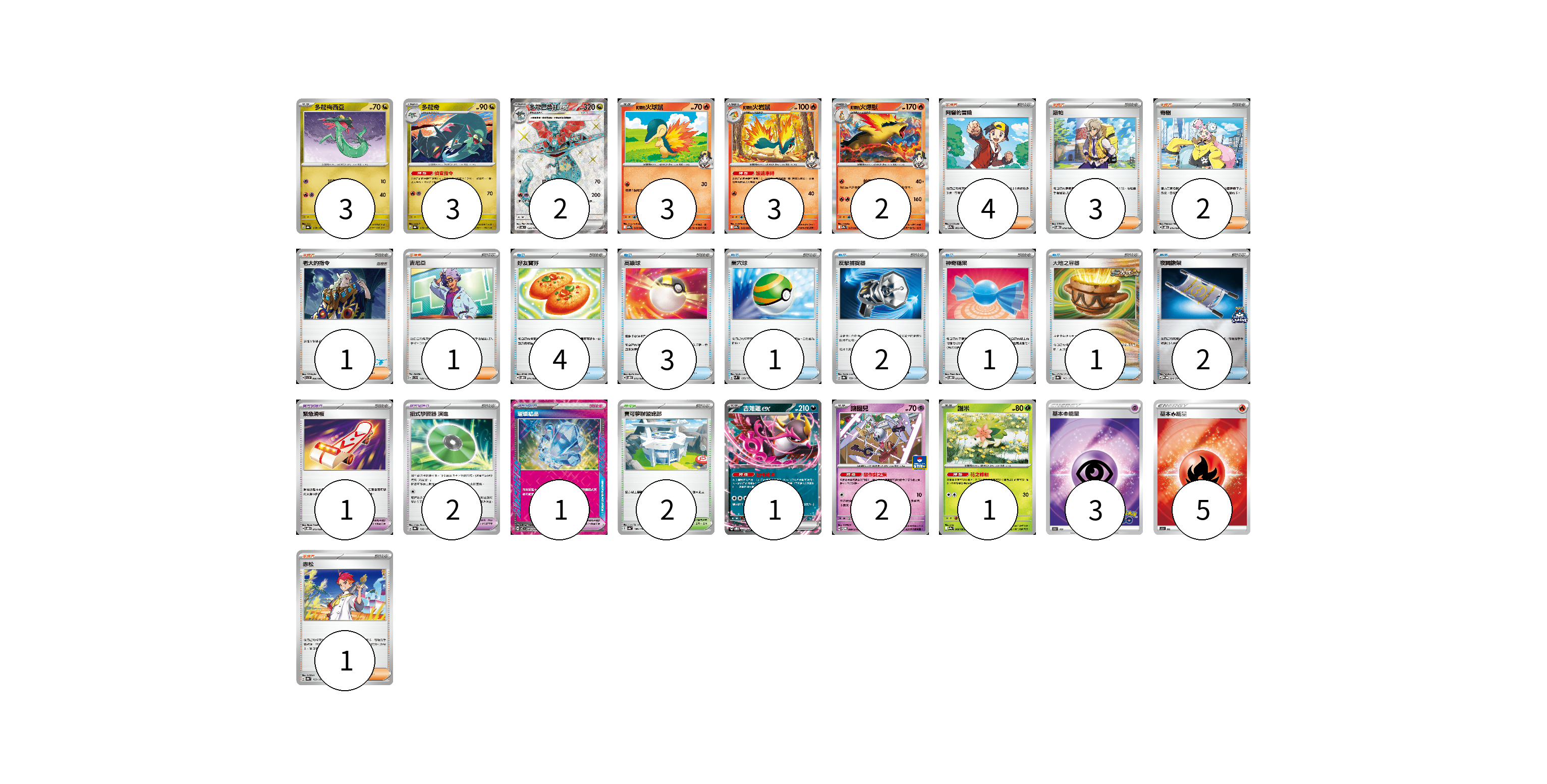 牌組構築方案 以此牌組為基礎新構築牌組 顯示卡面 顯示列表 寶可夢卡(20) 3 3 2 3 3 2 1 2 1 寶可夢道具(4) 1 2 1 物品卡(14) 4 3 1 2 1 1 2 支援者卡(12) 4 3 2 1 1 1 競技場卡(2) 2 能量卡(8) 3 5 寶可夢卡(20) 卡牌名稱 張數 卡牌名稱 張數 多龍梅西亞 SV8a 118/187 03 多龍奇 SV8a 119/187 03 多龍巴魯托ex SV6 120/101 02 <阿響的>火球鼠 SV9a 015/063 03 <阿響的>火岩鼠 SV9a 016/063 03 <阿響的>火爆獸 SV9a 017/063 02 吉雉雞ex SVOD 004/020 01 鑰圈兒 SV-P 089/SV-P 02 謝米 SV9a 006/063 01 寶可夢道具(4) 卡牌名稱 張數 卡牌名稱 張數 緊急滑板 SVOD 015/020 01 招式學習器 演進 SV8a 160/187 02 璀璨結晶 SV7 094/102 01 物品卡(14) 卡牌名稱 張數 卡牌名稱 張數 好友寶芬 SVOD 011/020 04 高級球 SVOD 012/020 03 巢穴球 SVM 133/175 01 反擊捕捉器 SV8a 139/187 02 神奇糖果 SVOD 013/020 01 大地之容器 SV8a 143/187 01 夜間擔架 SV-P 204/SV-P 02 支援者卡(12) 卡牌名稱 張數 卡牌名稱 張數 阿響的冒險 SV9a 063/063 04 派帕 SVOD 018/020 03 奇樹 SVOD 016/020 02 老大的指令 SVI 066/066 01 吉尼亞 SVD 129/139 01 赤松 SV8a 163/187 01 競技場卡(2) 卡牌名稱 張數 卡牌名稱 張數 寶可夢聯盟總部 SV4a 186/190 02 能量卡(8) 卡牌名稱 張數 卡牌名稱 張數 基本超能量 S10b PSY 03 基本【火】能量 SO FIR 05 以此牌組為基礎新構築牌組 牌組編碼 MCMBTW-uYFvyq-jyAgyU copy 列印牌組單 牌組編碼已複製 分享至SNS