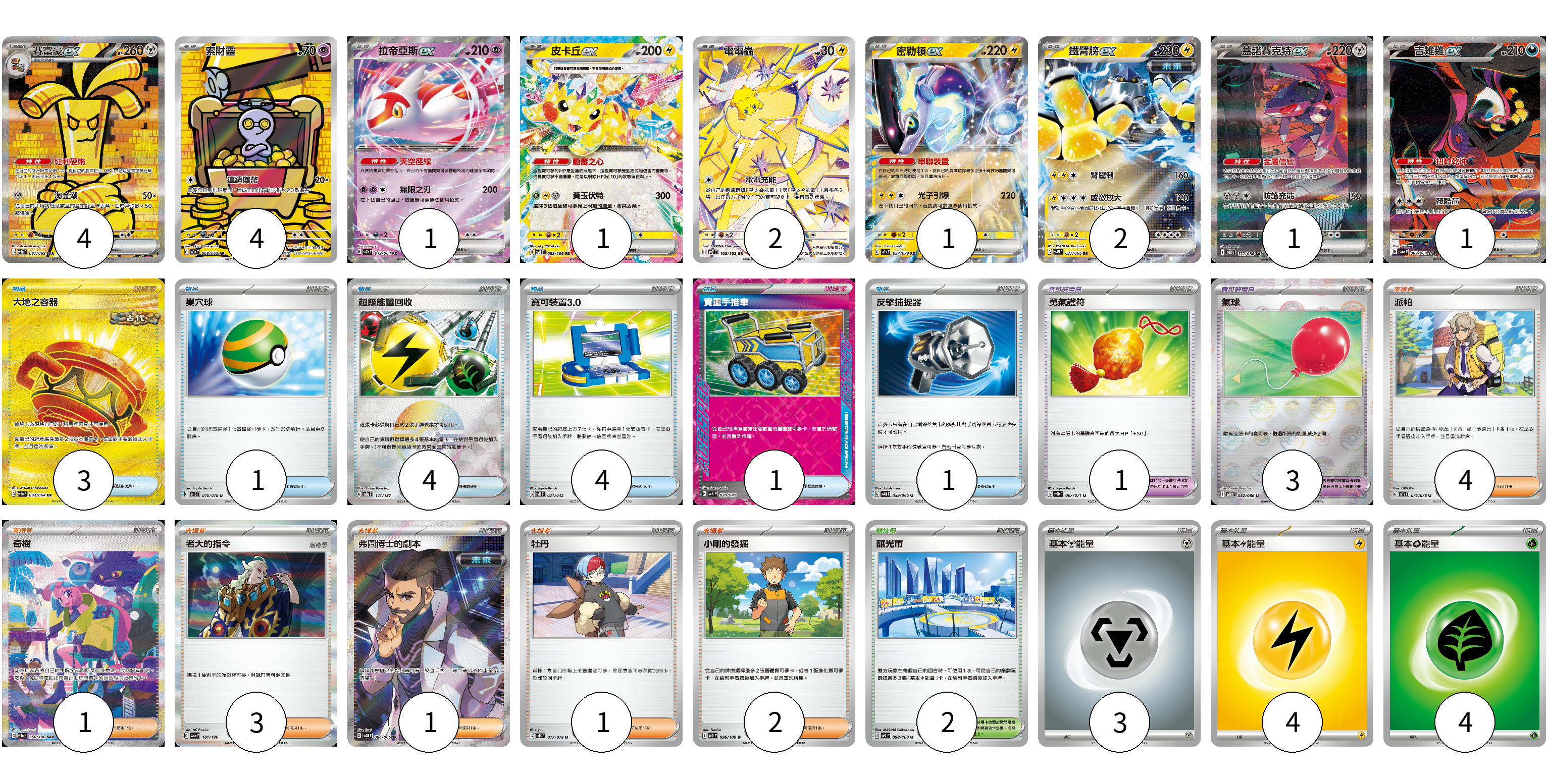 牌組構築方案 以此牌組為基礎新構築牌組 顯示卡面 顯示列表 寶可夢卡(17) 4 4 1 1 2 1 2 1 1 寶可夢道具(4) 1 3 物品卡(14) 3 1 4 4 1 1 支援者卡(12) 4 1 3 1 1 2 競技場卡(2) 2 能量卡(11) 3 4 4 寶可夢卡(17) 卡牌名稱 張數 卡牌名稱 張數 賽富豪ex SV3a 087/062 04 索財靈 SV3a 068/062 04 拉帝亞斯ex SV7a 019/064 01 皮卡丘ex SV8 033/106 01 電電蟲 SV7 108/102 02 密勒頓ex SV1V 037/078 01 鐵臂膀ex SV4M 027/066 02 蓋諾賽克特ex SV11B 172/086 01 吉雉雞ex SV6a 089/064 01 寶可夢道具(4) 卡牌名稱 張數 卡牌名稱 張數 勇氣護符 SV2D 067/071 01 氣球 SV11B 082/086 03 物品卡(14) 卡牌名稱 張數 卡牌名稱 張數 大地之容器 SV6a 093/064 03 巢穴球 SV1S 070/078 01 超級能量回收 SV8a 141/187 04 寶可裝置3.0 SVK 021/042 04 貴重手推車 SVK 020/042 01 反擊捕捉器 SV4M 059/066 01 支援者卡(12) 卡牌名稱 張數 卡牌名稱 張數 派帕 SV1V 076/078 04 奇樹 SV4a 350/190 01 老大的指令 SV4a 181/190 03 弗圖博士的劇本 SV4M 086/066 01 牡丹 SV1S 077/078 01 小剛的發掘 SV9 096/100 02 競技場卡(2) 卡牌名稱 張數 卡牌名稱 張數 釀光市 SV9 098/100 02 能量卡(11) 卡牌名稱 張數 卡牌名稱 張數 基本鋼能量 sv-p MET 03 基本雷能量 sv-p LIG 04 基本草能量 sv-p GRA 04 以此牌組為基礎新構築牌組 牌組編碼 MFMEhP-Tdqjvx-FQAcAF copy 列印牌組單 牌組編碼已複製 分享至SNS