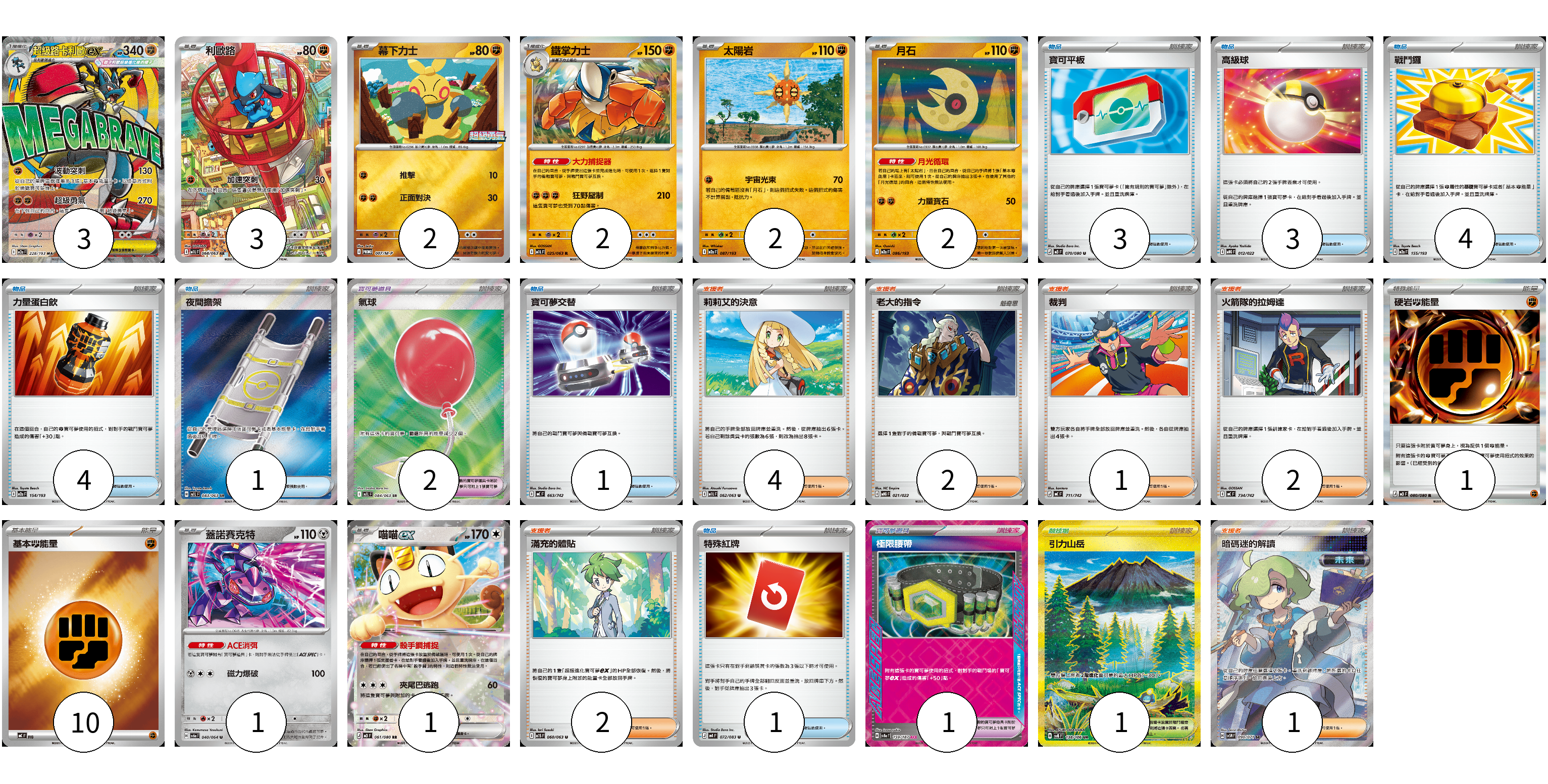 牌組構築方案 以此牌組為基礎新構築牌組 顯示卡面 顯示列表 寶可夢卡(16) 3 3 2 2 2 2 1 1 寶可夢道具(3) 2 1 物品卡(17) 3 3 4 4 1 1 1 支援者卡(12) 4 2 1 2 2 1 競技場卡(1) 1 能量卡(11) 1 10 寶可夢卡(16) 卡牌名稱 張數 卡牌名稱 張數 超級路卡利歐ex M2a 228/193 03 利歐路 M1L 068/063 03 幕下力士 M-P 007/M-P 02 鐵掌力士 M1L 025/063 02 太陽岩 M2a 087/193 02 月石 M2a 086/193 02 蓋諾賽克特 SV6a 040/064 01 喵喵ex M3 061/080 01 寶可夢道具(3) 卡牌名稱 張數 卡牌名稱 張數 氣球 M1L 084/063 02 極限腰帶 SV8a 159/187 01 物品卡(17) 卡牌名稱 張數 卡牌名稱 張數 寶可平板 M3 070/080 03 高級球 MBG 012/022 03 戰鬥鑼 M2a 155/193 04 力量蛋白飲 M2a 154/193 04 夜間擔架 M1L 083/063 01 寶可夢交替 MC 663/742 01 特殊紅牌 M4 072/083 01 支援者卡(12) 卡牌名稱 張數 卡牌名稱 張數 莉莉艾的決意 M1L 062/063 04 老大的指令 MBG 021/022 02 裁判 MC 711/742 01 火箭隊的拉姆達 MC 734/742 02 滿充的體貼 M1S 060/063 02 暗碼迷的解讀 SV5M 090/071 01 競技場卡(1) 卡牌名稱 張數 卡牌名稱 張數 引力山岳 SV8 138/106 01 能量卡(11) 卡牌名稱 張數 卡牌名稱 張數 硬岩【鬥】能量 M3 080/080 01 基本【鬥】能量 MC FIG 10 以此牌組為基礎新構築牌組 牌組編碼 MFojSz-asNJFh-xvIDHI copy 列印牌組單 牌組編碼已複製 分享至SNS