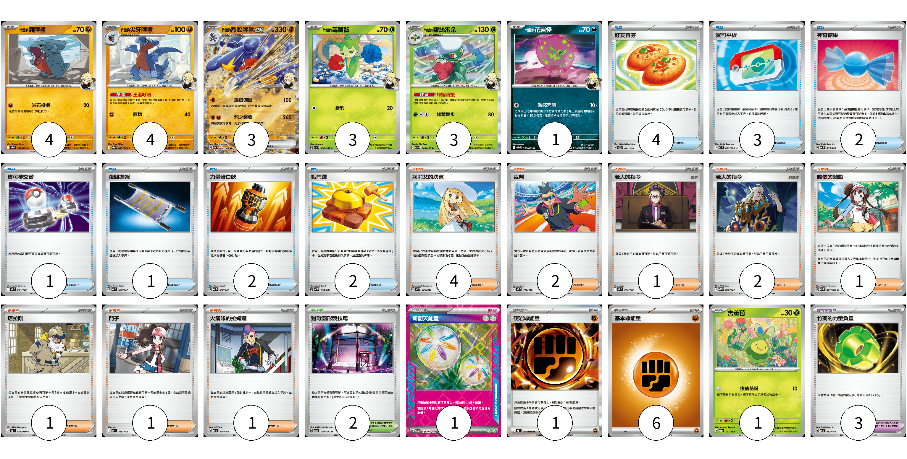 牌組構築方案 以此牌組為基礎新構築牌組 顯示卡面 顯示列表 寶可夢卡(19) 4 4 3 3 3 1 1 寶可夢道具(3) 3 物品卡(15) 4 3 2 1 1 2 2 支援者卡(13) 4 2 1 2 1 1 1 1 競技場卡(2) 2 能量卡(8) 1 1 6 寶可夢卡(19) 卡牌名稱 張數 卡牌名稱 張數 <竹蘭的>圓陸鯊 SV9a 042/063 04 <竹蘭的>尖牙陸鯊 SV9a 043/063 04 <竹蘭的>烈咬陸鯊ex SV9a 044/063 03 <竹蘭的>毒薔薇 SV9a 004/063 03 <竹蘭的>羅絲雷朵 SV9a 005/063 03 <竹蘭的>花岩怪 SV9a 050/063 01 含羞苞 M2a 011/193 01 寶可夢道具(3) 卡牌名稱 張數 卡牌名稱 張數 竹蘭的力量負重 MC 682/742 03 物品卡(15) 卡牌名稱 張數 卡牌名稱 張數 好友寶芬 SVOD 011/020 04 寶可平板 M3 070/080 03 神奇糖果 MC 655/742 02 寶可夢交替 MC 663/742 01 夜間擔架 MC 670/742 01 力量蛋白飲 MC 652/742 02 戰鬥鑼 MC 654/742 02 支援者卡(13) 卡牌名稱 張數 卡牌名稱 張數 莉莉艾的決意 MC 729/742 04 裁判 MC 711/742 02 老大的指令 MC 724/742 01 老大的指令 MBD 020/022 02 鳴依的勉勵 M3 075/080 01 塔拉剛 M3 073/080 01 鬥子 MC 718/742 01 火箭隊的拉姆達 MC 734/742 01 競技場卡(2) 卡牌名稱 張數 卡牌名稱 張數 對戰圓形競技場 M2 079/080 02 能量卡(8) 卡牌名稱 張數 卡牌名稱 張數 新衝天能量 SV5K 071/071 01 硬岩【鬥】能量 M3 080/080 01 基本【鬥】能量 MC FIG 06 以此牌組為基礎新構築牌組 牌組編碼 MGXGxw-MChEap-IyPeku copy 列印牌組單 牌組編碼已複製 分享至SNS