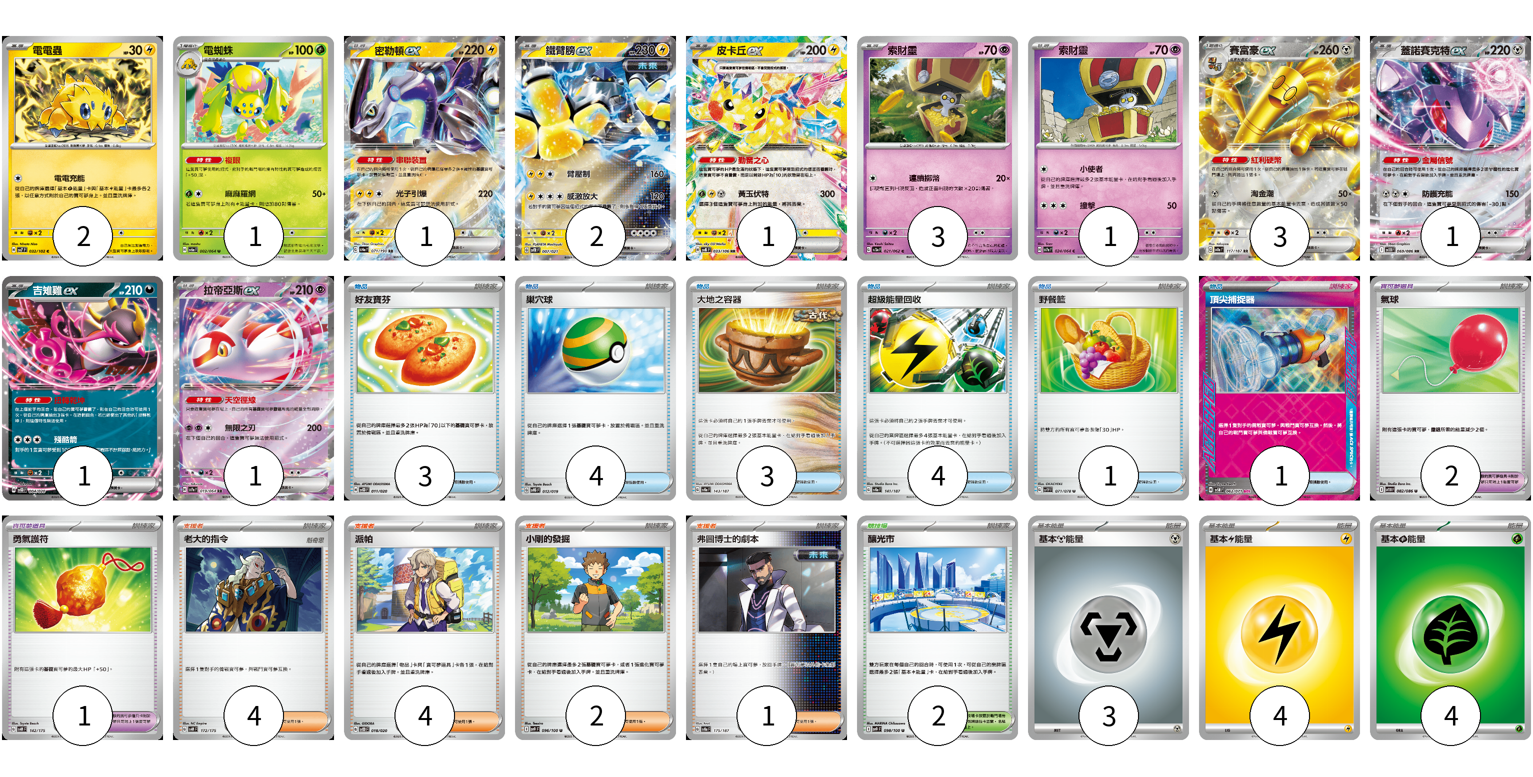 牌組構築方案 以此牌組為基礎新構築牌組 顯示卡面 顯示列表 寶可夢卡(17) 2 1 1 2 1 3 1 3 1 1 1 寶可夢道具(3) 2 1 物品卡(16) 3 4 3 4 1 1 支援者卡(11) 4 4 2 1 競技場卡(2) 2 能量卡(11) 3 4 4 寶可夢卡(17) 卡牌名稱 張數 卡牌名稱 張數 電電蟲 SV7 032/102 02 電蜘蛛 SV6a 002/064 01 密勒頓ex SV4a 071/190 01 鐵臂膀ex SVTR 007/021 02 皮卡丘ex SV8 033/106 01 索財靈 SV3a 021/062 03 索財靈 SV7a 024/064 01 賽富豪ex SV8a 117/187 03 蓋諾賽克特ex SV11B 069/086 01 吉雉雞ex SVOD 004/020 01 拉帝亞斯ex SV7a 019/064 01 寶可夢道具(3) 卡牌名稱 張數 卡牌名稱 張數 氣球 SV11B 082/086 02 勇氣護符 SVM 142/175 01 物品卡(16) 卡牌名稱 張數 卡牌名稱 張數 好友寶芬 SVOD 011/020 03 巢穴球 SVTG 012/019 04 大地之容器 SV8a 143/187 03 超級能量回收 SV8a 141/187 04 野餐籃 SV1V 071/078 01 頂尖捕捉器 SV5M 062/071 01 支援者卡(11) 卡牌名稱 張數 卡牌名稱 張數 老大的指令 SVM 172/175 04 派帕 SVOD 018/020 04 小剛的發掘 SV9 096/100 02 弗圖博士的劇本 SV8a 175/187 01 競技場卡(2) 卡牌名稱 張數 卡牌名稱 張數 釀光市 SV9 098/100 02 能量卡(11) 卡牌名稱 張數 卡牌名稱 張數 基本鋼能量 sv-p MET 03 基本雷能量 sv-p LIG 04 基本草能量 sv-p GRA 04 以此牌組為基礎新構築牌組 牌組編碼 MGeQrp-btTtEe-PCCHiT copy 列印牌組單 牌組編碼已複製 分享至SNS