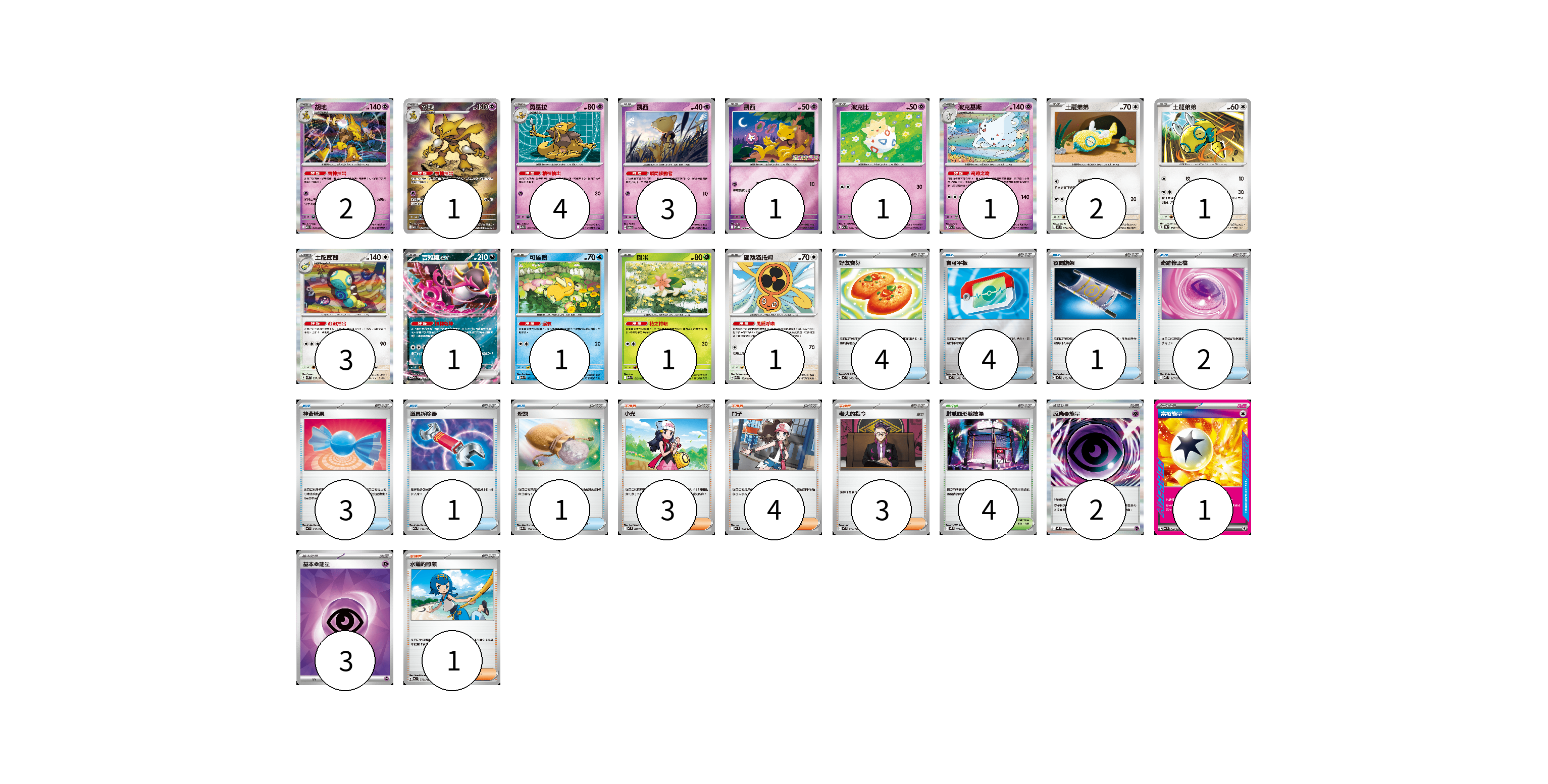 牌組構築方案 以此牌組為基礎新構築牌組 顯示卡面 顯示列表 寶可夢卡(23) 2 1 4 3 1 1 1 2 1 3 1 1 1 1 物品卡(16) 4 4 1 2 3 1 1 支援者卡(11) 3 4 3 1 競技場卡(4) 4 能量卡(6) 2 1 3 寶可夢卡(23) 卡牌名稱 張數 卡牌名稱 張數 胡地 M1S 038/063 02 胡地 M1S 071/063 01 勇基拉 M1S 037/063 04 凱西 SV6 047/101 03 凱西 M-P 004/M-P 01 波克比 M2a 064/193 01 波克基斯 M2a 066/193 01 土龍弟弟 MC 574/742 02 土龍弟弟 SV5K 056/071 01 土龍節節 SV5K 057/071 03 吉雉雞ex M2a 114/193 01 可達鴨 M2a 032/193 01 謝米 M2a 012/193 01 旋轉洛托姆 M2a 139/193 01 物品卡(16) 卡牌名稱 張數 卡牌名稱 張數 好友寶芬 MC 648/742 04 寶可平板 MC 662/742 04 夜間擔架 MC 670/742 01 奇跡修正檔 MBD 017/022 02 神奇糖果 MC 655/742 03 道具拆除器 M2a 151/193 01 聖灰 M2a 150/193 01 支援者卡(11) 卡牌名稱 張數 卡牌名稱 張數 小光 M2 077/080 03 鬥子 MC 718/742 04 老大的指令 MC 724/742 03 水蓮的照顧 MC 712/742 01 競技場卡(4) 卡牌名稱 張數 卡牌名稱 張數 對戰圓形競技場 M2 079/080 04 能量卡(6) 卡牌名稱 張數 卡牌名稱 張數 感應【超】能量 M3 079/080 02 富裕能量 MC 740/742 01 基本【超】能量 SVOD PSY 03 以此牌組為基礎新構築牌組 牌組編碼 MIwvOP-UXLQVG-QvaSNu copy 列印牌組單 牌組編碼已複製 分享至SNS