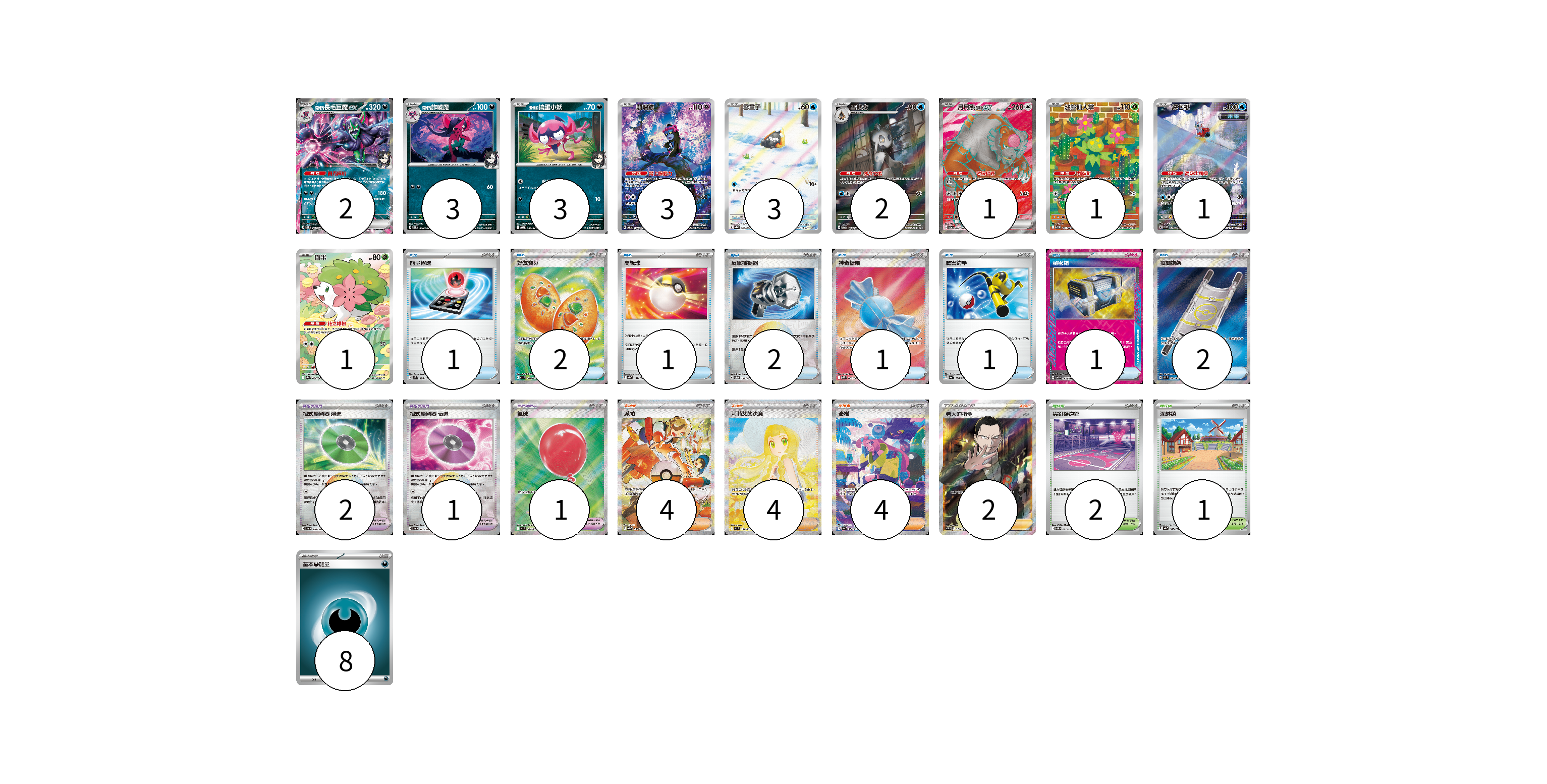 牌組構築方案 以此牌組為基礎新構築牌組 顯示卡面 顯示列表 寶可夢卡(20) 2 3 3 3 3 2 1 1 1 1 寶可夢道具(4) 2 1 1 物品卡(11) 1 2 1 2 1 1 1 2 支援者卡(14) 4 4 4 2 競技場卡(3) 2 1 能量卡(8) 8 寶可夢卡(20) 卡牌名稱 張數 卡牌名稱 張數 <瑪俐的>長毛巨魔ex SVOM 007/021 02 <瑪俐的>詐唬魔 SVOM 006/021 03 <瑪俐的>搗蛋小妖 SVOM 005/021 03 願增猿 SV6 107/101 03 雪童子 SV3a 063/062 03 雪妖女 SV6 104/101 02 月月熊 赫月 ex SV5a 084/066 01 沙鈴仙人掌 SV9 101/100 01 鐵包袱 SV4M 071/066 01 謝米 SV9a 066/063 01 寶可夢道具(4) 卡牌名稱 張數 卡牌名稱 張數 招式學習器 演進 SV8a 160/187 02 招式學習器 衰退 SV8a 161/187 01 氣球 M1L 084/063 01 物品卡(11) 卡牌名稱 張數 卡牌名稱 張數 能量輸送 SVM 128/175 01 好友寶芬 M1S 081/063 02 高級球 SV4a 161/190 01 反擊捕捉器 SV8a 139/187 02 神奇糖果 M1S 082/063 01 厲害釣竿 SV4a 158/190 01 秘密箱 SV6 092/101 01 夜間擔架 M1L 083/063 02 支援者卡(14) 卡牌名稱 張數 卡牌名稱 張數 派帕 SV4a 353/190 04 莉莉艾的決意 M1L 091/063 04 奇樹 SV4a 350/190 04 老大的指令(坂木) SC1b 170/153 02 競技場卡(3) 卡牌名稱 張數 卡牌名稱 張數 尖釘鎮道館 SVOM 021/021 02 深缽鎮 SV4a 185/190 01 能量卡(8) 卡牌名稱 張數 卡牌名稱 張數 基本惡能量 sv-p DAR 08 以此牌組為基礎新構築牌組 牌組編碼 MKgKTI-BGSSgj-uJOcVH copy 列印牌組單 牌組編碼已複製 分享至SNS
