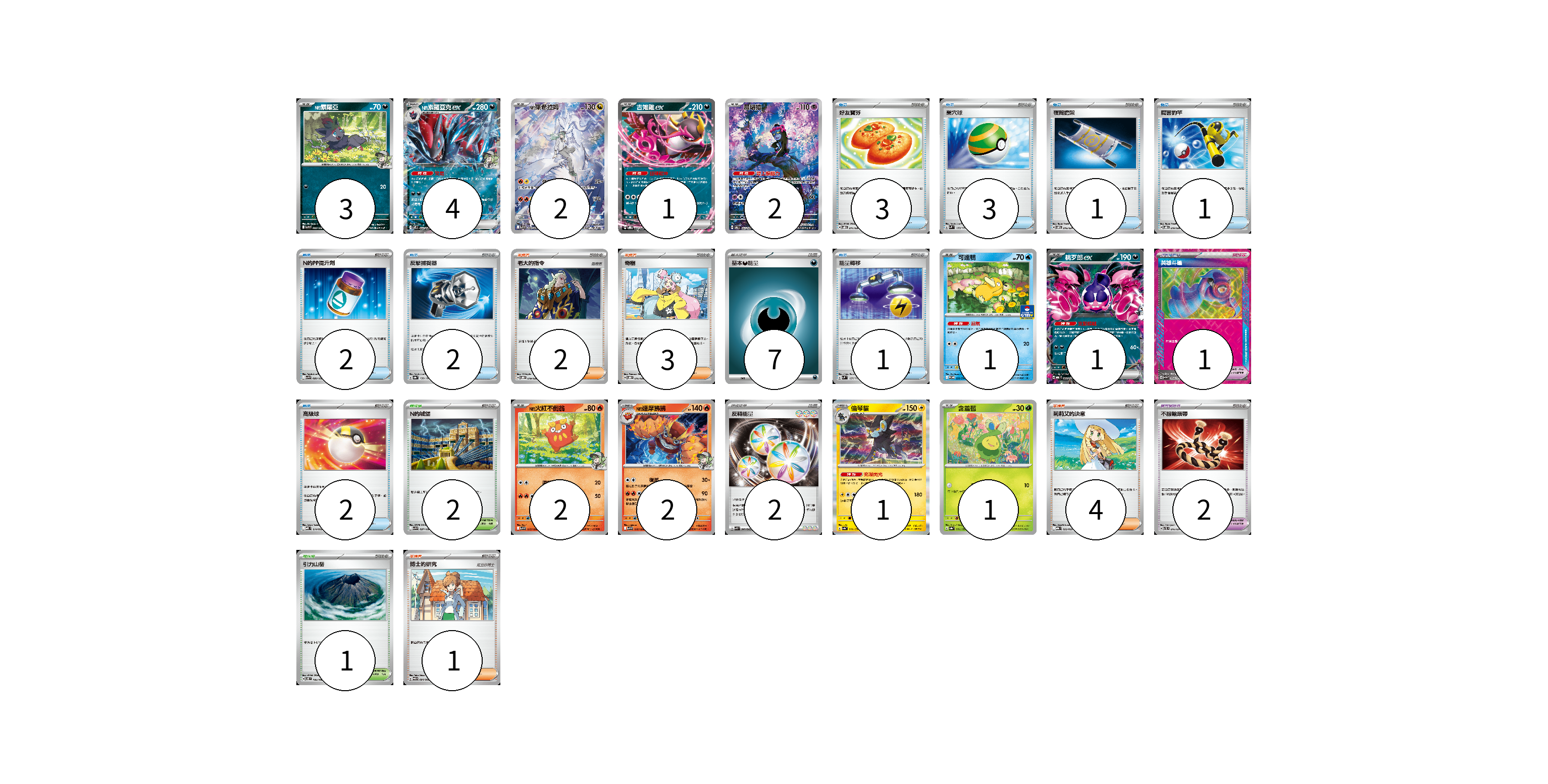 牌組構築方案 以此牌組為基礎新構築牌組 顯示卡面 顯示列表 寶可夢卡(20) 3 4 2 1 2 1 1 2 2 1 1 寶可夢道具(3) 1 2 物品卡(15) 3 3 1 1 2 2 1 2 支援者卡(10) 2 3 4 1 競技場卡(3) 2 1 能量卡(9) 7 2 寶可夢卡(20) 卡牌名稱 張數 卡牌名稱 張數 N的索羅亞 SV9 060/100 03 N的索羅亞克ex SV9 061/100 04 N的萊希拉姆 SV9 109/100 02 吉雉雞ex SVOD 004/020 01 願增猿 SV6 107/101 02 可達鴨 SV-P 220/SV-P 01 桃歹郎ex MBG 009/022 01 N的火紅不倒翁 SV9 015/100 02 N的達摩狒狒 SV9 016/100 02 倫琴貓 SV4a 061/190 01 含羞苞 SV8a 001/187 01 寶可夢道具(3) 卡牌名稱 張數 卡牌名稱 張數 英雄斗篷 SV5M 064/071 01 不服輸頭帶 SVTL 016/021 02 物品卡(15) 卡牌名稱 張數 卡牌名稱 張數 好友寶芬 SVOD 011/020 03 巢穴球 SVM 133/175 03 夜間擔架 SVOM 016/021 01 厲害釣竿 SVOD 010/020 01 N的PP提升劑 SV9 089/100 02 反擊捕捉器 SV8a 139/187 02 能量轉移 SVM 127/175 01 高級球 MBD 014/022 02 支援者卡(10) 卡牌名稱 張數 卡牌名稱 張數 老大的指令 SVOD 019/020 02 奇樹 SVOD 016/020 03 莉莉艾的決意 MBG 022/022 04 博士的研究 SV11B 084/086 01 競技場卡(3) 卡牌名稱 張數 卡牌名稱 張數 N的城堡 SV9 097/100 02 引力山岳 SV8 106/106 01 能量卡(9) 卡牌名稱 張數 卡牌名稱 張數 基本惡能量 sv-p DAR 07 反轉能量 SVK 041/042 02 以此牌組為基礎新構築牌組 牌組編碼 MLGAYK-RImUxI-xfUZUc copy 列印牌組單 牌組編碼已複製 分享至SNS