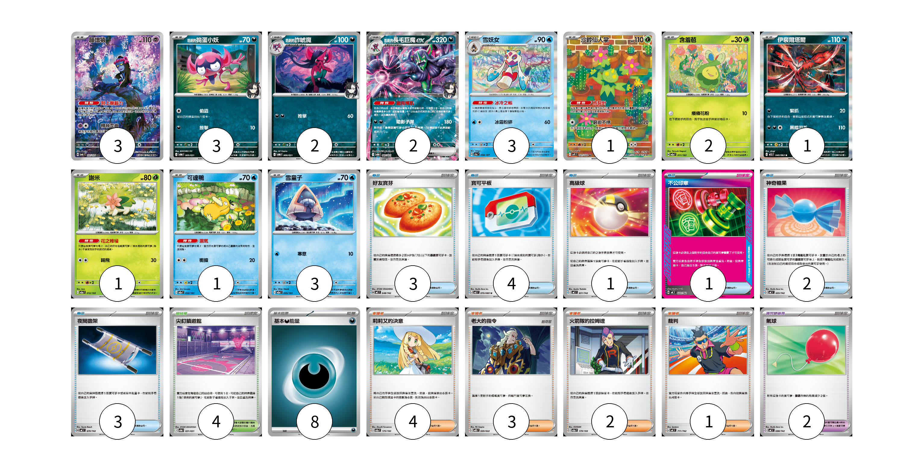 牌組構築方案 以此牌組為基礎新構築牌組 顯示卡面 顯示列表 寶可夢卡(22) 3 3 2 2 3 1 2 1 1 1 3 寶可夢道具(2) 2 物品卡(14) 3 4 1 1 2 3 支援者卡(10) 4 3 2 1 競技場卡(4) 4 能量卡(8) 8 寶可夢卡(22) 卡牌名稱 張數 卡牌名稱 張數 願增猿 SV6 107/101 03 <瑪俐的>搗蛋小妖 SVOM 005/021 03 <瑪俐的>詐唬魔 SVOM 006/021 02 <瑪俐的>長毛巨魔ex SVOM 007/021 02 雪妖女 SV8a 038/187 03 沙鈴仙人掌 SV9 101/100 01 含羞苞 M2a 011/193 02 伊裴爾塔爾 M1L 040/063 01 謝米 M2a 012/193 01 可達鴨 M2a 032/193 01 雪童子 M2a 035/193 03 寶可夢道具(2) 卡牌名稱 張數 卡牌名稱 張數 氣球 MC 688/742 02 物品卡(14) 卡牌名稱 張數 卡牌名稱 張數 好友寶芬 MC 648/742 03 寶可平板 M3 070/080 04 高級球 MC 651/742 01 不公印章 MC 633/742 01 神奇糖果 MC 655/742 02 夜間擔架 MC 670/742 03 支援者卡(10) 卡牌名稱 張數 卡牌名稱 張數 莉莉艾的決意 M2a 175/193 04 老大的指令 MBD 020/022 03 火箭隊的拉姆達 M2a 179/193 02 裁判 MC 711/742 01 競技場卡(4) 卡牌名稱 張數 卡牌名稱 張數 尖釘鎮道館 SVOM 021/021 04 能量卡(8) 卡牌名稱 張數 卡牌名稱 張數 基本惡能量 sv-p DAR 08 以此牌組為基礎新構築牌組 牌組編碼 MLdFNe-mnTZSG-RbHrTu copy 列印牌組單 牌組編碼已複製 分享至SNS