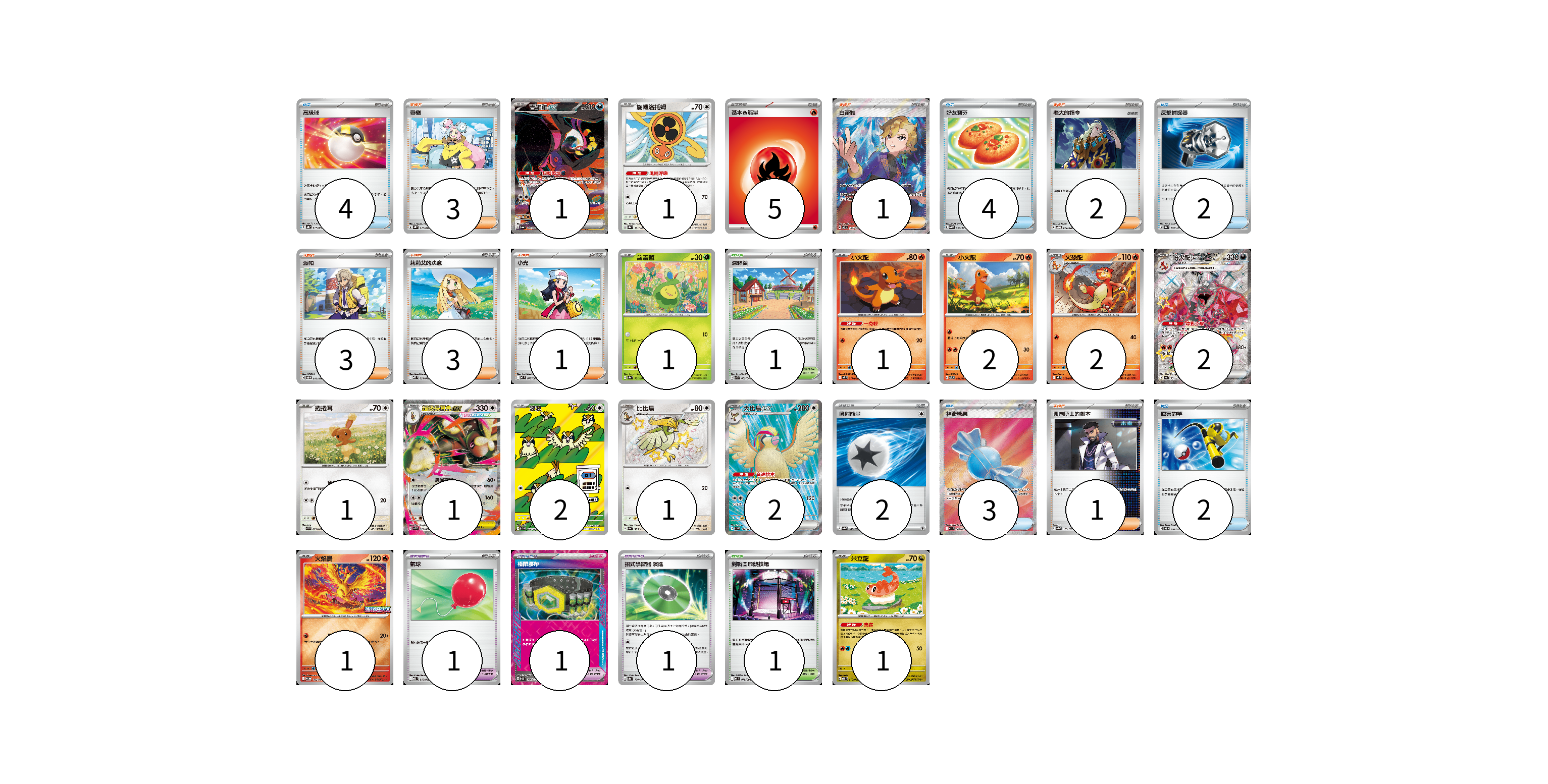 牌組構築方案 以此牌組為基礎新構築牌組 顯示卡面 顯示列表 寶可夢卡(19) 1 1 1 1 2 2 2 1 1 2 1 2 1 1 寶可夢道具(3) 1 1 1 物品卡(15) 4 4 2 3 2 支援者卡(14) 3 1 2 3 3 1 1 競技場卡(2) 1 1 能量卡(7) 5 2 寶可夢卡(19) 卡牌名稱 張數 卡牌名稱 張數 吉雉雞ex SV6a 089/064 01 旋轉洛托姆 SV8a 131/187 01 含羞苞 SV8a 001/187 01 小火龍 M2 011/080 01 小火龍 SVTL 001/021 02 火恐龍 M2 012/080 02 噴火龍ex SV4a 331/190 02 捲捲耳 M2 071/080 01 超級長耳兔ex M2 072/080 01 波波 SV3 118/108 02 比比鳥 SV4a 305/190 01 大比鳥ex SV3 128/108 02 火焰鳥 M-P 022/M-P 01 米立龍 MBD 010/022 01 寶可夢道具(3) 卡牌名稱 張數 卡牌名稱 張數 氣球 MBD 018/022 01 極限腰帶 SV5K 066/071 01 招式學習器 演進 SV8a 160/187 01 物品卡(15) 卡牌名稱 張數 卡牌名稱 張數 高級球 SVHK 013/022 04 好友寶芬 SV5K 063/071 04 反擊捕捉器 SV8a 139/187 02 神奇糖果 M1S 082/063 03 厲害釣竿 SVOD 010/020 02 支援者卡(14) 卡牌名稱 張數 卡牌名稱 張數 奇樹 SVHK 019/022 03 白蕾雅 SV7 126/102 01 老大的指令 SVOD 019/020 02 派帕 SVOD 018/020 03 莉莉艾的決意 MBD 021/022 03 小光 M2 077/080 01 弗圖博士的劇本 SV8a 175/187 01 競技場卡(2) 卡牌名稱 張數 卡牌名稱 張數 深缽鎮 SVK 039/042 01 對戰圓形競技場 M2 079/080 01 能量卡(7) 卡牌名稱 張數 卡牌名稱 張數 基本【火】能量 SVF FIR 05 噴射能量 SV8a 185/187 02 以此牌組為基礎新構築牌組 牌組編碼 MMPMAd-fCJxUI-OSYssr copy 列印牌組單 牌組編碼已複製 分享至SNS