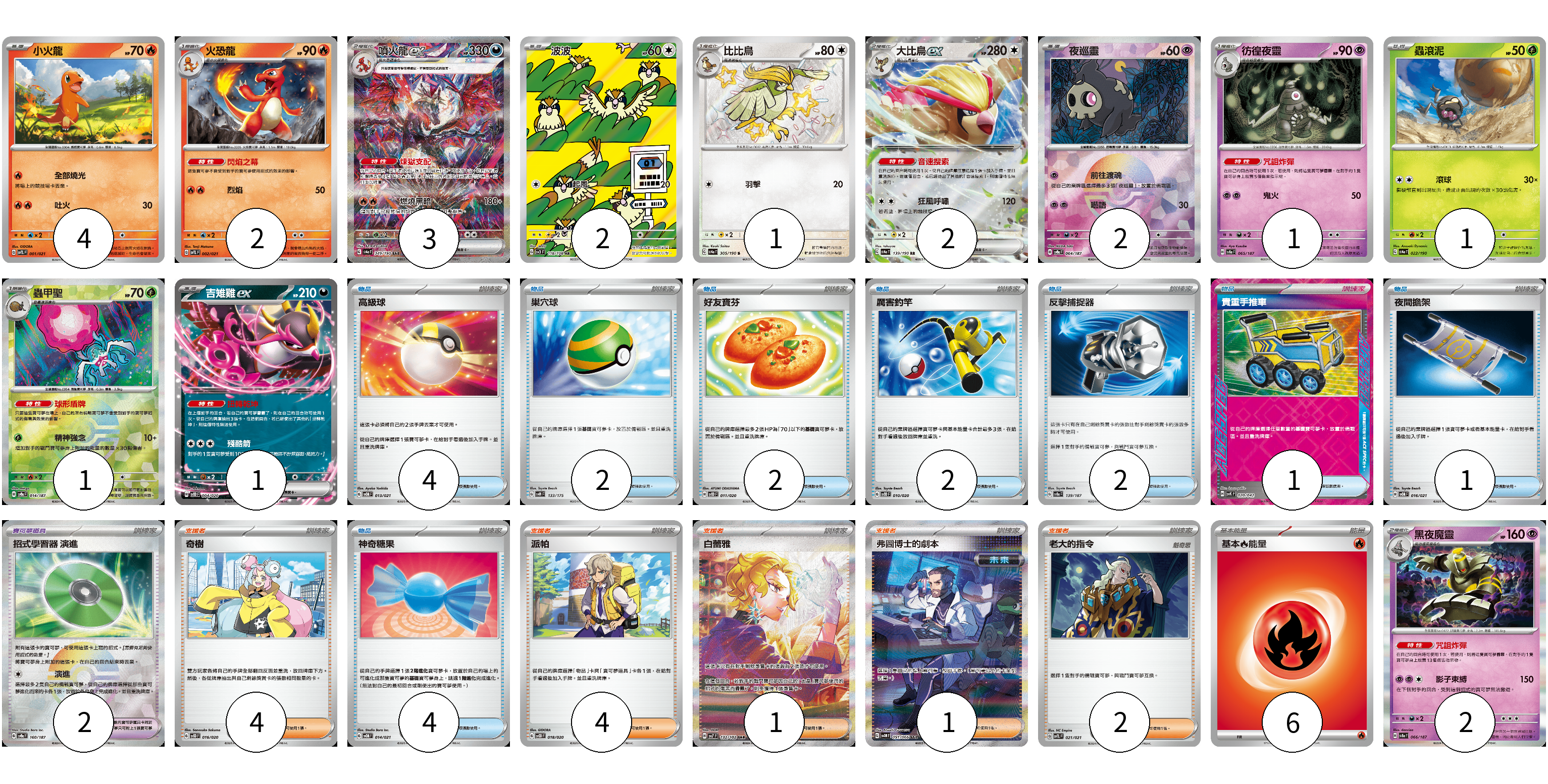 牌組構築方案 以此牌組為基礎新構築牌組 顯示卡面 顯示列表 寶可夢卡(22) 4 2 3 2 1 2 2 1 1 1 1 2 寶可夢道具(2) 2 物品卡(18) 4 2 2 2 2 1 1 4 支援者卡(12) 4 4 1 1 2 能量卡(6) 6 寶可夢卡(22) 卡牌名稱 張數 卡牌名稱 張數 小火龍 SVTL 001/021 04 火恐龍 SVTL 002/021 02 噴火龍ex SV4a 349/190 03 波波 SV3 118/108 02 比比鳥 SV4a 305/190 01 大比鳥ex SV4a 139/190 02 夜巡靈 SV8a 064/187 02 彷徨夜靈 SV8a 065/187 01 蟲滾泥 SV4a 022/190 01 蟲甲聖 SV8a 014/187 01 吉雉雞ex SVOD 004/020 01 黑夜魔靈 SV8a 066/187 02 寶可夢道具(2) 卡牌名稱 張數 卡牌名稱 張數 招式學習器 演進 SV8a 160/187 02 物品卡(18) 卡牌名稱 張數 卡牌名稱 張數 高級球 SVOM 013/021 04 巢穴球 SVM 133/175 02 好友寶芬 SVOD 011/020 02 厲害釣竿 SVOD 010/020 02 反擊捕捉器 SV8a 139/187 02 貴重手推車 SVK 020/042 01 夜間擔架 SVOM 016/021 01 神奇糖果 SVOM 014/021 04 支援者卡(12) 卡牌名稱 張數 卡牌名稱 張數 奇樹 SVOD 016/020 04 派帕 SVOD 018/020 04 白蕾雅 SV7 132/102 01 弗圖博士的劇本 SV4M 091/066 01 老大的指令 SVTL 021/021 02 能量卡(6) 卡牌名稱 張數 卡牌名稱 張數 基本【火】能量 SVTL FIR 06 以此牌組為基礎新構築牌組 牌組編碼 MMYKLw-lrbCBn-etBRIi copy 列印牌組單 牌組編碼已複製 分享至SNS