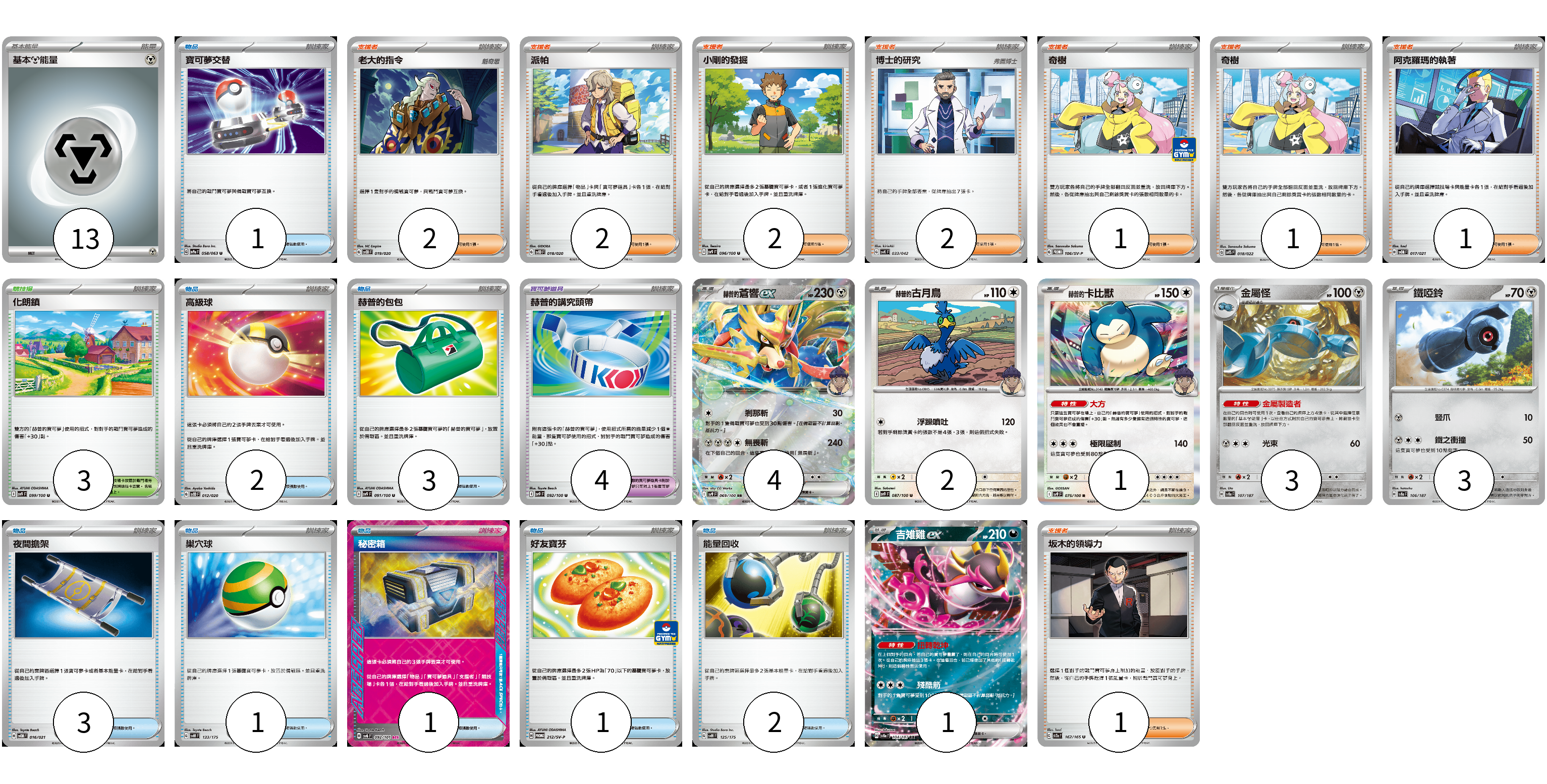 牌組構築方案 以此牌組為基礎新構築牌組 顯示卡面 顯示列表 寶可夢卡(14) 4 2 1 3 3 1 寶可夢道具(4) 4 物品卡(14) 1 2 3 3 1 1 1 2 支援者卡(12) 2 2 2 2 1 1 1 1 競技場卡(3) 3 能量卡(13) 13 寶可夢卡(14) 卡牌名稱 張數 卡牌名稱 張數 赫普的蒼響ex SV9 069/100 04 赫普的古月鳥 SV9 087/100 02 赫普的卡比獸 SV9 075/100 01 金屬怪 SV8a 107/187 03 鐵啞鈴 SV8a 106/187 03 吉雉雞ex SV8a 104/187 01 寶可夢道具(4) 卡牌名稱 張數 卡牌名稱 張數 赫普的講究頭帶 SV9 092/100 04 物品卡(14) 卡牌名稱 張數 卡牌名稱 張數 寶可夢交替 SV9a 058/063 01 高級球 SVOD 012/020 02 赫普的包包 SV9 091/100 03 夜間擔架 SVOM 016/021 03 巢穴球 SVM 133/175 01 秘密箱 SV6 092/101 01 好友寶芬 SV-P 212/SV-P 01 能量回收 SVM 125/175 02 支援者卡(12) 卡牌名稱 張數 卡牌名稱 張數 老大的指令 SVOD 019/020 02 派帕 SVOD 018/020 02 小剛的發掘 SV9 096/100 02 博士的研究 SVK 033/042 02 奇樹 SV-P 106/SV-P 01 奇樹 SVTS 018/022 01 阿克羅瑪的執著 SVOM 017/021 01 坂木的領導力 SV2a 162/165 01 競技場卡(3) 卡牌名稱 張數 卡牌名稱 張數 化朗鎮 SV9 099/100 03 能量卡(13) 卡牌名稱 張數 卡牌名稱 張數 基本【鋼】能量 SVD MET 13 以此牌組為基礎新構築牌組 牌組編碼 MOEZGA-tCEIWd-MDYWVL copy 列印牌組單 牌組編碼已複製 分享至SNS