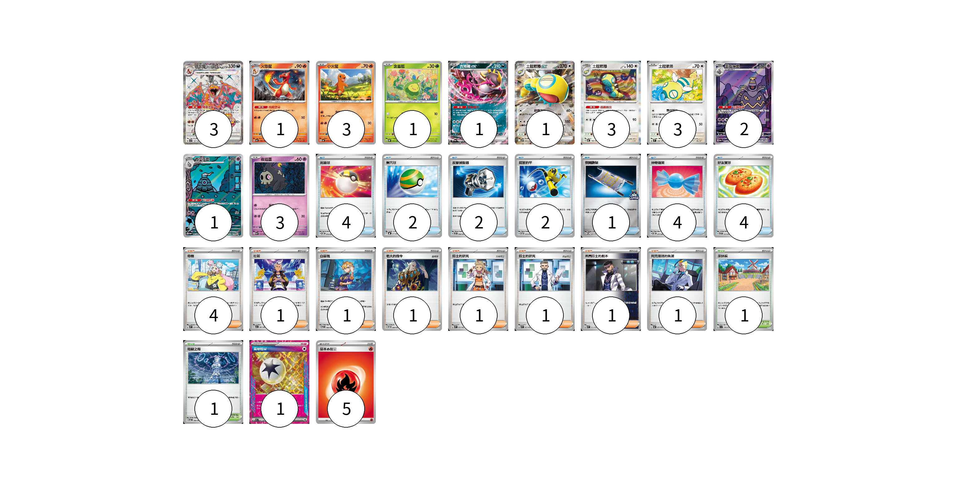 牌組構築方案 以此牌組為基礎新構築牌組 顯示卡面 顯示列表 寶可夢卡(22) 3 1 3 1 1 1 3 3 2 1 3 物品卡(19) 4 2 2 2 1 4 4 支援者卡(11) 4 1 1 1 1 1 1 1 競技場卡(2) 1 1 能量卡(6) 1 5 寶可夢卡(22) 卡牌名稱 張數 卡牌名稱 張數 噴火龍ex SV3 125/108 03 火恐龍 SV4a 026/190 01 小火龍 SV4a 025/190 03 含羞苞 SV8a 001/187 01 吉雉雞ex SV6a 038/064 01 土龍節節ex SV9 079/100 01 土龍節節 SV8a 130/187 03 土龍弟弟 SVM 095/175 03 黑夜魔靈 SV6a 070/064 02 彷徨夜靈 SV6a 069/064 01 夜巡靈 SV6a 018/064 03 物品卡(19) 卡牌名稱 張數 卡牌名稱 張數 高級球 SVOM 013/021 04 巢穴球 SVHK 012/022 02 反擊捕捉器 SVTS 009/022 02 厲害釣竿 SVTM 010/022 02 夜間擔架 SV-P 204/SV-P 01 神奇糖果 SVOM 014/021 04 好友寶芬 SVTS 012/022 04 支援者卡(11) 卡牌名稱 張數 卡牌名稱 張數 奇樹 SVK 031/042 04 杜若 SV7a 060/064 01 白蕾雅 SV7 100/102 01 老大的指令 SVTM 020/022 01 博士的研究 SVK 032/042 01 博士的研究 SVK 033/042 01 弗圖博士的劇本 SVK 034/042 01 阿克羅瑪的執著 SV6a 059/064 01 競技場卡(2) 卡牌名稱 張數 卡牌名稱 張數 深缽鎮 SV1a 070/073 01 阻礙之塔 SV6 100/101 01 能量卡(6) 卡牌名稱 張數 卡牌名稱 張數 富裕能量 SV7a 064/064 01 基本【火】能量 SVTL FIR 05 以此牌組為基礎新構築牌組 牌組編碼 MPTmsB-hVEimp-MnROZT copy 列印牌組單 牌組編碼已複製 分享至SNS