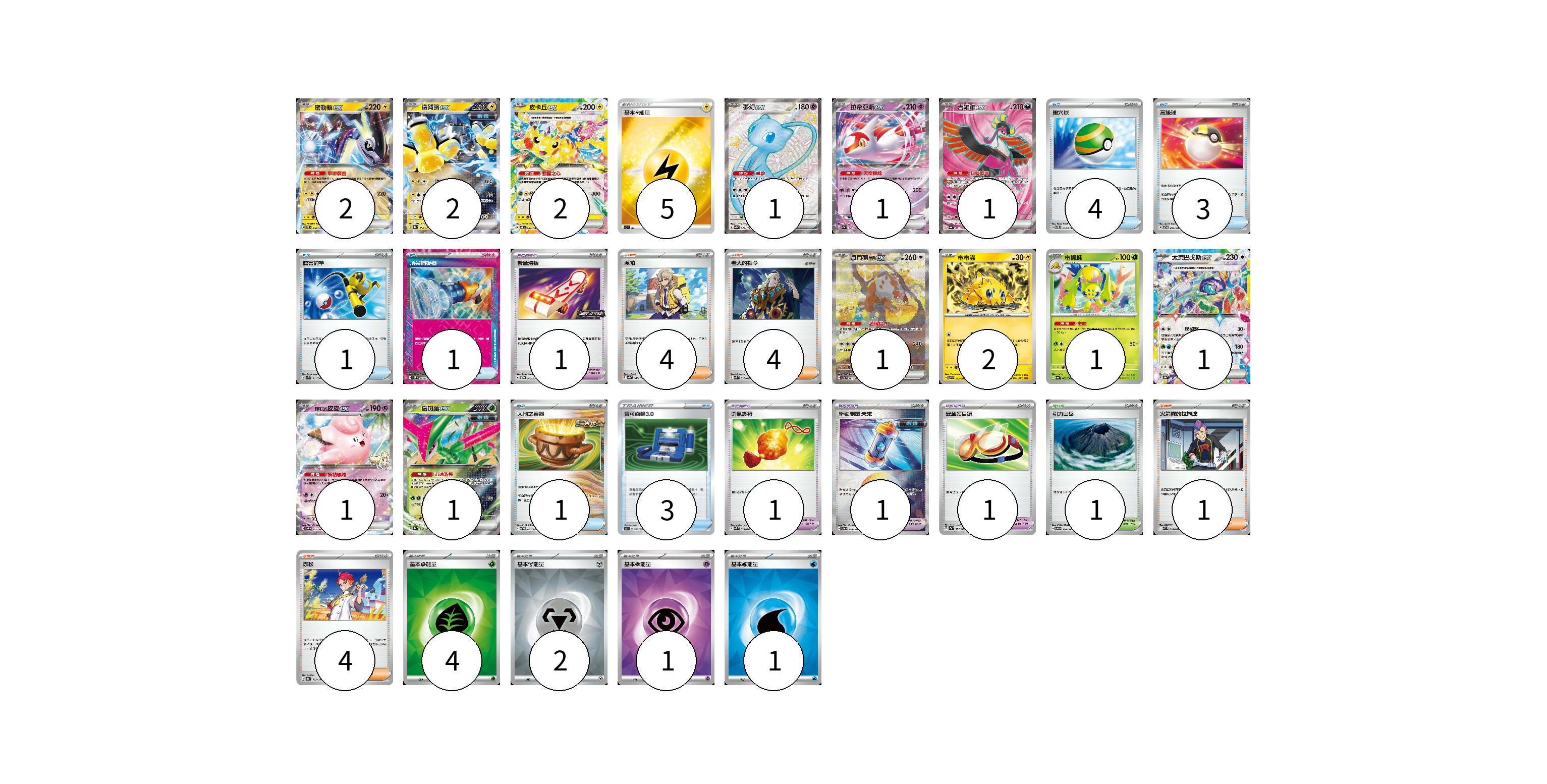 牌組構築方案 以此牌組為基礎新構築牌組 顯示卡面 顯示列表 寶可夢卡(16) 2 2 2 1 1 1 1 2 1 1 1 1 寶可夢道具(4) 1 1 1 1 物品卡(13) 4 3 1 1 1 3 支援者卡(13) 4 4 1 4 競技場卡(1) 1 能量卡(13) 5 4 2 1 1 寶可夢卡(16) 卡牌名稱 張數 卡牌名稱 張數 密勒頓ex SVTR 008/021 02 鐵臂膀ex SV8a 054/187 02 皮卡丘ex SV8 033/106 02 夢幻ex SV4a 327/190 01 拉帝亞斯ex SV7a 019/064 01 吉雉雞ex SV6a 081/064 01 月月熊 赫月 ex SV5a 091/066 01 電電蟲 SV7 032/102 02 電蜘蛛 SV6a 002/064 01 太樂巴戈斯ex SV8a 136/187 01 莉莉艾的皮皮ex SV9 033/100 01 鐵斑葉ex SV8a 016/187 01 寶可夢道具(4) 卡牌名稱 張數 卡牌名稱 張數 緊急滑板 SV-P 140/SV-P 01 勇氣護符 SVK 024/042 01 驅勁能量 未來 SV8a 158/187 01 安全護目鏡 SV2a 157/165 01 物品卡(13) 卡牌名稱 張數 卡牌名稱 張數 巢穴球 SVTG 012/019 04 高級球 SVTG 013/019 03 厲害釣竿 SVK 011/042 01 頂尖捕捉器 SV5M 062/071 01 大地之容器 SVTG 010/019 01 寶可齒輪3.0 SJ 021/028 03 支援者卡(13) 卡牌名稱 張數 卡牌名稱 張數 派帕 SV4a 180/190 04 老大的指令 SVK 036/042 04 火箭隊的拉姆達 SV10 094/098 01 赤松 SV8a 163/187 04 競技場卡(1) 卡牌名稱 張數 卡牌名稱 張數 引力山岳 SV8 106/106 01 能量卡(13) 卡牌名稱 張數 卡牌名稱 張數 基本【雷】能量 SO LIG 05 基本【草】能量 SVM GRA 04 基本【鋼】能量 SVM MET 02 基本【超】能量 SVM PSY 01 基本【水】能量 SVM WAT 01 以此牌組為基礎新構築牌組 牌組編碼 MQDpkq-yfHzWW-jfXMly copy 列印牌組單 牌組編碼已複製 分享至SNS