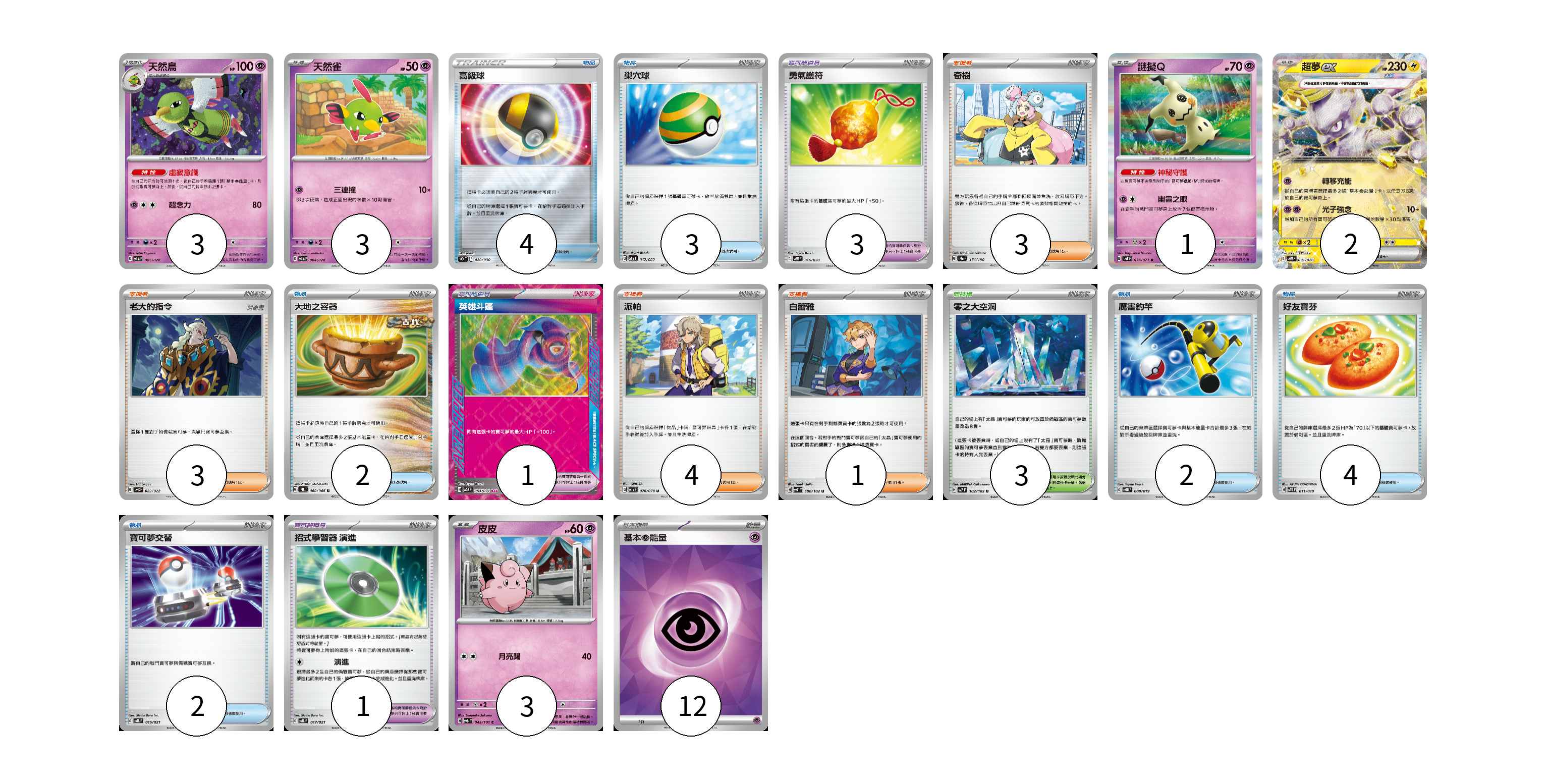 牌組構築方案 以此牌組為基礎新構築牌組 顯示卡面 顯示列表 寶可夢卡(12) 3 3 1 2 3 寶可夢道具(5) 3 1 1 物品卡(17) 4 3 2 2 4 2 支援者卡(11) 3 3 4 1 競技場卡(3) 3 能量卡(12) 12 寶可夢卡(12) 卡牌名稱 張數 卡牌名稱 張數 天然鳥 SVEM 005/020 03 天然雀 SVEM 004/020 03 謎擬Q SV2P 034/071 01 超夢ex SVEM 001/020 02 皮皮 SV6 045/101 03 寶可夢道具(5) 卡牌名稱 張數 卡牌名稱 張數 勇氣護符 SVEM 016/020 03 英雄斗篷 SV5M 064/071 01 招式學習器 演進 SVTL 017/021 01 物品卡(17) 卡牌名稱 張數 卡牌名稱 張數 高級球 SO 020/030 04 巢穴球 SVHM 012/022 03 大地之容器 SV4K 060/066 02 厲害釣竿 SVTG 009/019 02 好友寶芬 SVTG 011/019 04 寶可夢交替 SVTL 015/021 02 支援者卡(11) 卡牌名稱 張數 卡牌名稱 張數 奇樹 SV4a 174/190 03 老大的指令 SVHK 022/022 03 派帕 SV1V 076/078 04 白蕾雅 SV7 100/102 01 競技場卡(3) 卡牌名稱 張數 卡牌名稱 張數 零之大空洞 SV7 102/102 03 能量卡(12) 卡牌名稱 張數 卡牌名稱 張數 基本【超】能量 SVK PSY 12 以此牌組為基礎新構築牌組 牌組編碼 MVAfmQ-cdissX-iNnyEJ copy 列印牌組單 牌組編碼已複製 分享至SNS