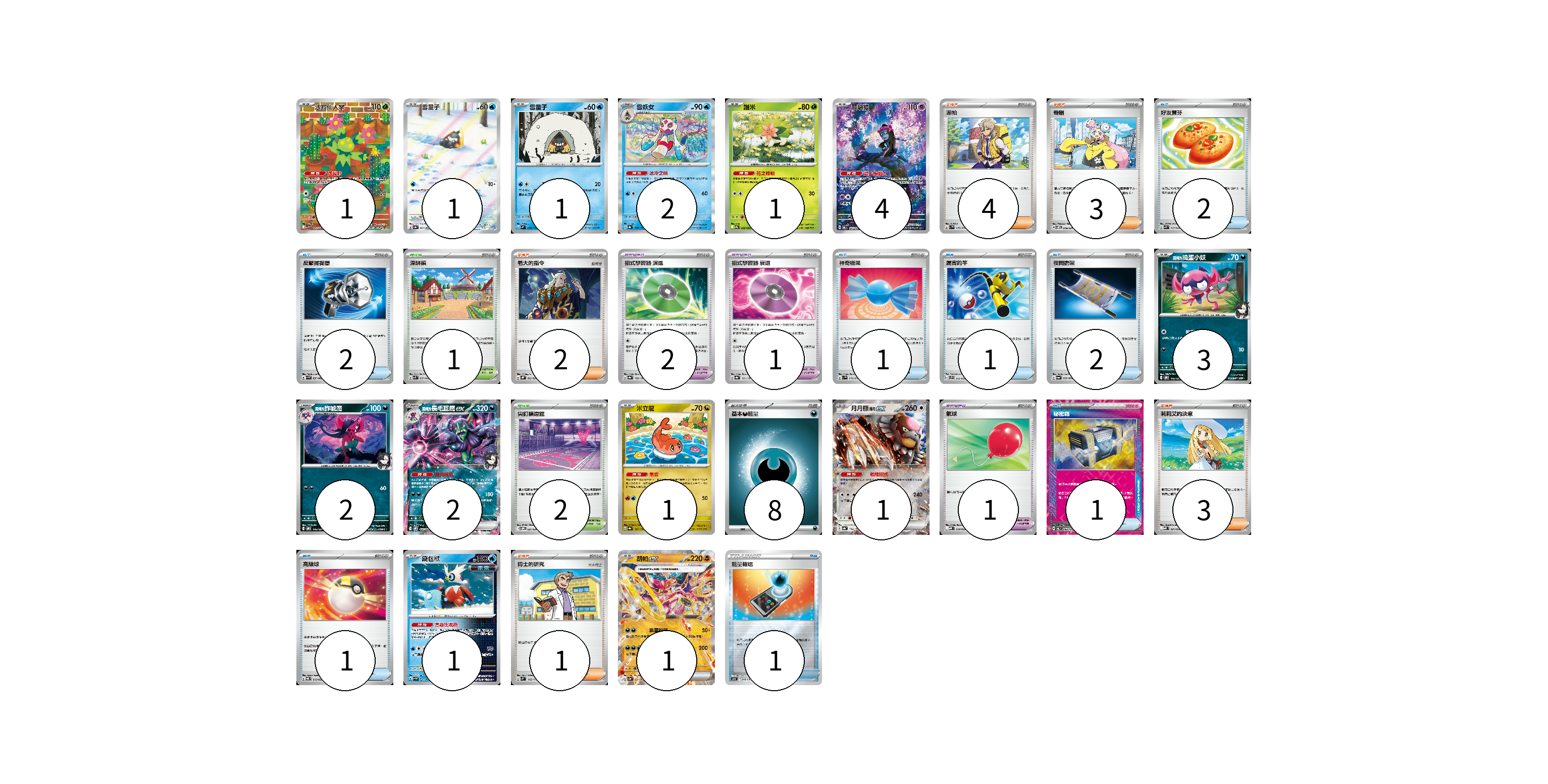 牌組構築方案 以此牌組為基礎新構築牌組 顯示卡面 顯示列表 寶可夢卡(21) 1 1 1 2 1 4 3 2 2 1 1 1 1 寶可夢道具(4) 2 1 1 物品卡(11) 2 2 1 1 2 1 1 1 支援者卡(13) 4 3 2 3 1 競技場卡(3) 1 2 能量卡(8) 8 寶可夢卡(21) 卡牌名稱 張數 卡牌名稱 張數 沙鈴仙人掌 SV9 101/100 01 雪童子 SV3a 063/062 01 雪童子 SVM 034/175 01 雪妖女 SV8a 038/187 02 謝米 SV9a 006/063 01 願增猿 SV6 107/101 04 <瑪俐的>搗蛋小妖 SVOM 005/021 03 <瑪俐的>詐唬魔 SVOM 006/021 02 <瑪俐的>長毛巨魔ex SVOM 007/021 02 米立龍 SV8a 121/187 01 月月熊 赫月ex SV8a 134/187 01 鐵包袱 SV4M 020/066 01 胡帕ex SV3a 029/062 01 寶可夢道具(4) 卡牌名稱 張數 卡牌名稱 張數 招式學習器 演進 SV8a 160/187 02 招式學習器 衰退 SV8a 161/187 01 氣球 MBD 018/022 01 物品卡(11) 卡牌名稱 張數 卡牌名稱 張數 好友寶芬 SVK 015/042 02 反擊捕捉器 SV4M 059/066 02 神奇糖果 SV1V 072/078 01 厲害釣竿 SVF 013/038 01 夜間擔架 SV6a 056/064 02 秘密箱 SV6 092/101 01 高級球 SVQL 015/022 01 能量輸送 SO 018/030 01 支援者卡(13) 卡牌名稱 張數 卡牌名稱 張數 派帕 SV1V 076/078 04 奇樹 SVOM 018/021 03 老大的指令 SVHK 022/022 02 莉莉艾的決意 MBD 021/022 03 博士的研究 SVM 162/175 01 競技場卡(3) 卡牌名稱 張數 卡牌名稱 張數 深缽鎮 SVK 039/042 01 尖釘鎮道館 SVOM 021/021 02 能量卡(8) 卡牌名稱 張數 卡牌名稱 張數 基本【惡】能量 MBG DAR 08 以此牌組為基礎新構築牌組 牌組編碼 MXAJsP-tqCDaL-fcqxGk copy 列印牌組單 牌組編碼已複製 分享至SNS