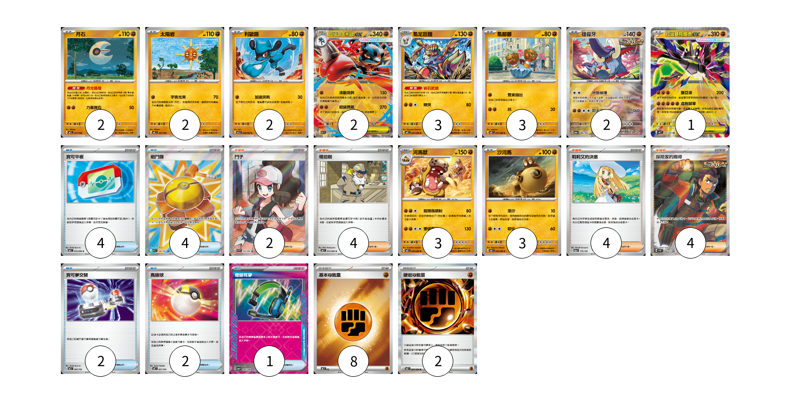 牌組構築方案 以此牌組為基礎新構築牌組 顯示卡面 顯示列表 寶可夢卡(23) 2 2 2 2 3 3 2 1 3 3 物品卡(13) 4 4 2 2 1 支援者卡(14) 2 4 4 4 能量卡(10) 8 2 寶可夢卡(23) 卡牌名稱 張數 卡牌名稱 張數 月石 MC 371/742 02 太陽岩 MC 372/742 02 利歐路 M1L 028/063 02 超級路卡利歐ex M1L 029/063 02 龜足巨鎧 M3 042/080 03 龜腳腳 M3 041/080 03 雄偉牙 SV8a 086/187 02 超級基格爾德ex M3 046/080 01 河馬獸 M3 039/080 03 沙河馬 M3 038/080 03 物品卡(13) 卡牌名稱 張數 卡牌名稱 張數 寶可平板 M3 070/080 04 戰鬥鑼 M1L 082/063 04 寶可夢交替 MC 663/742 02 高級球 MC 651/742 02 奇跡耳麥 SV8 097/106 01 支援者卡(14) 卡牌名稱 張數 卡牌名稱 張數 鬥子 SV11W 166/086 02 塔拉剛 M3 073/080 04 莉莉艾的決意 M2a 175/193 04 探險家的嚮導 SV5K 090/071 04 能量卡(10) 卡牌名稱 張數 卡牌名稱 張數 基本【鬥】能量 MC FIG 08 硬岩【鬥】能量 M3 080/080 02 以此牌組為基礎新構築牌組 牌組編碼 MYSaPb-dHRiDt-OGySFa copy 列印牌組單 牌組編碼已複製 分享至SNS