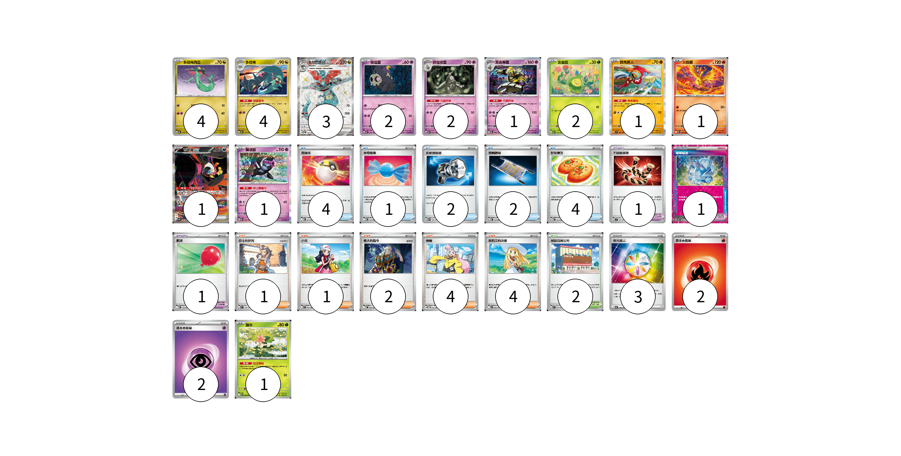 牌組構築方案 以此牌組為基礎新構築牌組 顯示卡面 顯示列表 寶可夢卡(23) 4 4 3 2 2 1 2 1 1 1 1 1 寶可夢道具(3) 1 1 1 物品卡(13) 4 1 2 2 4 支援者卡(12) 1 1 2 4 4 競技場卡(2) 2 能量卡(7) 3 2 2 寶可夢卡(23) 卡牌名稱 張數 卡牌名稱 張數 多龍梅西亞 SV8a 118/187 04 多龍奇 SV8a 119/187 04 多龍巴魯托ex SV6 120/101 03 夜巡靈 SV8a 064/187 02 彷徨夜靈 SV8a 065/187 02 黑夜魔靈 SV8a 066/187 01 含羞苞 SV8a 001/187 02 摔角鷹人 SV1S 045/078 01 火焰鳥 M2 014/080 01 吉雉雞ex SV6a 089/064 01 願增猿 SV8a 075/187 01 謝米 SV9a 006/063 01 寶可夢道具(3) 卡牌名稱 張數 卡牌名稱 張數 不服輸頭帶 SV1S 073/078 01 璀璨結晶 SV7 094/102 01 氣球 MBD 018/022 01 物品卡(13) 卡牌名稱 張數 卡牌名稱 張數 高級球 MBD 014/022 04 神奇糖果 MBG 013/022 01 反擊捕捉器 SV8a 139/187 02 夜間擔架 MBD 016/022 02 好友寶芬 MBD 013/022 04 支援者卡(12) 卡牌名稱 張數 卡牌名稱 張數 博士的研究 SVM 170/175 01 小光 M2 077/080 01 老大的指令 MBD 020/022 02 奇樹 SVOD 016/020 04 莉莉艾的決意 M1L 062/063 04 競技場卡(2) 卡牌名稱 張數 卡牌名稱 張數 城鎮百貨公司 SVK 037/042 02 能量卡(7) 卡牌名稱 張數 卡牌名稱 張數 夜光能量 SV4a 190/190 03 基本【火】能量 SVEL FIR 02 基本【超】能量 SVEM PSY 02 以此牌組為基礎新構築牌組 牌組編碼 MYsppT-atYfOd-eOfBLQ copy 列印牌組單 牌組編碼已複製 分享至SNS