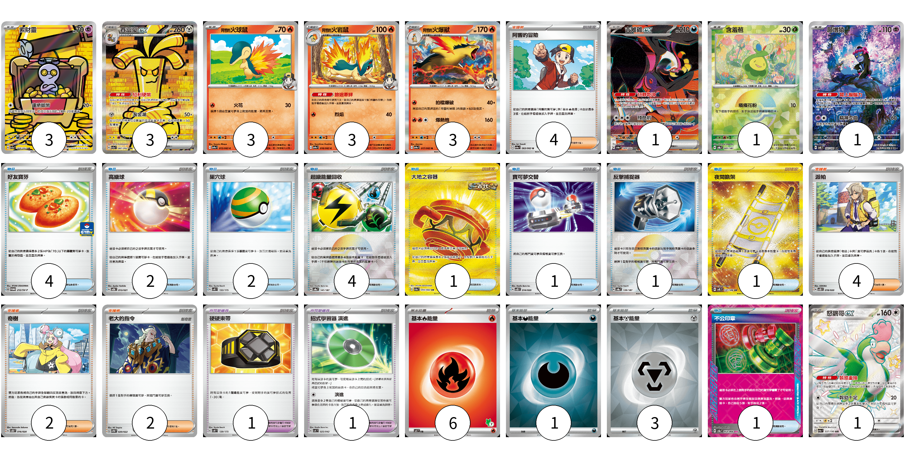 牌組構築方案 以此牌組為基礎新構築牌組 顯示卡面 顯示列表 寶可夢卡(19) 3 3 3 3 3 1 1 1 1 寶可夢道具(2) 1 1 物品卡(17) 4 2 2 4 1 1 1 1 1 支援者卡(12) 4 4 2 2 能量卡(10) 6 1 3 寶可夢卡(19) 卡牌名稱 張數 卡牌名稱 張數 索財靈 SV3a 068/062 03 賽富豪ex SV3a 087/062 03 <阿響的>火球鼠 SV9a 015/063 03 <阿響的>火岩鼠 SV9a 016/063 03 <阿響的>火爆獸 SV9a 017/063 03 吉雉雞ex SV6a 089/064 01 含羞苞 SV8a 001/187 01 願增猿 SV6 107/101 01 怒鸚哥ex SV4a 337/190 01 寶可夢道具(2) 卡牌名稱 張數 卡牌名稱 張數 硬硬束帶 SVM 139/175 01 招式學習器 演進 SVK 025/042 01 物品卡(17) 卡牌名稱 張數 卡牌名稱 張數 好友寶芬 SV-P 212/SV-P 04 高級球 SVOM 013/021 02 巢穴球 SVM 133/175 02 超級能量回收 SV8a 141/187 04 大地之容器 SV6a 093/064 01 寶可夢交替 SVOD 014/020 01 反擊捕捉器 SV8a 139/187 01 夜間擔架 SV8 137/106 01 不公印章 SV5a 053/066 01 支援者卡(12) 卡牌名稱 張數 卡牌名稱 張數 阿響的冒險 SV9a 063/063 04 派帕 SVOD 018/020 04 奇樹 SVOD 016/020 02 老大的指令 SVTM 020/022 02 能量卡(10) 卡牌名稱 張數 卡牌名稱 張數 基本【火】能量 SVI FIR 06 基本【惡】能量 SVOM DAR 01 基本【鋼】能量 SVOD MET 03 以此牌組為基礎新構築牌組 牌組編碼 MYvUVp-GZGpyq-CXXpZm copy 列印牌組單 牌組編碼已複製 分享至SNS