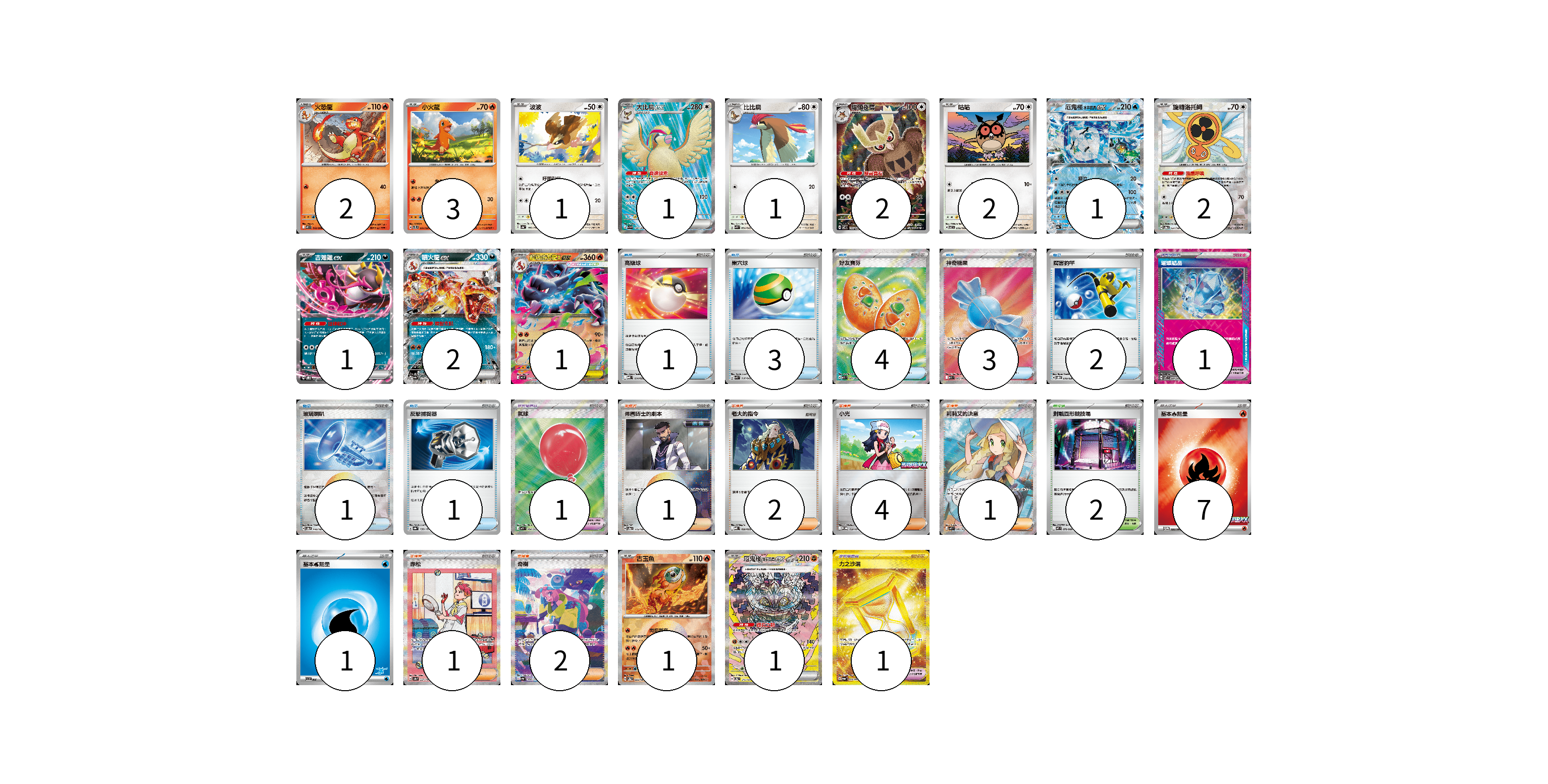 牌組構築方案 以此牌組為基礎新構築牌組 顯示卡面 顯示列表 寶可夢卡(21) 2 3 1 1 1 2 2 1 2 1 2 1 1 1 寶可夢道具(3) 1 1 1 物品卡(15) 1 3 4 3 2 1 1 支援者卡(11) 1 2 4 1 1 2 競技場卡(2) 2 能量卡(8) 7 1 寶可夢卡(21) 卡牌名稱 張數 卡牌名稱 張數 火恐龍 M2 012/080 02 小火龍 SVTL 001/021 03 波波 SV4a 137/190 01 大比鳥ex SV3 128/108 01 比比鳥 SVK 004/042 01 貓頭夜鷹 SV7 114/102 02 咕咕 SV7 076/102 02 厄鬼椪 水井面具ex SV8a 050/187 01 旋轉洛托姆 SV8a 131/187 02 吉雉雞ex SVOD 004/020 01 噴火龍ex SV4a 115/190 02 超級噴火龍Xex M2 013/080 01 古玉魚 SV8a 025/187 01 厄鬼椪 礎石面具ex SV8a 216/187 01 寶可夢道具(3) 卡牌名稱 張數 卡牌名稱 張數 璀璨結晶 SV7 094/102 01 氣球 M1L 084/063 01 力之沙漏 SV6a 094/064 01 物品卡(15) 卡牌名稱 張數 卡牌名稱 張數 高級球 MBD 014/022 01 巢穴球 SVK 016/042 03 好友寶芬 M1S 081/063 04 神奇糖果 M1S 082/063 03 厲害釣竿 SVOD 010/020 02 玻璃喇叭 SV8a 140/187 01 反擊捕捉器 SV8a 139/187 01 支援者卡(11) 卡牌名稱 張數 卡牌名稱 張數 弗圖博士的劇本 SV8a 175/187 01 老大的指令 MBD 020/022 02 小光 M-P 028/M-P 04 莉莉艾的決意 M1L 086/063 01 赤松 SV8a 227/187 01 奇樹 SV4a 350/190 02 競技場卡(2) 卡牌名稱 張數 卡牌名稱 張數 對戰圓形競技場 M2 079/080 02 能量卡(8) 卡牌名稱 張數 卡牌名稱 張數 基本【火】能量 M-P 032/M-P 07 基本【水】能量 SVI WAT 01 以此牌組為基礎新構築牌組 牌組編碼 McEUCb-eASbiN-nSsbOh copy 列印牌組單 牌組編碼已複製 分享至SNS