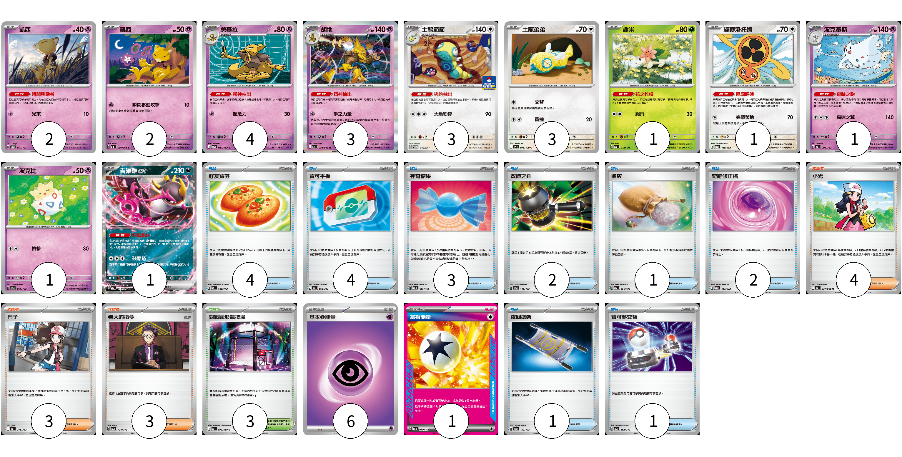 牌組構築方案 以此牌組為基礎新構築牌組 顯示卡面 顯示列表 寶可夢卡(22) 2 2 4 3 3 3 1 1 1 1 1 物品卡(18) 4 4 3 2 1 2 1 1 支援者卡(10) 4 3 3 競技場卡(3) 3 能量卡(7) 6 1 寶可夢卡(22) 卡牌名稱 張數 卡牌名稱 張數 凱西 SV8a 057/187 02 凱西 M1S 036/063 02 勇基拉 M1S 037/063 04 胡地 M1S 038/063 03 土龍節節 M-P 045/M-P 03 土龍弟弟 SV9 078/100 03 謝米 M2a 012/193 01 旋轉洛托姆 M2a 139/193 01 波克基斯 MC 293/742 01 波克比 M2a 064/193 01 吉雉雞ex M2a 114/193 01 物品卡(18) 卡牌名稱 張數 卡牌名稱 張數 好友寶芬 MC 648/742 04 寶可平板 MC 662/742 04 神奇糖果 MC 655/742 03 改造之錘 M2a 148/193 02 聖灰 M2a 150/193 01 奇跡修正檔 MBD 017/022 02 夜間擔架 M2a 159/193 01 寶可夢交替 MC 663/742 01 支援者卡(10) 卡牌名稱 張數 卡牌名稱 張數 小光 M2 077/080 04 鬥子 MC 718/742 03 老大的指令 MC 724/742 03 競技場卡(3) 卡牌名稱 張數 卡牌名稱 張數 對戰圓形競技場 M2 079/080 03 能量卡(7) 卡牌名稱 張數 卡牌名稱 張數 基本超能量 sv-p PSY 06 富裕能量 MC 740/742 01 以此牌組為基礎新構築牌組 牌組編碼 MerGTO-vMuIxC-PKGqzT copy 列印牌組單 牌組編碼已複製 分享至SNS