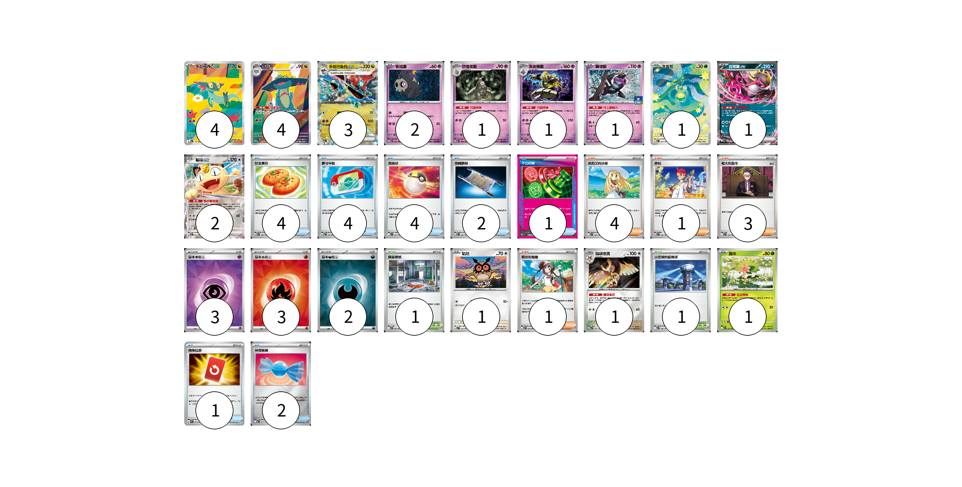 牌組構築方案 以此牌組為基礎新構築牌組 顯示卡面 顯示列表 寶可夢卡(23) 4 4 3 2 1 1 1 1 1 2 1 1 1 物品卡(18) 4 4 4 2 1 1 2 支援者卡(9) 4 1 3 1 競技場卡(2) 1 1 能量卡(8) 3 3 2 寶可夢卡(23) 卡牌名稱 張數 卡牌名稱 張數 多龍梅西亞 M2a 211/193 04 多龍奇 M2a 212/193 04 多龍巴魯托ex SV8a 120/187 03 夜巡靈 M2a 072/193 02 彷徨夜靈 MC 309/742 01 黑夜魔靈 MC 310/742 01 願增猿 M-P 014/M-P 01 含羞苞 M2a 196/193 01 吉雉雞ex MC 489/742 01 喵喵ex M3 061/080 02 咕咕 MC 572/742 01 貓頭夜鷹 M2a 138/193 01 謝米 M2a 012/193 01 物品卡(18) 卡牌名稱 張數 卡牌名稱 張數 好友寶芬 MC 648/742 04 寶可平板 M3 070/080 04 高級球 MC 651/742 04 夜間擔架 MC 670/742 02 不公印章 MBD 011/022 01 特殊紅牌 M4 072/083 01 神奇糖果 MC 655/742 02 支援者卡(9) 卡牌名稱 張數 卡牌名稱 張數 莉莉艾的決意 MC 729/742 04 赤松 MC 696/742 01 老大的指令 MC 724/742 03 鳴依的勉勵 M3 075/080 01 競技場卡(2) 卡牌名稱 張數 卡牌名稱 張數 險惡廢墟 M1L 063/063 01 火箭隊的監視塔 M2a 189/193 01 能量卡(8) 卡牌名稱 張數 卡牌名稱 張數 基本【超】能量 SVOD PSY 03 基本【火】能量 SVM FIR 03 基本【惡】能量 SVM DAR 02 以此牌組為基礎新構築牌組 牌組編碼 MfdKOV-tlOuhG-ZCWtzQ copy 列印牌組單 牌組編碼已複製 分享至SNS