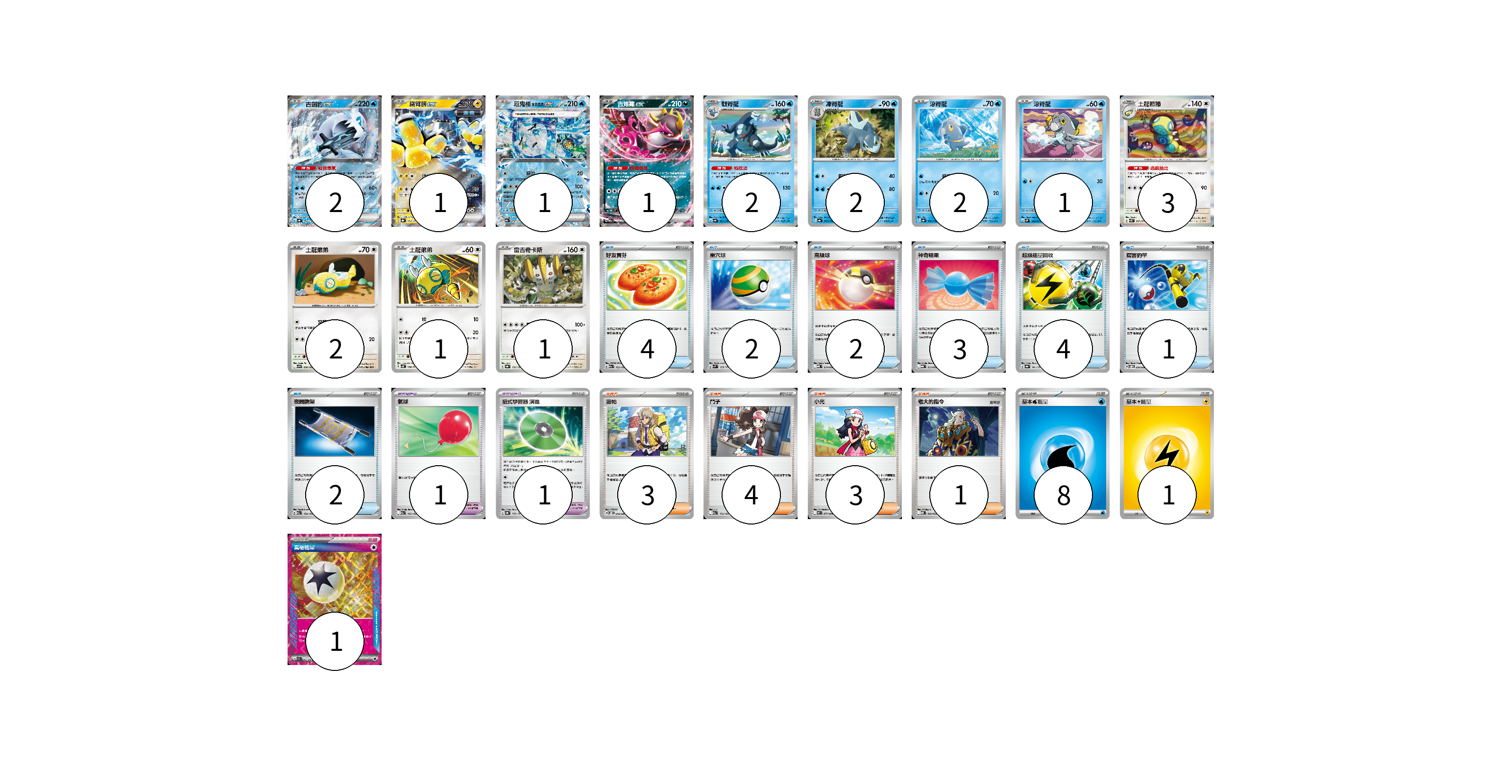 牌組構築方案 以此牌組為基礎新構築牌組 顯示卡面 顯示列表 寶可夢卡(19) 2 1 1 1 2 2 2 1 3 2 1 1 寶可夢道具(2) 1 1 物品卡(18) 4 2 2 3 4 1 2 支援者卡(11) 3 4 3 1 能量卡(10) 8 1 1 寶可夢卡(19) 卡牌名稱 張數 卡牌名稱 張數 古劍豹ex SV4a 054/190 02 鐵臂膀ex SV8a 054/187 01 厄鬼椪 水井面具ex SV8a 050/187 01 吉雉雞ex M2a 114/193 01 戟脊龍 SV4a 053/190 02 凍脊龍 SV4a 052/190 02 涼脊龍 SV4a 051/190 02 涼脊龍 SV2P 024/071 01 土龍節節 SV5K 057/071 03 土龍弟弟 SV9 078/100 02 土龍弟弟 SV5K 056/071 01 雷吉奇卡斯 SV8a 132/187 01 寶可夢道具(2) 卡牌名稱 張數 卡牌名稱 張數 氣球 M2a 165/193 01 招式學習器 演進 SV8a 160/187 01 物品卡(18) 卡牌名稱 張數 卡牌名稱 張數 好友寶芬 M2a 153/193 04 巢穴球 SVM 133/175 02 高級球 MBD 014/022 02 神奇糖果 MBG 013/022 03 超級能量回收 SV8a 141/187 04 厲害釣竿 SVOD 010/020 01 夜間擔架 M2a 159/193 02 支援者卡(11) 卡牌名稱 張數 卡牌名稱 張數 派帕 SVOD 018/020 03 鬥子 M2a 172/193 04 小光 M2 077/080 03 老大的指令 MBD 020/022 01 能量卡(10) 卡牌名稱 張數 卡牌名稱 張數 基本水能量 sv-p WAT 08 基本雷能量 sv-p LIG 01 富裕能量 SV7a 064/064 01 以此牌組為基礎新構築牌組 牌組編碼 MffBVL-NCTDBt-ecIEiy copy 列印牌組單 牌組編碼已複製 分享至SNS