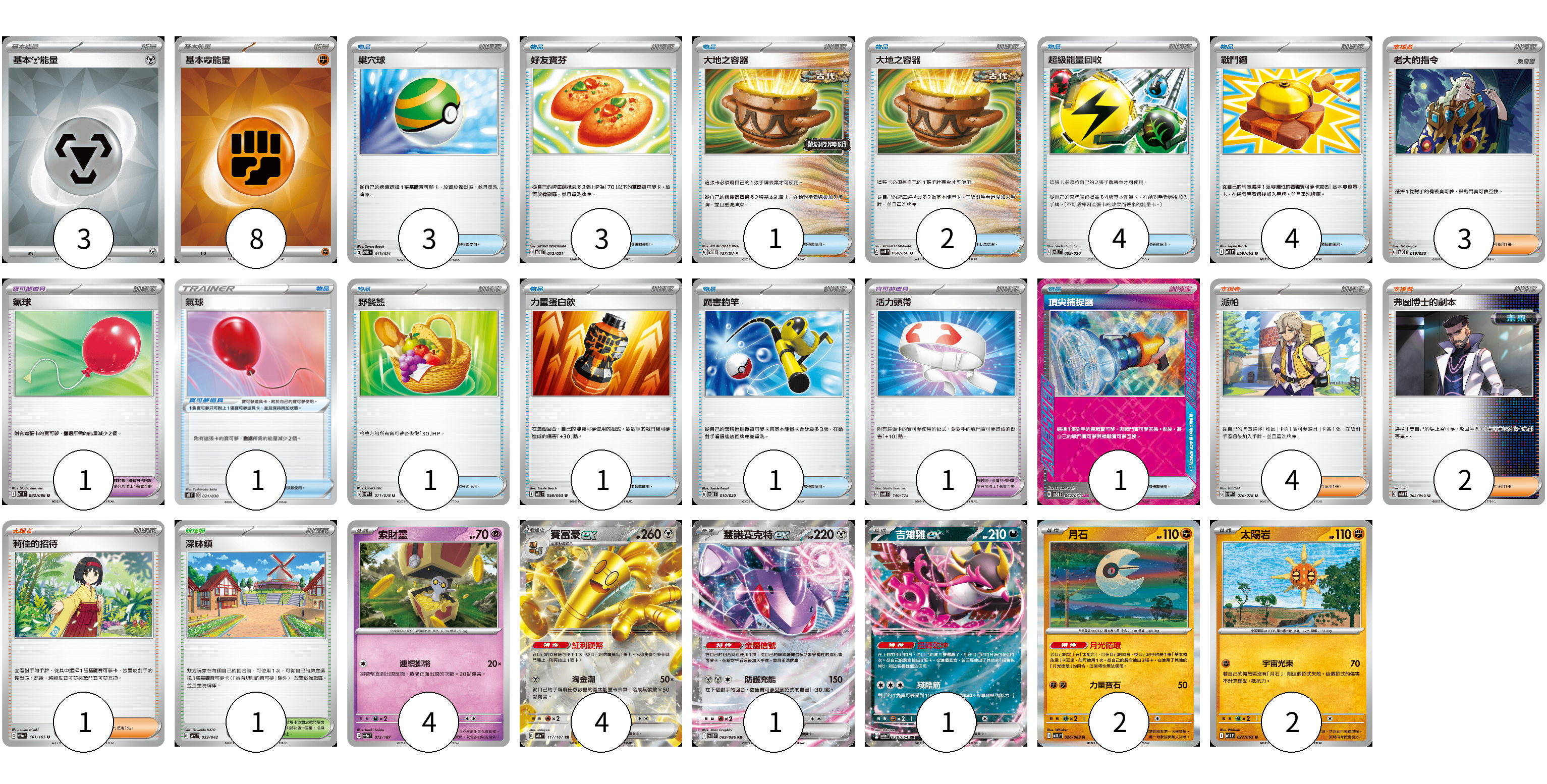 牌組構築方案 以此牌組為基礎新構築牌組 顯示卡面 顯示列表 寶可夢卡(14) 4 4 1 1 2 2 寶可夢道具(3) 1 1 1 物品卡(21) 3 3 1 2 4 4 1 1 1 1 支援者卡(10) 3 4 2 1 競技場卡(1) 1 能量卡(11) 3 8 寶可夢卡(14) 卡牌名稱 張數 卡牌名稱 張數 索財靈 SV8a 073/187 04 賽富豪ex SV8a 117/187 04 蓋諾賽克特ex SV11B 069/086 01 吉雉雞ex SV6a 038/064 01 月石 M1L 026/063 02 太陽岩 M1L 027/063 02 寶可夢道具(3) 卡牌名稱 張數 卡牌名稱 張數 氣球 SV11B 082/086 01 氣球 SK 021/030 01 活力頭帶 SVM 140/175 01 物品卡(21) 卡牌名稱 張數 卡牌名稱 張數 巢穴球 SVTR 013/021 03 好友寶芬 SVOM 012/021 03 大地之容器 SV-P 137/SV-P 01 大地之容器 SV4K 060/066 02 超級能量回收 SVEL 009/020 04 戰鬥鑼 M1L 059/063 04 野餐籃 SV1V 071/078 01 力量蛋白飲 M1L 058/063 01 厲害釣竿 SVOD 010/020 01 頂尖捕捉器 SV5M 062/071 01 支援者卡(10) 卡牌名稱 張數 卡牌名稱 張數 老大的指令 SVOD 019/020 03 派帕 SV1V 076/078 04 弗圖博士的劇本 SV4M 065/066 02 莉佳的招待 SV2a 161/165 01 競技場卡(1) 卡牌名稱 張數 卡牌名稱 張數 深缽鎮 SVK 039/042 01 能量卡(11) 卡牌名稱 張數 卡牌名稱 張數 基本【鋼】能量 SVOD MET 03 基本【鬥】能量 SVK FIG 08 以此牌組為基礎新構築牌組 牌組編碼 MfvHdp-qPcNZs-yUbTfP copy 列印牌組單 牌組編碼已複製 分享至SNS