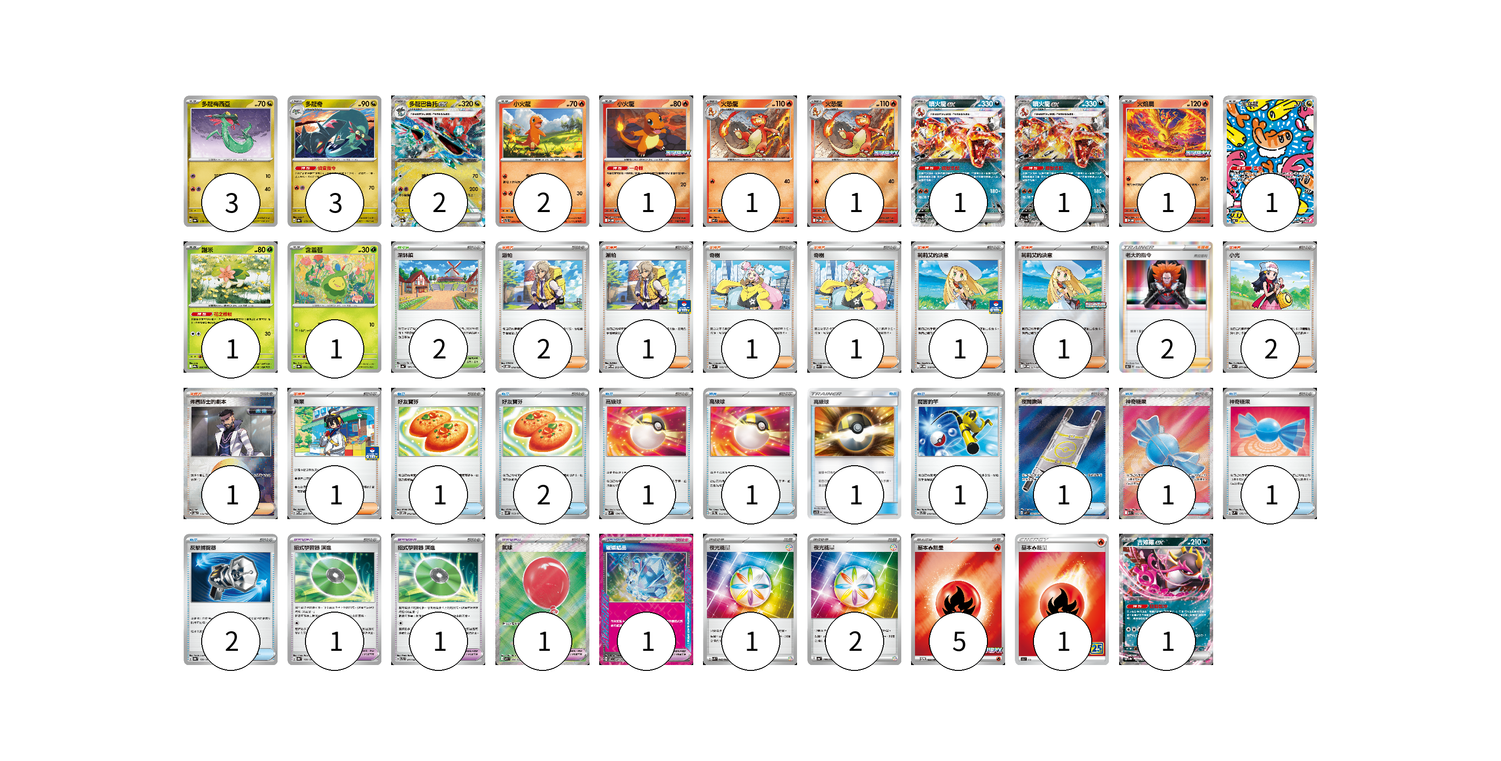 牌組構築方案 以此牌組為基礎新構築牌組 顯示卡面 顯示列表 寶可夢卡(20) 3 3 2 2 1 1 1 1 1 1 1 1 1 1 寶可夢道具(4) 1 1 1 1 物品卡(12) 1 2 1 1 1 1 1 1 1 2 支援者卡(13) 2 1 1 1 1 1 2 2 1 1 競技場卡(2) 2 能量卡(9) 1 2 5 1 寶可夢卡(20) 卡牌名稱 張數 卡牌名稱 張數 多龍梅西亞 SV8a 118/187 03 多龍奇 SV8a 119/187 03 多龍巴魯托ex SV8a 120/187 02 小火龍 SVTL 001/021 02 小火龍 M-P 020/M-P 01 火恐龍 M2 012/080 01 火恐龍 M-P 021/M-P 01 噴火龍ex SV3 066/108 01 噴火龍ex SV4a 115/190 01 火焰鳥 M-P 022/M-P 01 米立龍 SV6 112/101 01 謝米 SV9a 006/063 01 含羞苞 SV8a 001/187 01 吉雉雞ex SV8a 104/187 01 寶可夢道具(4) 卡牌名稱 張數 卡牌名稱 張數 招式學習器 演進 SV8a 160/187 01 招式學習器 演進 SVTL 017/021 01 氣球 M1L 084/063 01 璀璨結晶 SV7 094/102 01 物品卡(12) 卡牌名稱 張數 卡牌名稱 張數 好友寶芬 SVOM 012/021 01 好友寶芬 SV5K 063/071 02 高級球 SVM 134/175 01 高級球 SVEM 013/020 01 高級球 AC1D 139/157 01 厲害釣竿 SVTS 010/022 01 夜間擔架 M1L 083/063 01 神奇糖果 M1S 082/063 01 神奇糖果 SVM 135/175 01 反擊捕捉器 SV8a 139/187 02 支援者卡(13) 卡牌名稱 張數 卡牌名稱 張數 派帕 SVOD 018/020 02 派帕 SV-P 213/SV-P 01 奇樹 SVM 160/175 01 奇樹 SVK 031/042 01 莉莉艾的決意 M-P 018/M-P 01 莉莉艾的決意 M-P 011/M-P 01 老大的指令(弗拉達利) S8b 158/184 02 小光 M2 077/080 02 弗圖博士的劇本 SV8a 175/187 01 烏栗 SV-P 229/SV-P 01 競技場卡(2) 卡牌名稱 張數 卡牌名稱 張數 深缽鎮 SV4a 185/190 02 能量卡(9) 卡牌名稱 張數 卡牌名稱 張數 夜光能量 SVK 042/042 01 夜光能量 SV4a 190/190 02 基本【火】能量 M-P 032/M-P 05 基本火能量 S8a FIR 01 以此牌組為基礎新構築牌組 牌組編碼 MhRfwW-UWXKqu-NpQbDC copy 列印牌組單 牌組編碼已複製 分享至SNS