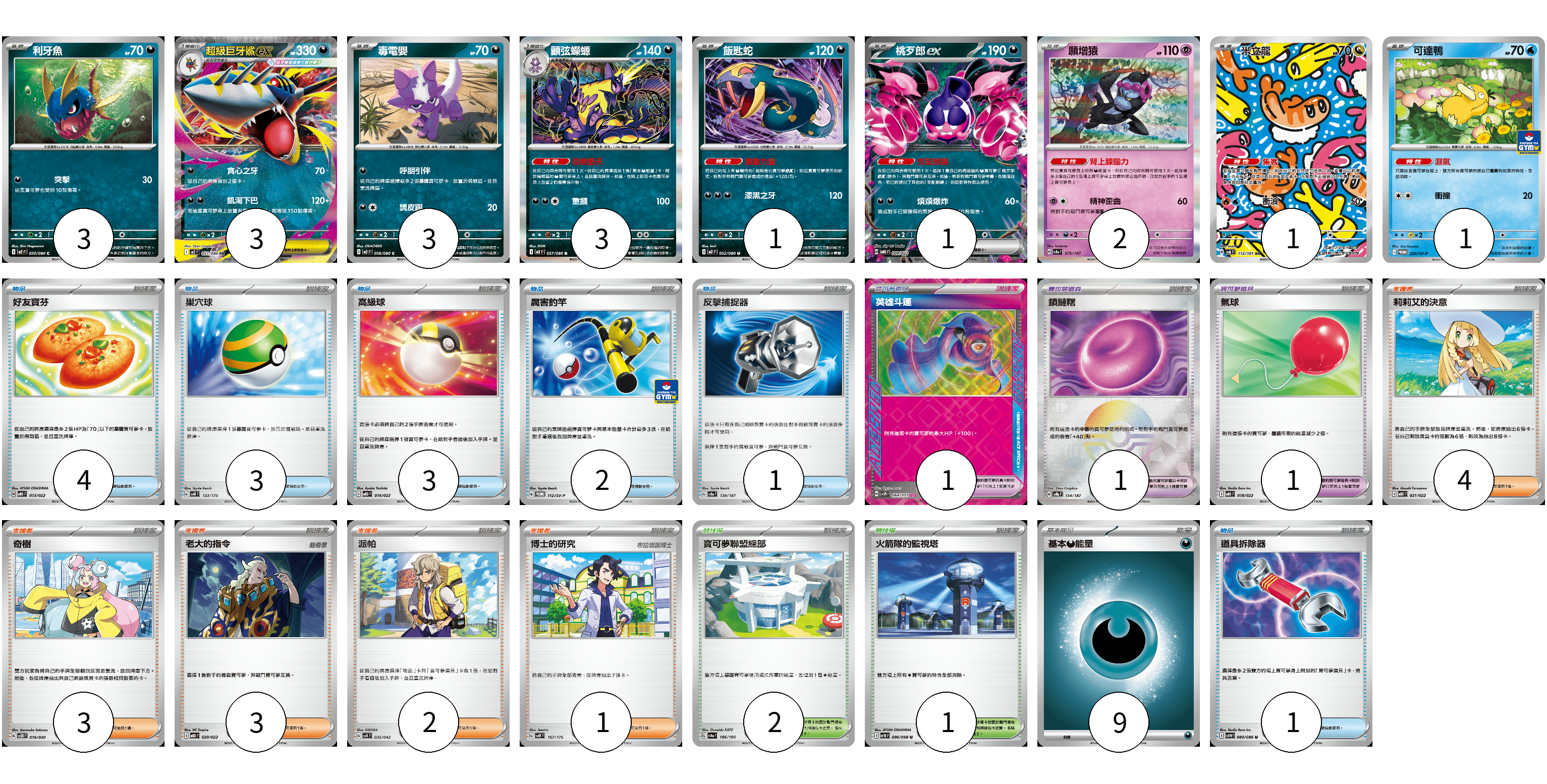 牌組構築方案 以此牌組為基礎新構築牌組 顯示卡面 顯示列表 寶可夢卡(18) 3 3 3 3 1 1 2 1 1 寶可夢道具(3) 1 1 1 物品卡(14) 4 3 3 2 1 1 支援者卡(13) 4 3 3 2 1 競技場卡(3) 2 1 能量卡(9) 9 寶可夢卡(18) 卡牌名稱 張數 卡牌名稱 張數 利牙魚 M2 050/080 03 超級巨牙鯊ex M2 051/080 03 毒電嬰 M2 056/080 03 顫弦蠑螈 M2 057/080 03 飯匙蛇 M2 052/080 01 桃歹郎ex MBG 009/022 01 願增猿 SV8a 075/187 02 米立龍 SV6 112/101 01 可達鴨 SV-P 220/SV-P 01 寶可夢道具(3) 卡牌名稱 張數 卡牌名稱 張數 英雄斗篷 SV5M 064/071 01 鎖鏈糬 SV8a 154/187 01 氣球 MBD 018/022 01 物品卡(14) 卡牌名稱 張數 卡牌名稱 張數 好友寶芬 MBD 013/022 04 巢穴球 SVM 133/175 03 高級球 MBD 014/022 03 厲害釣竿 SV-P 112/SV-P 02 反擊捕捉器 SV8a 139/187 01 道具拆除器 SV11W 080/086 01 支援者卡(13) 卡牌名稱 張數 卡牌名稱 張數 莉莉艾的決意 MBD 021/022 04 奇樹 SVOD 016/020 03 老大的指令 MBD 020/022 03 派帕 SVK 035/042 02 博士的研究 SVM 167/175 01 競技場卡(3) 卡牌名稱 張數 卡牌名稱 張數 寶可夢聯盟總部 SV4a 186/190 02 火箭隊的監視塔 SV10 096/098 01 能量卡(9) 卡牌名稱 張數 卡牌名稱 張數 基本【惡】能量 MBG DAR 09 以此牌組為基礎新構築牌組 牌組編碼 MhnGTP-UjkTft-vUoUMe copy 列印牌組單 牌組編碼已複製 分享至SNS