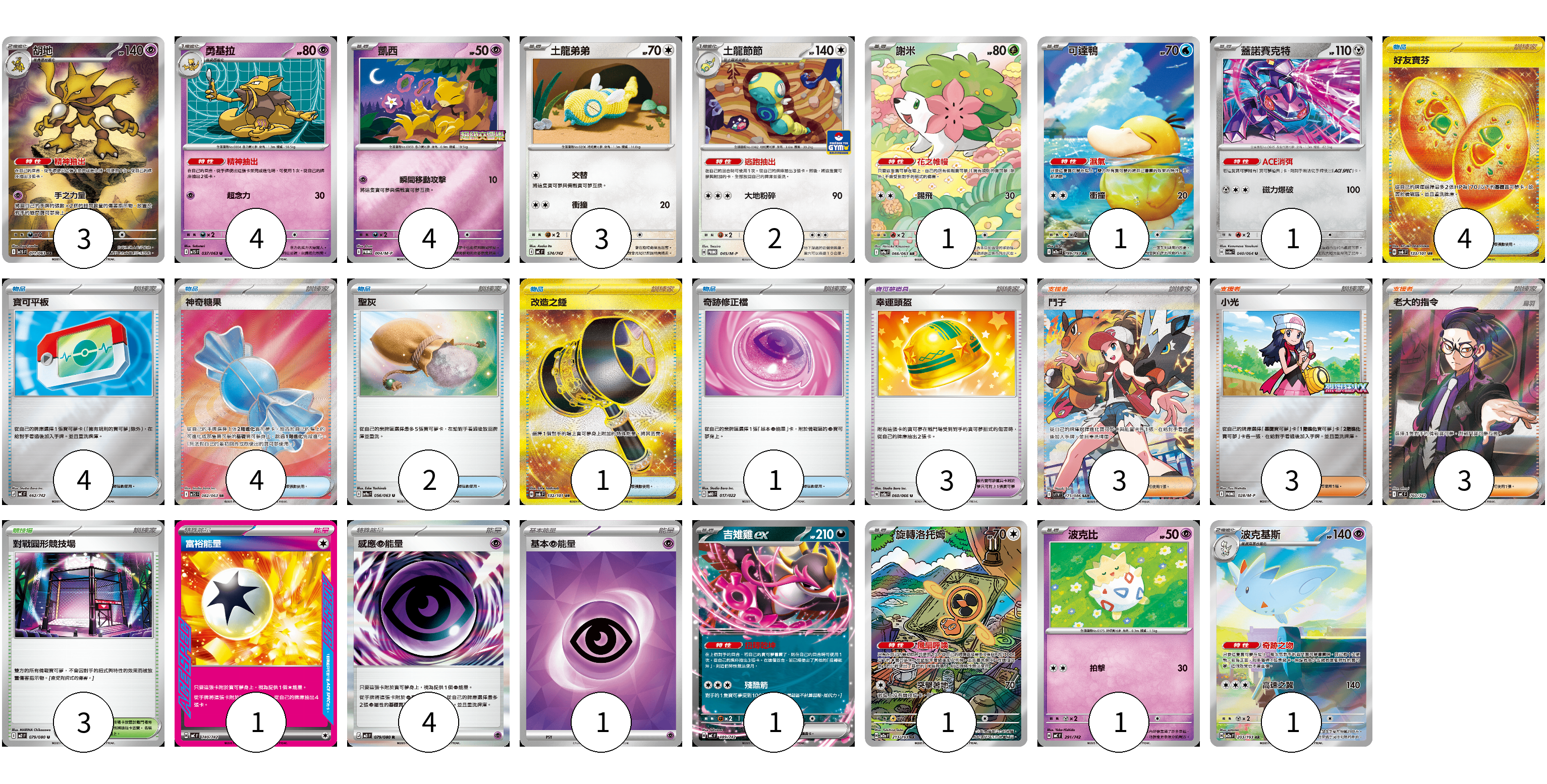牌組構築方案 以此牌組為基礎新構築牌組 顯示卡面 顯示列表 寶可夢卡(23) 3 4 4 3 2 1 1 1 1 1 1 1 寶可夢道具(3) 3 物品卡(16) 4 4 4 2 1 1 支援者卡(9) 3 3 3 競技場卡(3) 3 能量卡(6) 1 4 1 寶可夢卡(23) 卡牌名稱 張數 卡牌名稱 張數 胡地 M1S 071/063 03 勇基拉 M1S 037/063 04 凱西 M-P 004/M-P 04 土龍弟弟 MC 574/742 03 土龍節節 M-P 045/M-P 02 謝米 SV9a 066/063 01 可達鴨 M2a 199/193 01 蓋諾賽克特 SV6a 040/064 01 吉雉雞ex MC 489/742 01 旋轉洛托姆 M2a 213/193 01 波克比 MC 291/742 01 波克基斯 M2a 203/193 01 寶可夢道具(3) 卡牌名稱 張數 卡牌名稱 張數 幸運頭盔 SV5a 060/066 03 物品卡(16) 卡牌名稱 張數 卡牌名稱 張數 好友寶芬 SV6 133/101 04 寶可平板 MC 662/742 04 神奇糖果 M1S 082/063 04 聖灰 SV9a 056/063 02 改造之錘 SV6 132/101 01 奇跡修正檔 MBD 017/022 01 支援者卡(9) 卡牌名稱 張數 卡牌名稱 張數 鬥子 SV11W 173/086 03 小光 M-P 028/M-P 03 老大的指令(烏羽) MC 760/742 03 競技場卡(3) 卡牌名稱 張數 卡牌名稱 張數 對戰圓形競技場 M2 079/080 03 能量卡(6) 卡牌名稱 張數 卡牌名稱 張數 富裕能量 MC 740/742 01 感應【超】能量 M3 079/080 04 基本【超】能量 SVM PSY 01 以此牌組為基礎新構築牌組 牌組編碼 MhsXhr-EPmMyS-FxeLqi copy 列印牌組單 牌組編碼已複製 分享至SNS