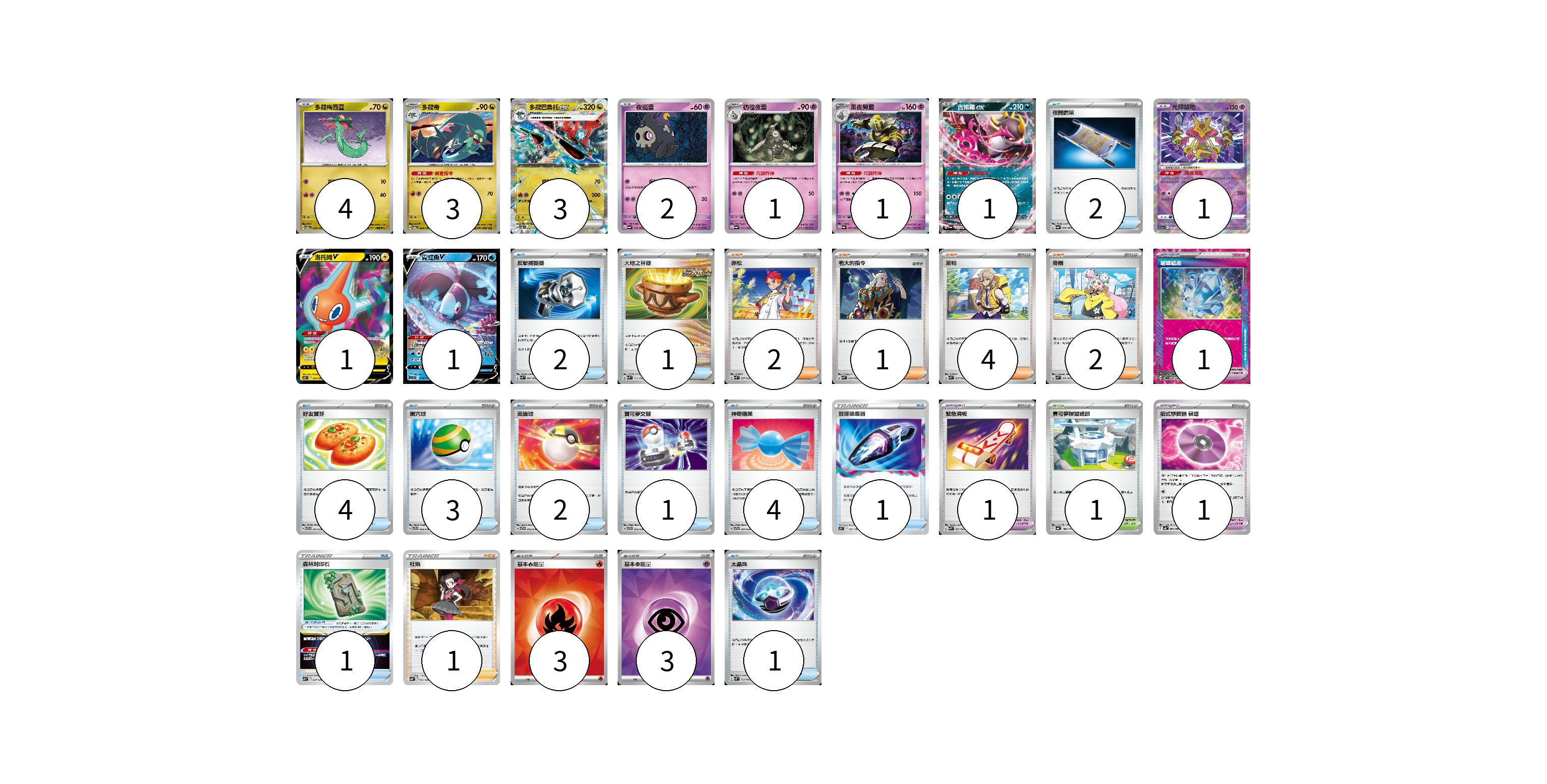 牌組構築方案 以此牌組為基礎新構築牌組 顯示卡面 顯示列表 寶可夢卡(18) 4 3 3 2 1 1 1 1 1 1 寶可夢道具(3) 1 1 1 物品卡(22) 2 2 1 4 3 2 1 4 1 1 1 支援者卡(10) 2 1 4 2 1 競技場卡(1) 1 能量卡(6) 3 3 寶可夢卡(18) 卡牌名稱 張數 卡牌名稱 張數 多龍梅西亞 SV6 079/101 04 多龍奇 SV6 080/101 03 多龍巴魯托ex SV6 081/101 03 夜巡靈 SV6a 018/064 02 彷徨夜靈 SV6a 019/064 01 黑夜魔靈 SV6a 020/064 01 吉雉雞ex SV6a 038/064 01 光輝胡地 S11a 031/068 01 洛托姆V S11 037/100 01 霓虹魚V SVHK 004/022 01 寶可夢道具(3) 卡牌名稱 張數 卡牌名稱 張數 璀璨結晶 SV7 094/102 01 緊急滑板 SVK 023/042 01 招式學習器 衰退 SV4K 063/066 01 物品卡(22) 卡牌名稱 張數 卡牌名稱 張數 夜間擔架 SV6a 056/064 02 反擊捕捉器 SVK 009/042 02 大地之容器 SVK 012/042 01 好友寶芬 SVTG 011/019 04 巢穴球 SVTG 012/019 03 高級球 SVTG 013/019 02 寶可夢交替 SVTG 015/019 01 神奇糖果 SVTG 014/019 04 放逐吸塵器 S11 093/100 01 森林封印石 SVF 024/038 01 太晶珠 SVK 013/042 01 支援者卡(10) 卡牌名稱 張數 卡牌名稱 張數 赤松 SVK 027/042 02 老大的指令 SVK 036/042 01 派帕 SVK 035/042 04 奇樹 SVK 031/042 02 杜娟 SVB 021/028 01 競技場卡(1) 卡牌名稱 張數 卡牌名稱 張數 寶可夢聯盟總部 SV4a 186/190 01 能量卡(6) 卡牌名稱 張數 卡牌名稱 張數 基本【火】能量 SVK FIR 03 基本【超】能量 SVK PSY 03 以此牌組為基礎新構築牌組 牌組編碼 MiJPxg-wIxwkw-FdIhyf copy 列印牌組單 牌組編碼已複製 分享至SNS