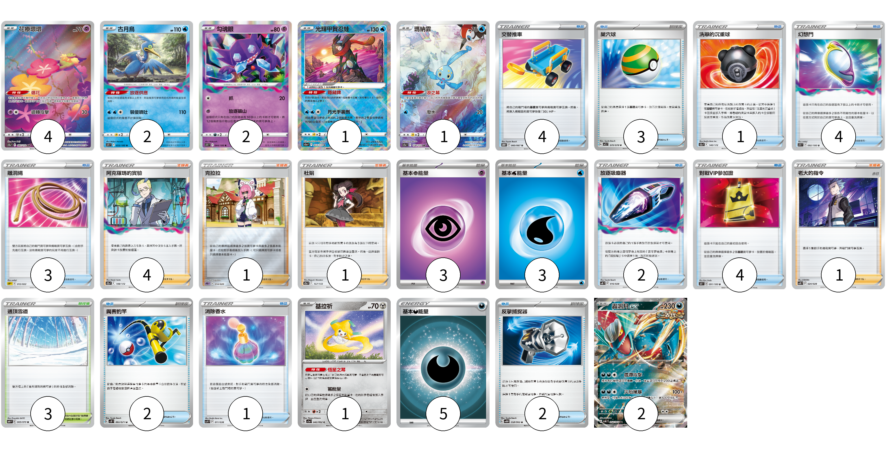 牌組構築方案 以此牌組為基礎新構築牌組 顯示卡面 顯示列表 寶可夢卡(13) 4 2 2 1 1 1 2 物品卡(26) 4 3 1 4 3 2 4 2 1 2 支援者卡(7) 4 1 1 1 競技場卡(3) 3 能量卡(11) 3 3 5 寶可夢卡(13) 卡牌名稱 張數 卡牌名稱 張數 花療環環 S12a 187/172 04 古月鳥 S11 033/100 02 勾魂眼 S11 044/100 02 光輝甲賀忍蛙 S12a 033/172 01 瑪納霏 S12a 178/172 01 基拉祈 SV3a 042/062 01 轟鳴月ex SV4K 054/066 02 物品卡(26) 卡牌名稱 張數 卡牌名稱 張數 交替推車 S10D 060/067 04 巢穴球 SV1S 070/078 03 洗翠的沉重球 S12a 140/172 01 幻想門 S11 092/100 04 離洞繩 SDP 012/022 03 放逐吸塵器 SVB 016/028 02 對戰VIP參加證 S8 091/100 04 厲害釣竿 SV2P 066/071 02 消除香水 SVF 011/038 01 反擊捕捉器 SV4M 059/066 02 支援者卡(7) 卡牌名稱 張數 卡牌名稱 張數 阿克羅瑪的實驗 S12a 148/172 04 克拉拉 SPD 014/020 01 杜娟 S12a 157/172 01 老大的指令(赤日) SVB 024/028 01 競技場卡(3) 卡牌名稱 張數 卡牌名稱 張數 通頂雪道 S6H 069/070 03 能量卡(11) 卡牌名稱 張數 卡牌名稱 張數 基本超能量 sv-p PSY 03 基本水能量 sv-p WAT 03 基本惡能量 SLD DAR 05 以此牌組為基礎新構築牌組 牌組編碼 MidwfL-KzgOIZ-zXdgMP copy 列印牌組單 牌組編碼已複製 分享至SNS