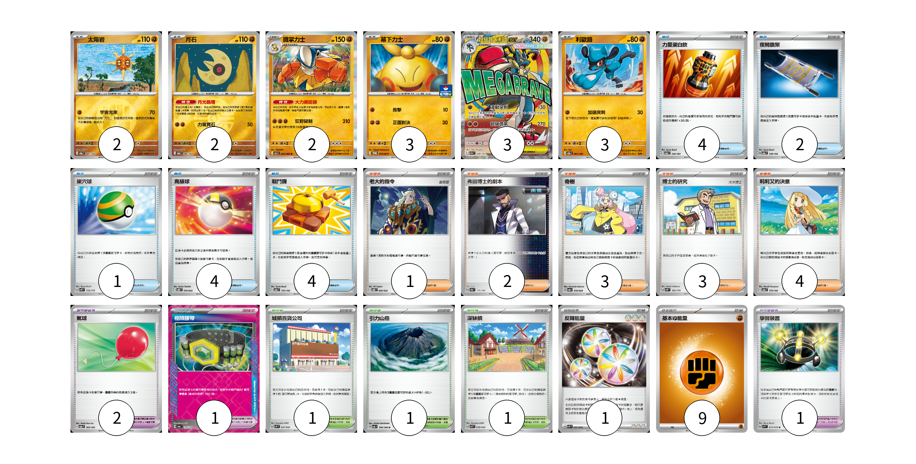 牌組構築方案 以此牌組為基礎新構築牌組 顯示卡面 顯示列表 寶可夢卡(15) 2 2 2 3 3 3 寶可夢道具(4) 2 1 1 物品卡(15) 4 2 1 4 4 支援者卡(13) 1 2 3 3 4 競技場卡(3) 1 1 1 能量卡(10) 1 9 寶可夢卡(15) 卡牌名稱 張數 卡牌名稱 張數 太陽岩 M2a 087/193 02 月石 M2a 086/193 02 鐵掌力士 M1L 025/063 02 幕下力士 M-P 015/M-P 03 超級路卡利歐ex M2a 228/193 03 利歐路 M2a 091/193 03 寶可夢道具(4) 卡牌名稱 張數 卡牌名稱 張數 氣球 M2a 165/193 02 極限腰帶 SV8a 159/187 01 學習裝置 SV1S 072/078 01 物品卡(15) 卡牌名稱 張數 卡牌名稱 張數 力量蛋白飲 M2a 154/193 04 夜間擔架 M2a 159/193 02 巢穴球 SVM 133/175 01 高級球 MBD 014/022 04 戰鬥鑼 M2a 155/193 04 支援者卡(13) 卡牌名稱 張數 卡牌名稱 張數 老大的指令 MBD 020/022 01 弗圖博士的劇本 SV8a 175/187 02 奇樹 SVOD 016/020 03 博士的研究 SVM 162/175 03 莉莉艾的決意 M2a 175/193 04 競技場卡(3) 卡牌名稱 張數 卡牌名稱 張數 城鎮百貨公司 SVK 037/042 01 引力山岳 SV8 106/106 01 深缽鎮 SVK 039/042 01 能量卡(10) 卡牌名稱 張數 卡牌名稱 張數 反轉能量 SVK 041/042 01 基本【鬥】能量 M-P FIG 09 以此牌組為基礎新構築牌組 牌組編碼 MkBPsO-Awkyex-rHzUgQ copy 列印牌組單 牌組編碼已複製 分享至SNS