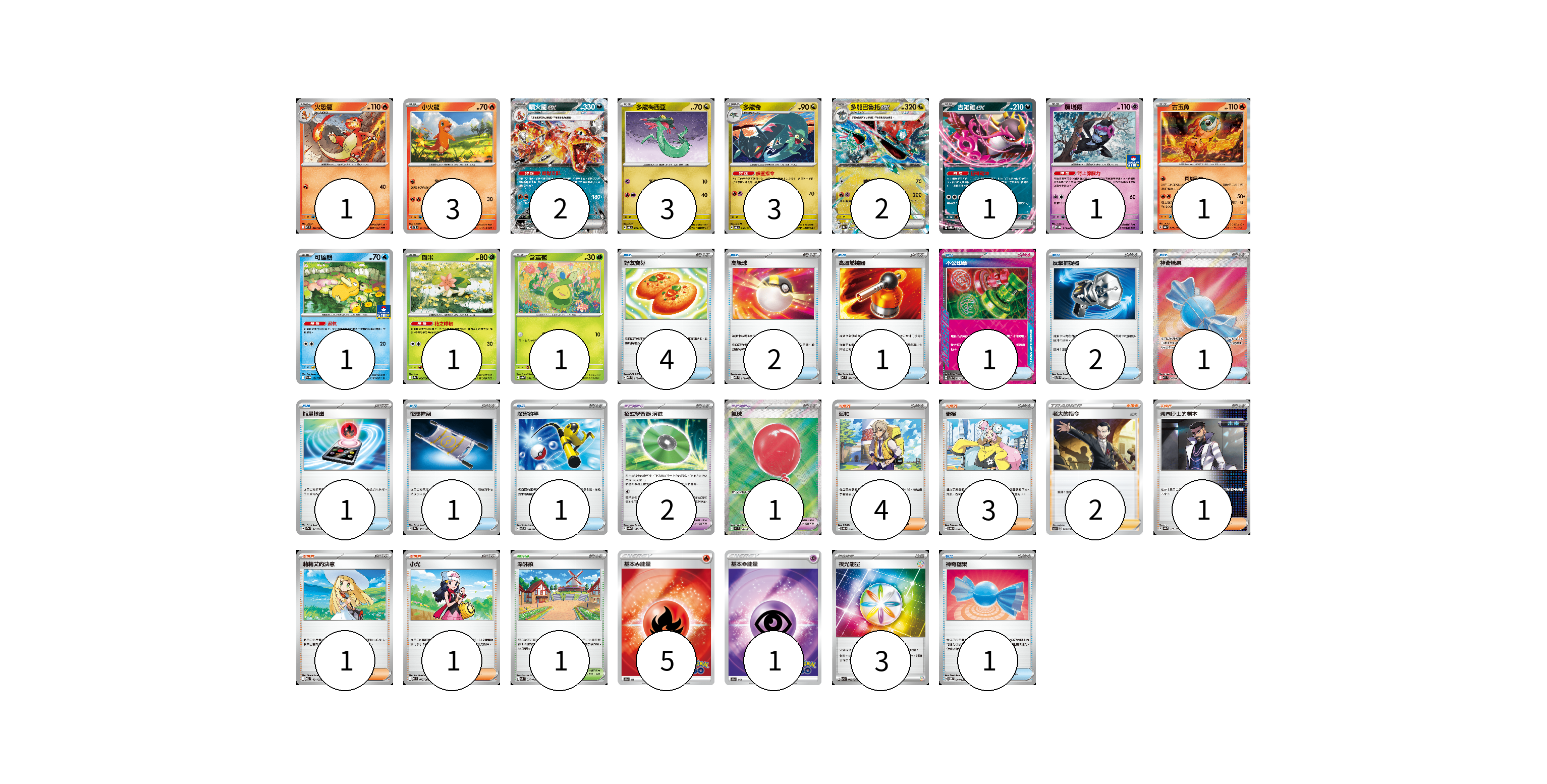 牌組構築方案 以此牌組為基礎新構築牌組 顯示卡面 顯示列表 寶可夢卡(20) 1 3 2 3 3 2 1 1 1 1 1 1 寶可夢道具(3) 2 1 物品卡(15) 4 2 1 1 2 1 1 1 1 1 支援者卡(12) 4 3 2 1 1 1 競技場卡(1) 1 能量卡(9) 5 1 3 寶可夢卡(20) 卡牌名稱 張數 卡牌名稱 張數 火恐龍 M2 012/080 01 小火龍 SVTL 001/021 03 噴火龍ex SV4a 115/190 02 多龍梅西亞 SV6 079/101 03 多龍奇 SV6 080/101 03 多龍巴魯托ex SV8a 120/187 02 吉雉雞ex SVOD 004/020 01 願增猿 M-P 014/M-P 01 古玉魚 SV8a 025/187 01 可達鴨 SV-P 220/SV-P 01 謝米 SV9a 006/063 01 含羞苞 SV8a 001/187 01 寶可夢道具(3) 卡牌名稱 張數 卡牌名稱 張數 招式學習器 演進 SV8a 160/187 02 氣球 M1L 084/063 01 物品卡(15) 卡牌名稱 張數 卡牌名稱 張數 好友寶芬 MBD 013/022 04 高級球 MBD 014/022 02 高溫燃燒器 M2 074/080 01 不公印章 SV5a 053/066 01 反擊捕捉器 SVTS 009/022 02 神奇糖果 M1S 082/063 01 能量輸送 SVAM 013/023 01 夜間擔架 SV8a 151/187 01 厲害釣竿 SVTL 009/021 01 神奇糖果 SVOM 014/021 01 支援者卡(12) 卡牌名稱 張數 卡牌名稱 張數 派帕 SVOD 018/020 04 奇樹 SVOD 016/020 03 老大的指令(坂木) SCB 140/156 02 弗圖博士的劇本 SV8a 175/187 01 莉莉艾的決意 MBD 021/022 01 小光 M2 077/080 01 競技場卡(1) 卡牌名稱 張數 卡牌名稱 張數 深缽鎮 SVK 039/042 01 能量卡(9) 卡牌名稱 張數 卡牌名稱 張數 基本火能量 S10b FIR 05 基本超能量 S10b PSY 01 夜光能量 SVK 042/042 03 以此牌組為基礎新構築牌組 牌組編碼 MkuZBQ-tPOINg-jnEgYM copy 列印牌組單 牌組編碼已複製 分享至SNS
