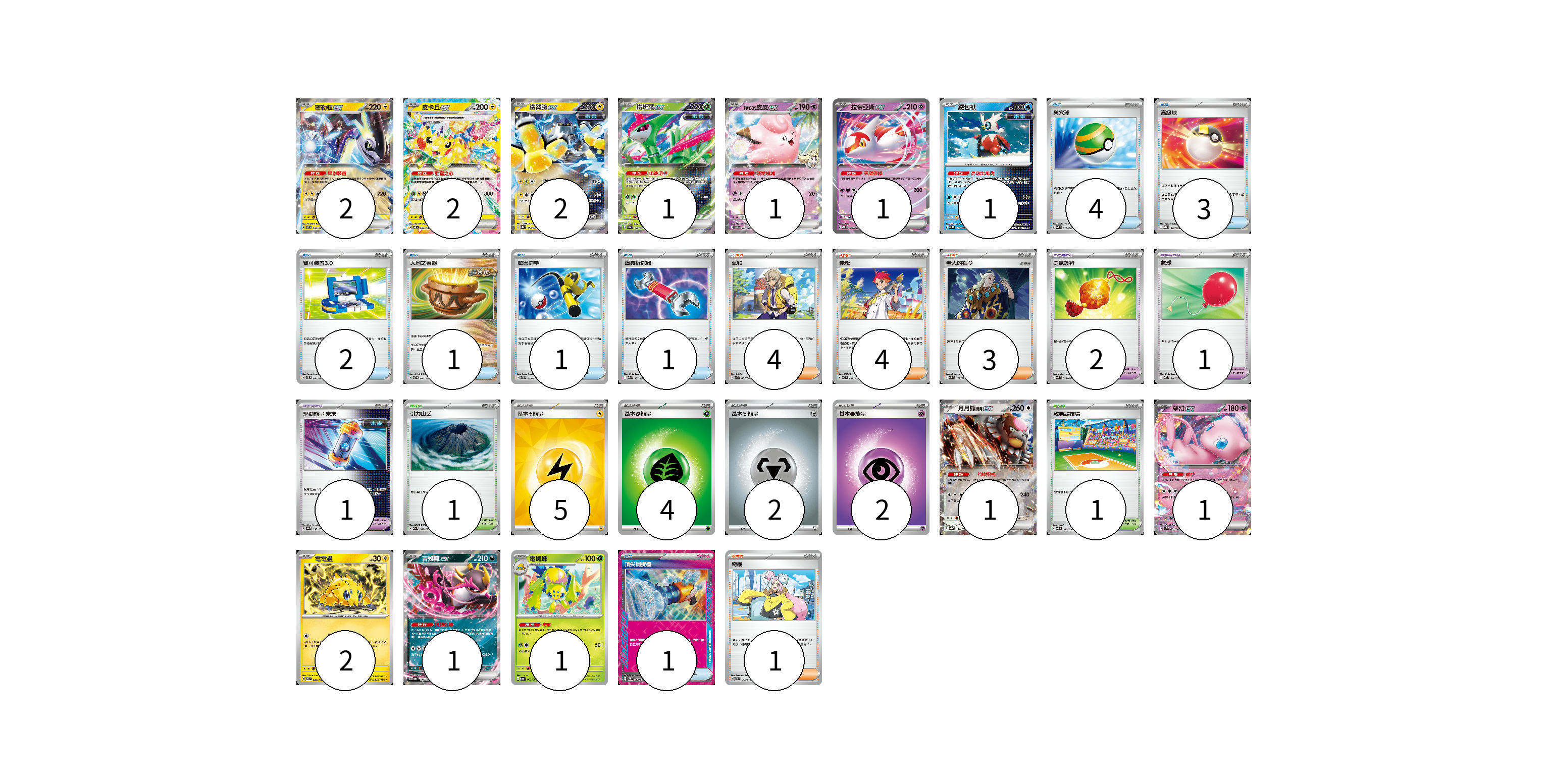 牌組構築方案 以此牌組為基礎新構築牌組 顯示卡面 顯示列表 寶可夢卡(16) 2 2 2 1 1 1 1 1 1 2 1 1 寶可夢道具(4) 2 1 1 物品卡(13) 4 3 2 1 1 1 1 支援者卡(12) 4 4 3 1 競技場卡(2) 1 1 能量卡(13) 5 4 2 2 寶可夢卡(16) 卡牌名稱 張數 卡牌名稱 張數 密勒頓ex SVTR 008/021 02 皮卡丘ex SV8 033/106 02 鐵臂膀ex SV8a 054/187 02 鐵斑葉ex SV5M 016/071 01 莉莉艾的皮皮ex SV9 033/100 01 拉帝亞斯ex MBD 003/022 01 鐵包袱 SV4M 020/066 01 月月熊 赫月ex SV8a 134/187 01 夢幻ex SVK 001/042 01 電電蟲 SV7 032/102 02 吉雉雞ex SV8a 104/187 01 電蜘蛛 SV6a 002/064 01 寶可夢道具(4) 卡牌名稱 張數 卡牌名稱 張數 勇氣護符 SVK 024/042 02 氣球 MBD 018/022 01 驅勁能量 未來 SV8a 158/187 01 物品卡(13) 卡牌名稱 張數 卡牌名稱 張數 巢穴球 SVK 016/042 04 高級球 MBG 012/022 03 寶可裝置3.0 SVTL 014/021 02 大地之容器 SVTG 010/019 01 厲害釣竿 SVTG 009/019 01 道具拆除器 M2a 151/193 01 頂尖捕捉器 SV5M 062/071 01 支援者卡(12) 卡牌名稱 張數 卡牌名稱 張數 派帕 SVK 035/042 04 赤松 SV7 097/102 04 老大的指令 SVM 172/175 03 奇樹 SVTH 015/018 01 競技場卡(2) 卡牌名稱 張數 卡牌名稱 張數 引力山岳 M2a 183/193 01 激動競技場 SV8 105/106 01 能量卡(13) 卡牌名稱 張數 卡牌名稱 張數 基本【雷】能量 SVQP LIG 05 基本【草】能量 M-P GRA 04 基本【鋼】能量 M-P MET 02 基本【超】能量 M-P PSY 02 以此牌組為基礎新構築牌組 牌組編碼 MmDmLA-ebfdXg-yjSZRA copy 列印牌組單 牌組編碼已複製 分享至SNS