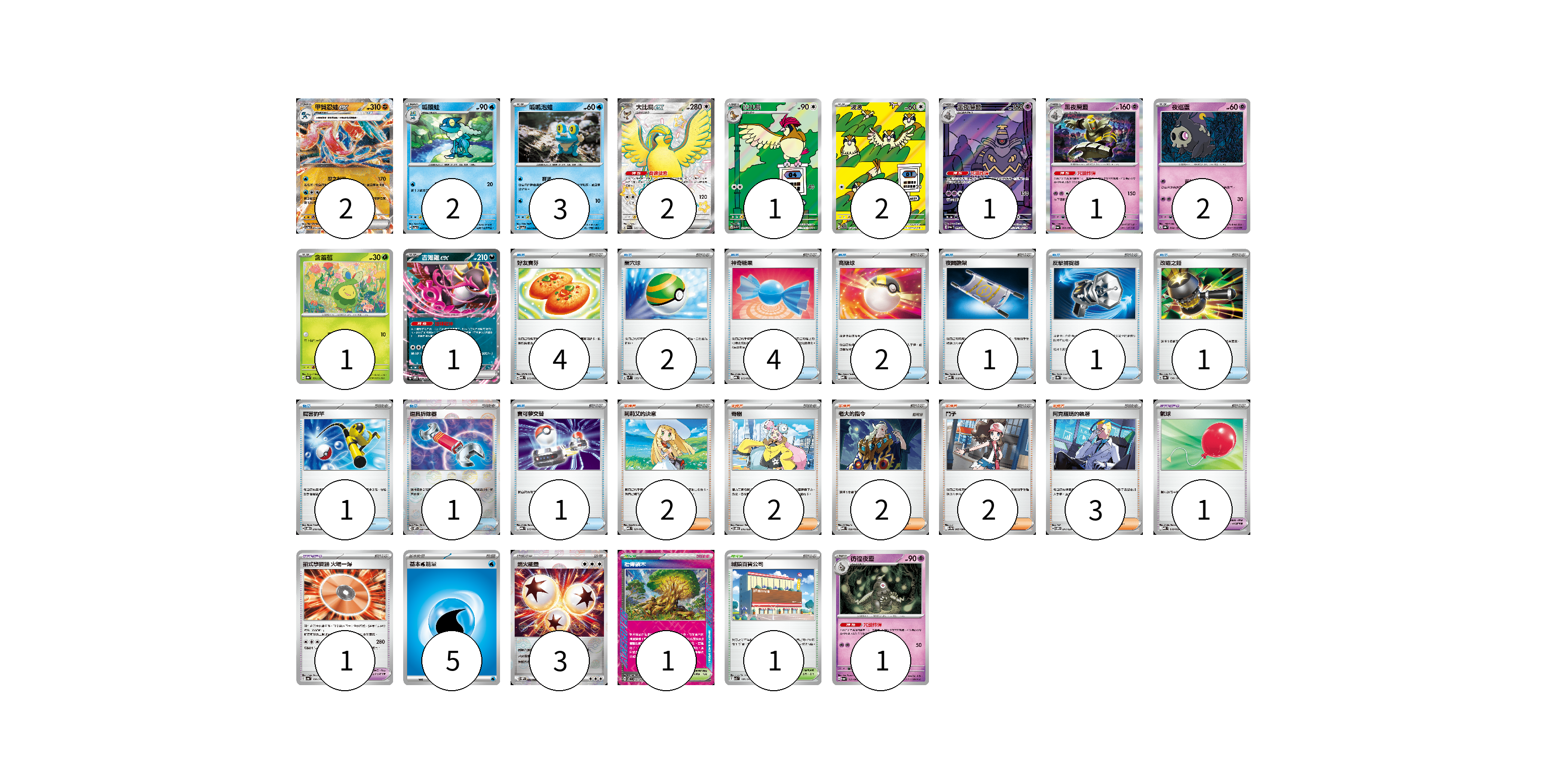 牌組構築方案 以此牌組為基礎新構築牌組 顯示卡面 顯示列表 寶可夢卡(19) 2 2 3 2 1 2 1 1 2 1 1 1 寶可夢道具(2) 1 1 物品卡(18) 4 2 4 2 1 1 1 1 1 1 支援者卡(11) 2 2 2 2 3 競技場卡(2) 1 1 能量卡(8) 5 3 寶可夢卡(19) 卡牌名稱 張數 卡牌名稱 張數 甲賀忍蛙ex SV5a 045/066 02 呱頭蛙 SV5a 024/066 02 呱呱泡蛙 SV5a 023/066 03 大比鳥ex SV4a 335/190 02 比比鳥 SV3 119/108 01 波波 SV3 118/108 02 黑夜魔靈 SV6a 070/064 01 黑夜魔靈 SV6a 020/064 01 夜巡靈 SV8a 064/187 02 含羞苞 SV8a 001/187 01 吉雉雞ex SVOM 009/021 01 彷徨夜靈 SV6a 019/064 01 寶可夢道具(2) 卡牌名稱 張數 卡牌名稱 張數 氣球 MBD 018/022 01 招式學習器 火場一爆 SV4a 170/190 01 物品卡(18) 卡牌名稱 張數 卡牌名稱 張數 好友寶芬 MBD 013/022 04 巢穴球 SVM 133/175 02 神奇糖果 MBG 013/022 04 高級球 MBD 014/022 02 夜間擔架 MBD 016/022 01 反擊捕捉器 SV8a 139/187 01 改造之錘 SV8a 138/187 01 厲害釣竿 SVOD 010/020 01 道具拆除器 SV11W 080/086 01 寶可夢交替 MBG 015/022 01 支援者卡(11) 卡牌名稱 張數 卡牌名稱 張數 莉莉艾的決意 MBD 021/022 02 奇樹 SVOD 016/020 02 老大的指令 MBD 020/022 02 鬥子 SV11W 085/086 02 阿克羅瑪的執著 SVOM 017/021 03 競技場卡(2) 卡牌名稱 張數 卡牌名稱 張數 壯偉碩木 SV7 101/102 01 城鎮百貨公司 SV3 107/108 01 能量卡(8) 卡牌名稱 張數 卡牌名稱 張數 基本【水】能量 SVF WAT 05 燃火能量 SV11W 086/086 03 以此牌組為基礎新構築牌組 牌組編碼 MmjJpO-sQeMdE-ekMjZH copy 列印牌組單 牌組編碼已複製 分享至SNS