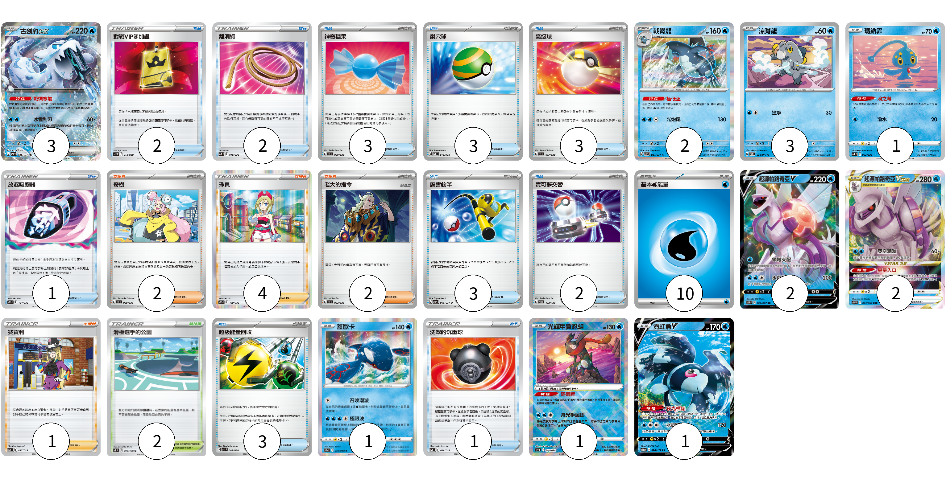 牌組構築方案 以此牌組為基礎新構築牌組 顯示卡面 顯示列表 寶可夢卡(16) 3 2 3 1 2 2 1 1 1 物品卡(23) 2 2 3 3 3 1 3 2 3 1 支援者卡(9) 2 4 2 1 競技場卡(2) 2 能量卡(10) 10 寶可夢卡(16) 卡牌名稱 張數 卡牌名稱 張數 古劍豹ex SV2P 028/071 03 戟脊龍 SV2P 027/071 02 涼脊龍 SV2P 024/071 03 瑪納霏 SVF 003/038 01 起源帕路奇亞V S10P 022/067 02 起源帕路奇亞VSTAR S10P 023/067 02 蓋歐卡 S11a 030/068 01 光輝甲賀忍蛙 SVF 004/038 01 霓虹魚V S12a 026/172 01 物品卡(23) 卡牌名稱 張數 卡牌名稱 張數 對戰VIP參加證 SVF 018/038 02 離洞繩 SVF 010/038 02 神奇糖果 SVF 020/038 03 巢穴球 SVF 016/038 03 高級球 SVF 017/038 03 放逐吸塵器 S12a 144/172 01 厲害釣竿 SV2P 066/071 03 寶可夢交替 SVD 122/139 02 超級能量回收 SVEL 009/020 03 洗翠的沉重球 SVF 019/038 01 支援者卡(9) 卡牌名稱 張數 卡牌名稱 張數 奇樹 SVF 029/038 02 珠貝 S12a 149/172 04 老大的指令 SVF 032/038 02 賽寶利 SVF 027/038 01 競技場卡(2) 卡牌名稱 張數 卡牌名稱 張數 滑板選手的公園 S8 099/100 02 能量卡(10) 卡牌名稱 張數 卡牌名稱 張數 基本【水】能量 SVF WAT 10 以此牌組為基礎新構築牌組 牌組編碼 MoziHG-oncjHa-kmygQA copy 列印牌組單 牌組編碼已複製 分享至SNS