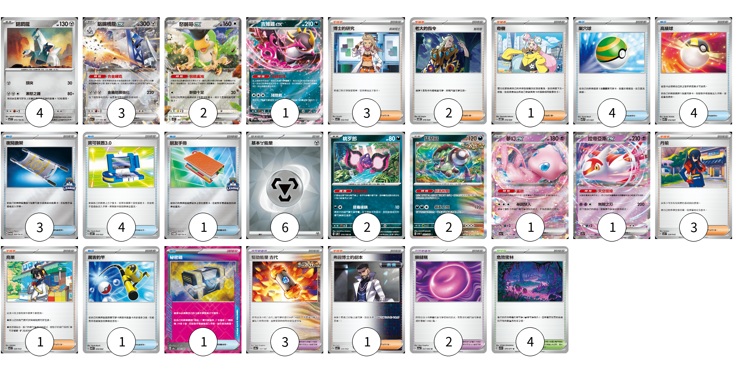 牌組構築方案 以此牌組為基礎新構築牌組 顯示卡面 顯示列表 寶可夢卡(16) 4 3 2 1 2 2 1 1 寶可夢道具(5) 3 2 物品卡(18) 4 4 3 4 1 1 1 支援者卡(11) 3 2 1 3 1 1 競技場卡(4) 4 能量卡(6) 6 寶可夢卡(16) 卡牌名稱 張數 卡牌名稱 張數 鋁鋼龍 SV7 072/102 04 鋁鋼橋龍ex SV7a 037/064 03 怒鸚哥ex SV2P 065/071 02 吉雉雞ex SV6a 038/064 01 桃歹郎 SV8 075/106 02 猛惡菇 SV4K 053/066 02 夢幻ex SV4a 076/190 01 拉帝亞斯ex SV7a 019/064 01 寶可夢道具(5) 卡牌名稱 張數 卡牌名稱 張數 驅勁能量 古代 SV8a 157/187 03 鎖鏈糬 SV6a 057/064 02 物品卡(18) 卡牌名稱 張數 卡牌名稱 張數 巢穴球 SVTL 011/021 04 高級球 SVTL 012/021 04 夜間擔架 SV-P 204/SV-P 03 寶可裝置3.0 SVAW 016/023 04 朋友手冊 SV-P 182/SV-P 01 厲害釣竿 SVTS 010/022 01 秘密箱 SV6 092/101 01 支援者卡(11) 卡牌名稱 張數 卡牌名稱 張數 博士的研究 SVK 032/042 03 老大的指令 SVOD 019/020 02 奇樹 SVOD 016/020 01 丹瑜 SVK 030/042 03 烏栗 SVK 029/042 01 弗圖博士的劇本 SVK 034/042 01 競技場卡(4) 卡牌名稱 張數 卡牌名稱 張數 危險密林 SV5K 070/071 04 能量卡(6) 卡牌名稱 張數 卡牌名稱 張數 基本【鋼】能量 SVOD MET 06 以此牌組為基礎新構築牌組 牌組編碼 MpjIcX-mspYhr-kIrskV copy 列印牌組單 牌組編碼已複製 分享至SNS