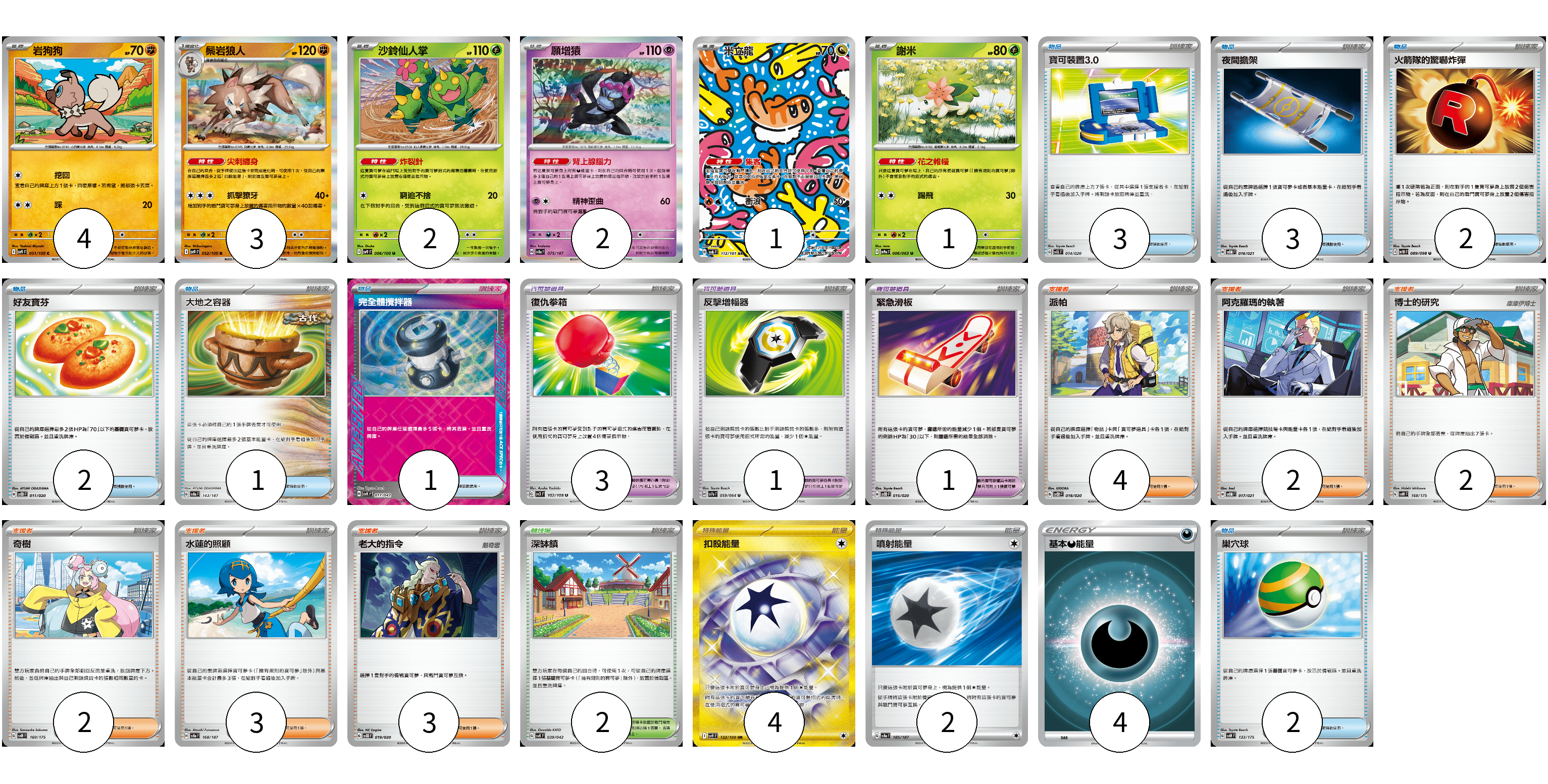 牌組構築方案 以此牌組為基礎新構築牌組 顯示卡面 顯示列表 寶可夢卡(13) 4 3 2 2 1 1 寶可夢道具(5) 3 1 1 物品卡(14) 3 3 2 2 1 1 2 支援者卡(16) 4 2 2 2 3 3 競技場卡(2) 2 能量卡(10) 4 2 4 寶可夢卡(13) 卡牌名稱 張數 卡牌名稱 張數 岩狗狗 SV9 051/100 04 鬃岩狼人 SV9 052/100 03 沙鈴仙人掌 SV9 006/100 02 願增猿 SV8a 075/187 02 米立龍 SV6 112/101 01 謝米 SV9a 006/063 01 寶可夢道具(5) 卡牌名稱 張數 卡牌名稱 張數 復仇拳箱 SV3 102/108 03 反擊增幅器 SV7a 059/064 01 緊急滑板 SVOD 015/020 01 物品卡(14) 卡牌名稱 張數 卡牌名稱 張數 寶可裝置3.0 SVEL 014/020 03 夜間擔架 SVOM 016/021 03 火箭隊的驚嚇炸彈 SV10 089/098 02 好友寶芬 SVOD 011/020 02 大地之容器 SV8a 143/187 01 完全體攪拌器 SVK 017/042 01 巢穴球 SVM 133/175 02 支援者卡(16) 卡牌名稱 張數 卡牌名稱 張數 派帕 SVOD 018/020 04 阿克羅瑪的執著 SVOM 017/021 02 博士的研究 SVM 168/175 02 奇樹 SVM 160/175 02 水蓮的照顧 SV8a 168/187 03 老大的指令 SVOD 019/020 03 競技場卡(2) 卡牌名稱 張數 卡牌名稱 張數 深缽鎮 SVK 039/042 02 能量卡(10) 卡牌名稱 張數 卡牌名稱 張數 扣殺能量 SV9 132/100 04 噴射能量 SV8a 185/187 02 基本惡能量 SLD DAR 04 以此牌組為基礎新構築牌組 牌組編碼 MrVfnZ-izXZNg-qRlvvv copy 列印牌組單 牌組編碼已複製 分享至SNS