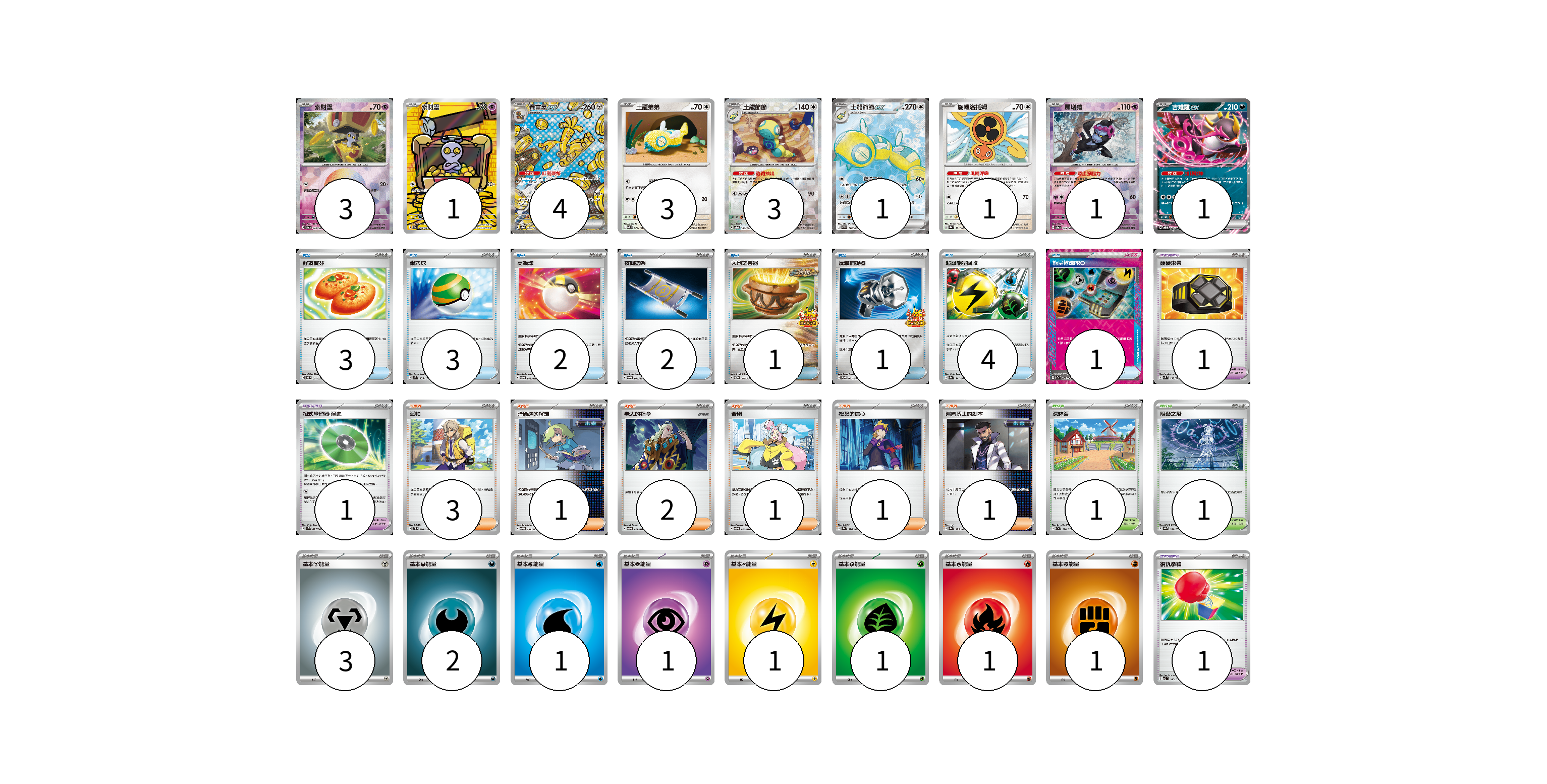 牌組構築方案 以此牌組為基礎新構築牌組 顯示卡面 顯示列表 寶可夢卡(18) 3 1 4 3 3 1 1 1 1 寶可夢道具(3) 1 1 1 物品卡(17) 3 3 2 2 1 1 4 1 支援者卡(9) 3 1 2 1 1 1 競技場卡(2) 1 1 能量卡(11) 3 2 1 1 1 1 1 1 寶可夢卡(18) 卡牌名稱 張數 卡牌名稱 張數 索財靈 SV8a 073/187 03 索財靈 SV3a 068/062 01 賽富豪ex SV8a 220/187 04 土龍弟弟 SV9 078/100 03 土龍節節 SV8a 130/187 03 土龍節節ex SV9 120/100 01 旋轉洛托姆 SV8a 131/187 01 願增猿 SV8a 075/187 01 吉雉雞ex SVOD 004/020 01 寶可夢道具(3) 卡牌名稱 張數 卡牌名稱 張數 硬硬束帶 SVM 139/175 01 招式學習器 演進 SVK 025/042 01 復仇拳箱 SV3 102/108 01 物品卡(17) 卡牌名稱 張數 卡牌名稱 張數 好友寶芬 SVOD 011/020 03 巢穴球 SVM 133/175 03 高級球 SVOD 012/020 02 夜間擔架 SVOM 016/021 02 大地之容器 SV-P 084/SV-P 01 反擊捕捉器 SV-P 083/SV-P 01 超級能量回收 SV8a 141/187 04 能量輸送PRO SV7a 052/064 01 支援者卡(9) 卡牌名稱 張數 卡牌名稱 張數 派帕 SVTL 020/021 03 暗碼迷的解讀 SV5M 067/071 01 老大的指令 SVOD 019/020 02 奇樹 SVOD 016/020 01 松葉的信心 SV8a 178/187 01 弗圖博士的劇本 SV8a 175/187 01 競技場卡(2) 卡牌名稱 張數 卡牌名稱 張數 深缽鎮 SV1a 070/073 01 阻礙之塔 SV8a 181/187 01 能量卡(11) 卡牌名稱 張數 卡牌名稱 張數 基本【鋼】能量 SVF MET 03 基本【惡】能量 SVD DAR 02 基本【水】能量 SVF WAT 01 基本【超】能量 SVF PSY 01 基本【雷】能量 SVF LIG 01 基本【草】能量 SVF GRA 01 基本【火】能量 SVF FIR 01 基本【鬥】能量 SVF FIG 01 以此牌組為基礎新構築牌組 牌組編碼 MruwuM-zfWTfa-lHhYYg copy 列印牌組單 牌組編碼已複製 分享至SNS