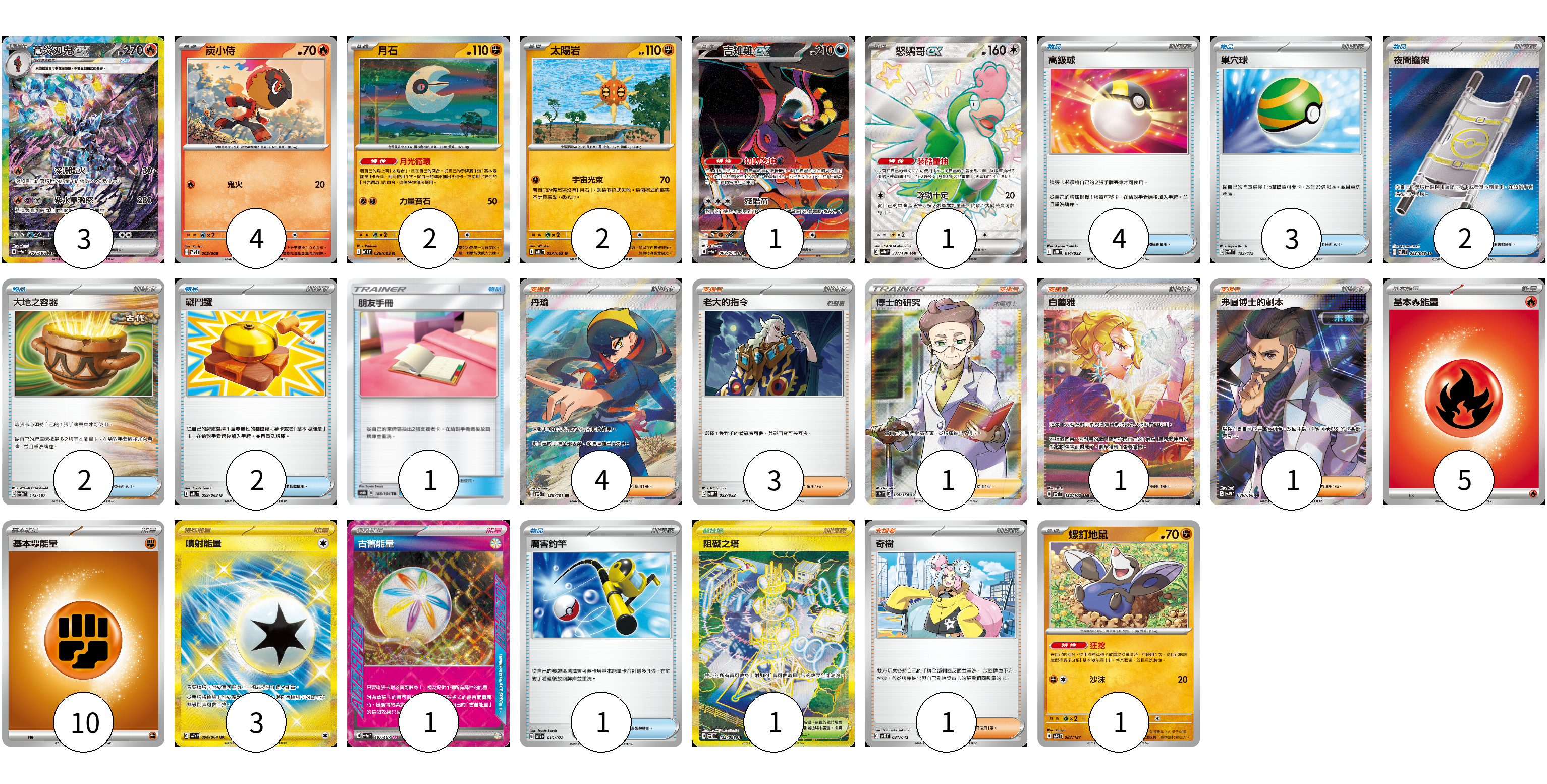 牌組構築方案 以此牌組為基礎新構築牌組 顯示卡面 顯示列表 寶可夢卡(14) 3 4 2 2 1 1 1 物品卡(15) 4 3 2 2 2 1 1 支援者卡(11) 4 3 1 1 1 1 競技場卡(1) 1 能量卡(19) 5 10 3 1 寶可夢卡(14) 卡牌名稱 張數 卡牌名稱 張數 蒼炎刃鬼ex SV8a 203/187 03 炭小侍 SVPS 005/008 04 月石 M1L 026/063 02 太陽岩 M1L 027/063 02 吉雉雞ex SV6a 089/064 01 怒鸚哥ex SV4a 337/190 01 螺釘地鼠 SV8a 083/187 01 物品卡(15) 卡牌名稱 張數 卡牌名稱 張數 高級球 MBD 014/022 04 巢穴球 SVM 133/175 03 夜間擔架 M1L 083/063 02 大地之容器 SV8a 143/187 02 戰鬥鑼 M1L 059/063 02 朋友手冊 AS6b 188/194 01 厲害釣竿 SVTS 010/022 01 支援者卡(11) 卡牌名稱 張數 卡牌名稱 張數 丹瑜 SV6 123/101 04 老大的指令 SVHM 022/022 03 博士的研究(木蘭博士) SC1a 168/154 01 白蕾雅 SV7 132/102 01 弗圖博士的劇本 SV4M 086/066 01 奇樹 SVK 031/042 01 競技場卡(1) 卡牌名稱 張數 卡牌名稱 張數 阻礙之塔 SV10 132/098 01 能量卡(19) 卡牌名稱 張數 卡牌名稱 張數 基本【火】能量 M-P FIR 05 基本【鬥】能量 M-P FIG 10 噴射能量 SV7a 094/064 03 古舊能量 SV8a 187/187 01 以此牌組為基礎新構築牌組 牌組編碼 MsRGiE-WsPEnP-FLaibr copy 列印牌組單 牌組編碼已複製 分享至SNS