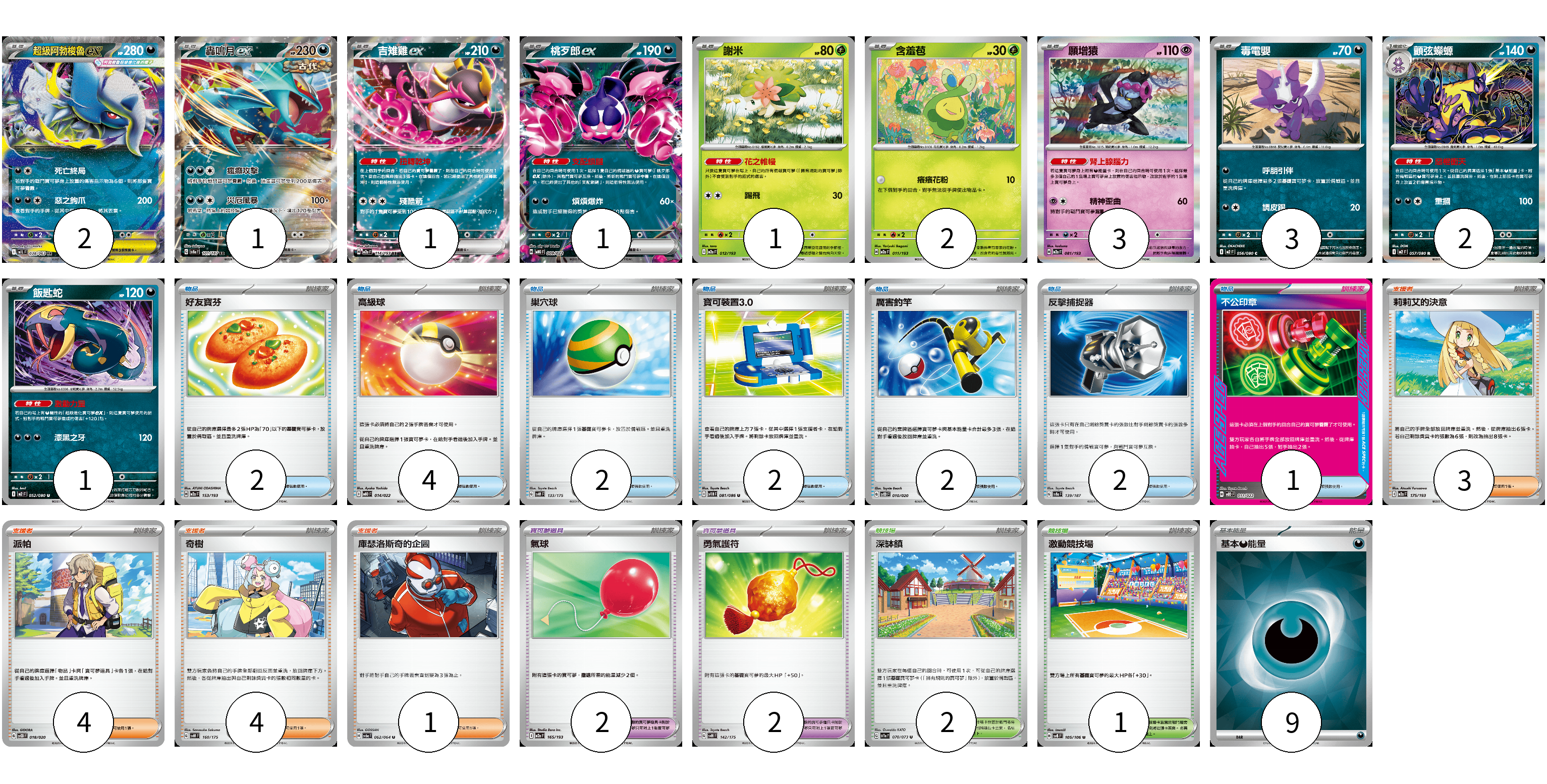 牌組構築方案 以此牌組為基礎新構築牌組 顯示卡面 顯示列表 寶可夢卡(17) 2 1 1 1 1 2 3 3 2 1 寶可夢道具(4) 2 2 物品卡(15) 2 4 2 2 2 2 1 支援者卡(12) 3 4 4 1 競技場卡(3) 2 1 能量卡(9) 9 寶可夢卡(17) 卡牌名稱 張數 卡牌名稱 張數 超級阿勃梭魯ex M1L 038/063 02 轟鳴月ex SV8a 101/187 01 吉雉雞ex M2a 114/193 01 桃歹郎ex MBG 009/022 01 謝米 M2a 012/193 01 含羞苞 M2a 011/193 02 願增猿 M2a 081/193 03 毒電嬰 M2 056/080 03 顫弦蠑螈 M2 057/080 02 飯匙蛇 M2 052/080 01 寶可夢道具(4) 卡牌名稱 張數 卡牌名稱 張數 氣球 M2a 165/193 02 勇氣護符 SVM 142/175 02 物品卡(15) 卡牌名稱 張數 卡牌名稱 張數 好友寶芬 M2a 153/193 02 高級球 MBD 014/022 04 巢穴球 SVM 133/175 02 寶可裝置3.0 SV11B 081/086 02 厲害釣竿 SVOD 010/020 02 反擊捕捉器 SV8a 139/187 02 不公印章 MBD 011/022 01 支援者卡(12) 卡牌名稱 張數 卡牌名稱 張數 莉莉艾的決意 M2a 175/193 03 派帕 SVOD 018/020 04 奇樹 SVM 160/175 04 庫瑟洛斯奇的企圖 SV6a 062/064 01 競技場卡(3) 卡牌名稱 張數 卡牌名稱 張數 深缽鎮 SV1a 070/073 02 激動競技場 SV8 105/106 01 能量卡(9) 卡牌名稱 張數 卡牌名稱 張數 基本【惡】能量 SVK DAR 09 以此牌組為基礎新構築牌組 牌組編碼 MsxUPc-bFQcEU-qoqLcU copy 列印牌組單 牌組編碼已複製 分享至SNS